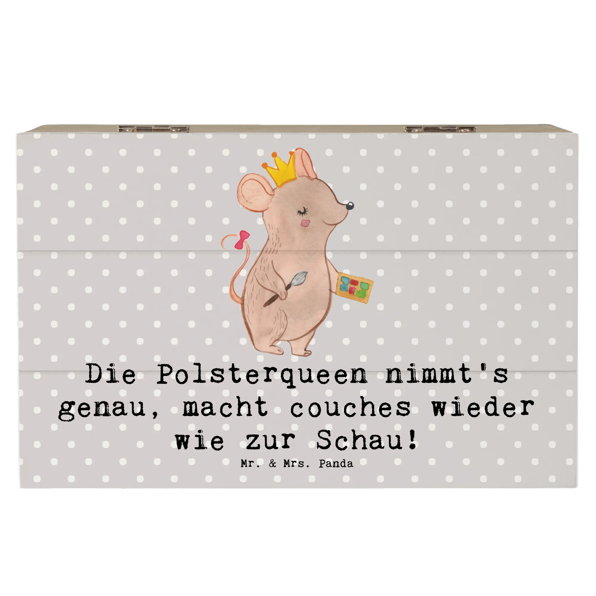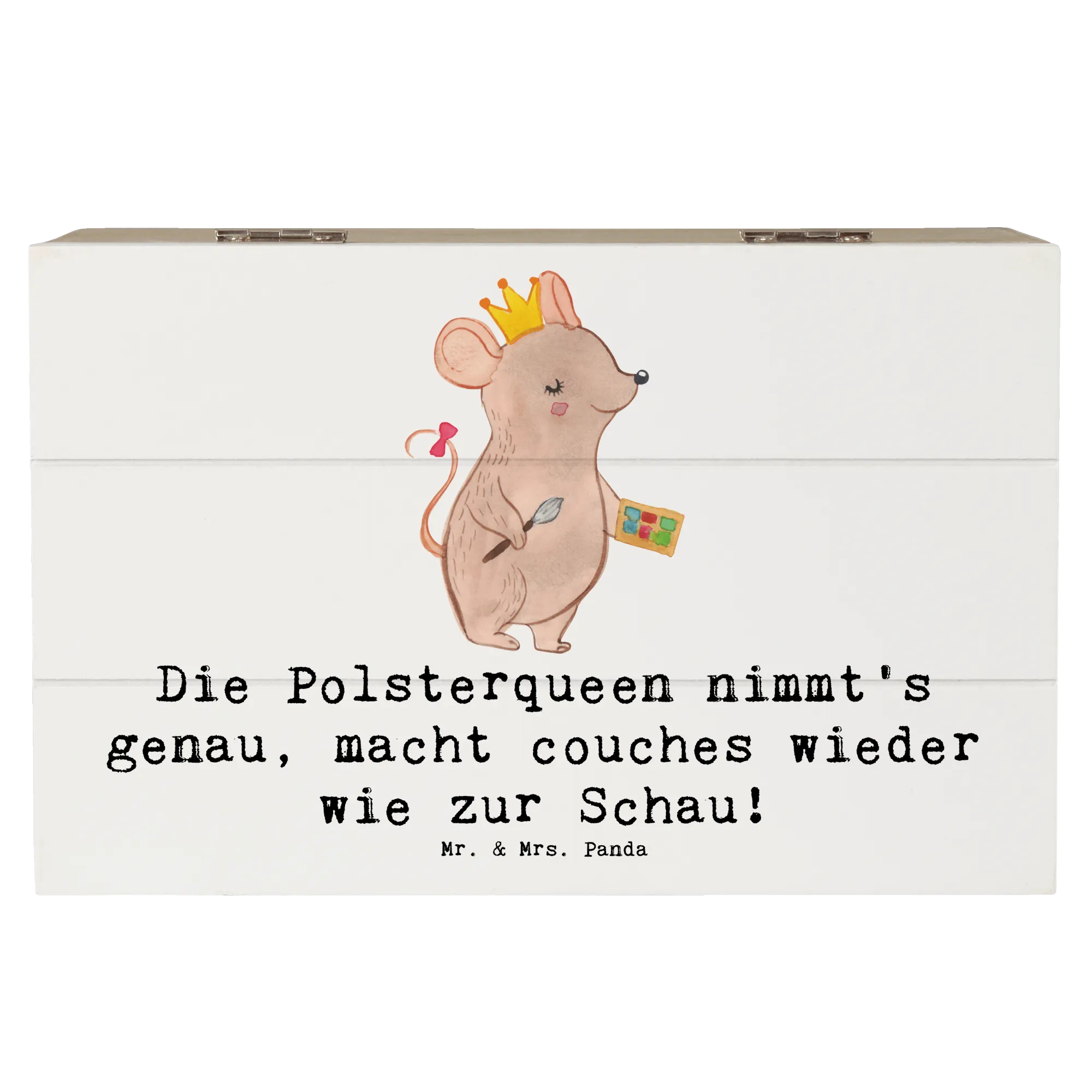 Stell dir vor, du suchst nach einem perfekten Geschenk für deine Freundin, die als Polsterin arbeitet. Die liebevoll gestaltete Holzkiste von Mr. & Mrs. Panda mit dem Slogan "Die Polsterqueen nimmt's genau, macht couches wieder wie zur Schau!" ist die ideale Wahl!