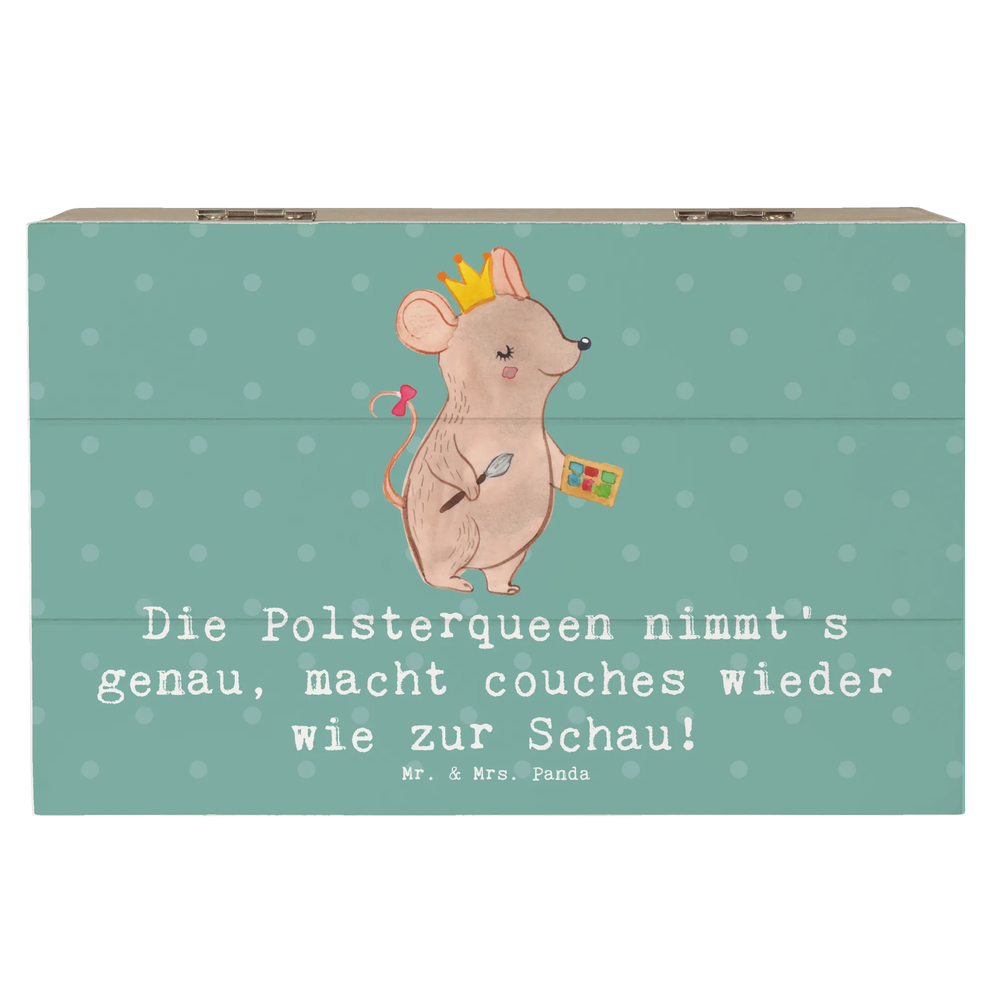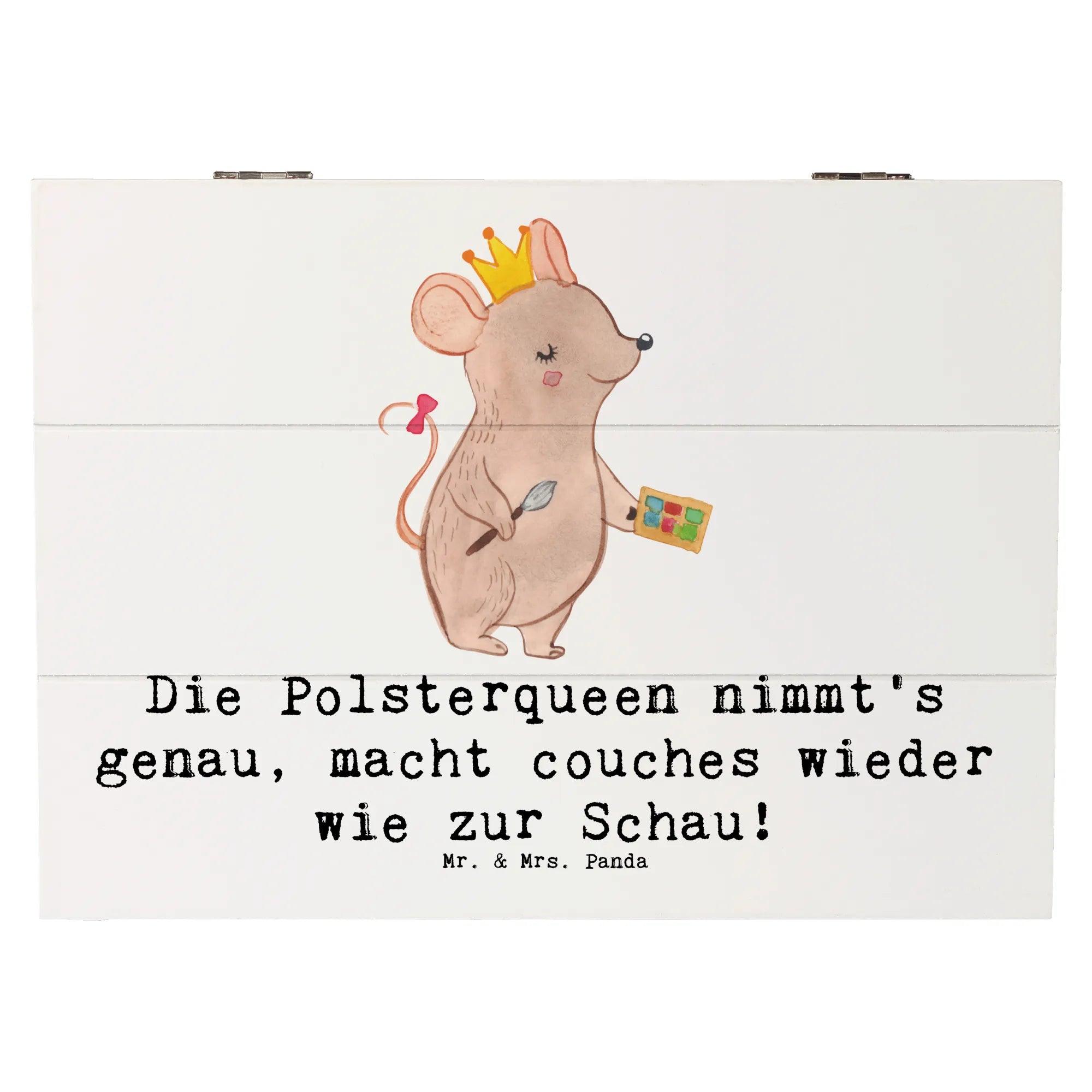 Die Holzkiste Polsterin von Mr. & Mrs. Panda ist das perfekte Geschenk für alle, die sich für die Kunst des Polsterns begeistern. Diese wunderschöne Kiste verbindet Funktionalität mit einem charmanten Design. Sie erfüllt nicht nur die Aufgabe, wundervolle Schätze, Erinnerungen und Erinnerungsstücke stilvoll aufzubewahren, sondern bringt auch einen Hauch von Freude in jedes Zuhause. Mit einem liebevoll gestalteten Motiv, das die Kunstfertigkeit von Polsterinnen feiert, ist diese Holzkiste ideal für Anlässe wie Geburtstage, Abschiede in den Ruhestand oder einfach nur, um einem Menschen eine Freude zu machen.