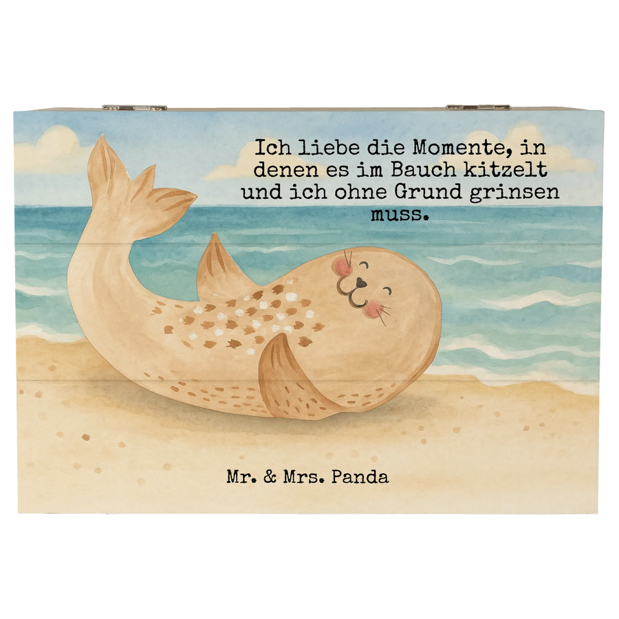 Unsere bezaubernde Holzkiste aus der Small World Kollektion von Mr. & Mrs. Panda bringt das Meer direkt zu dir nach Hause. Die liegende Robbe mit dem liebevollen Spruch „Ich liebe die Momente, in denen es im Bauch kitzelt und ich ohne Grund grinsen muss.“ macht die Kiste zur perfekten Geschenkbox für Strandfreunde und Meerestiere-Fans. 🦭