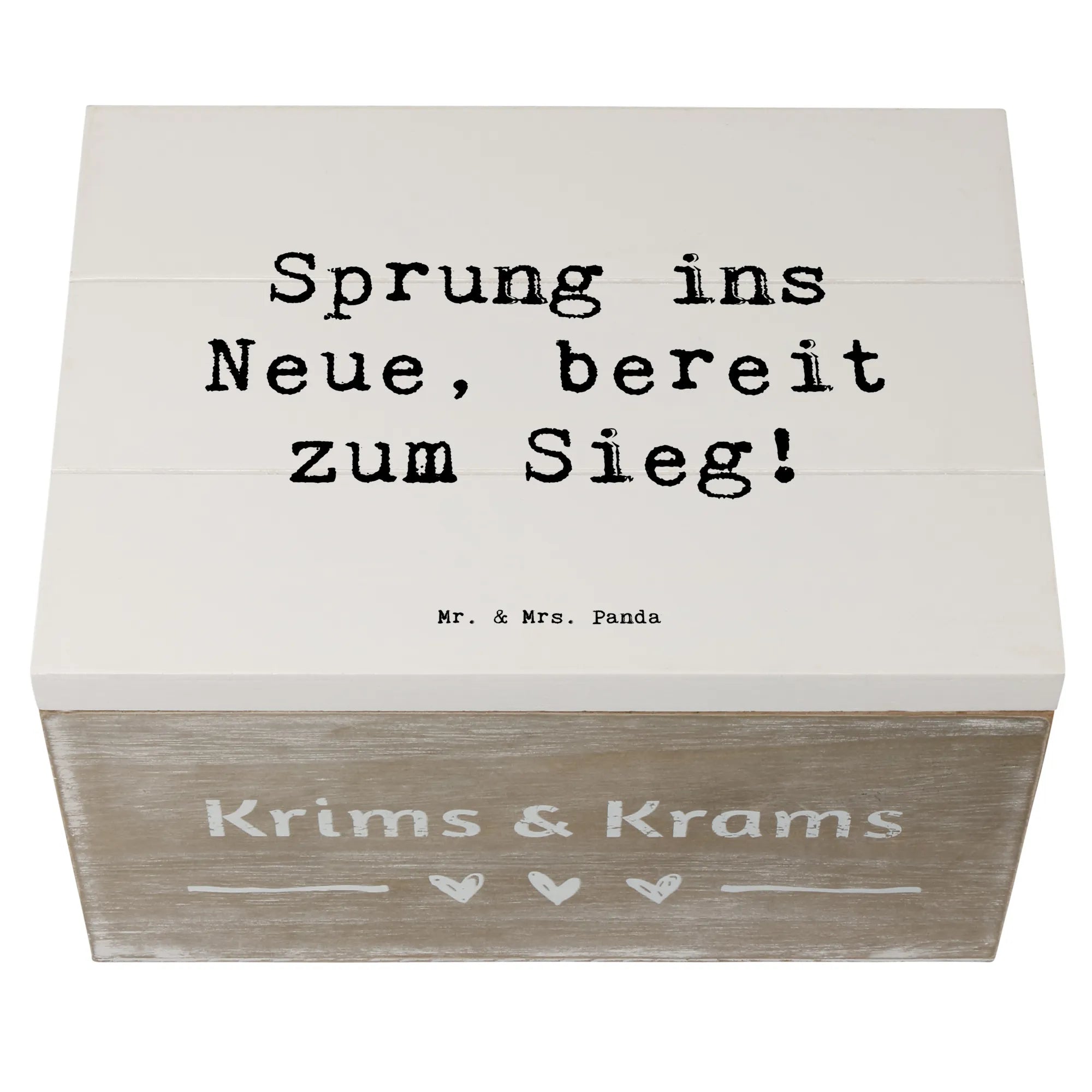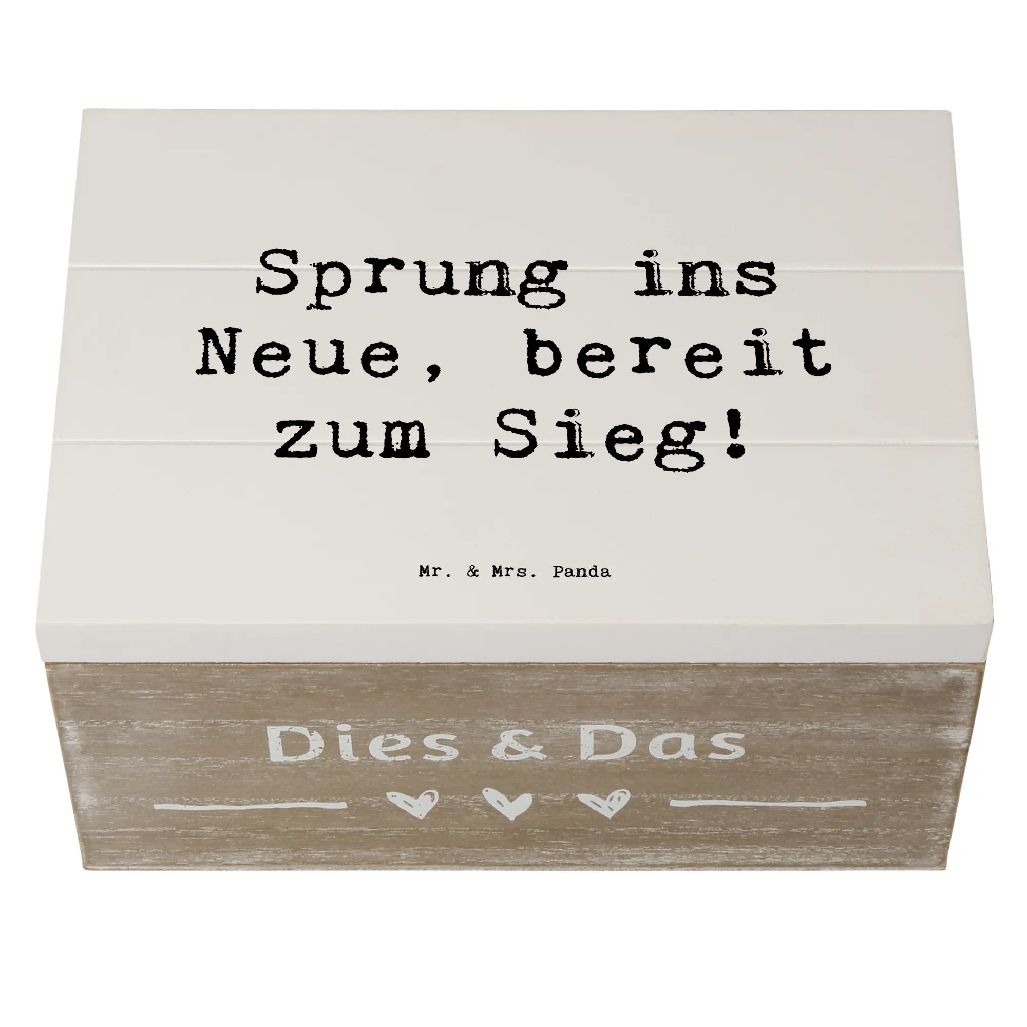 Die Aussage 'Sprung ins Neue, bereit zum Sieg!' auf der Kiste motiviert und erinnert uns daran, dass es wichtig ist, neue Wege zu gehen und geduldig mit uns selbst zu sein.