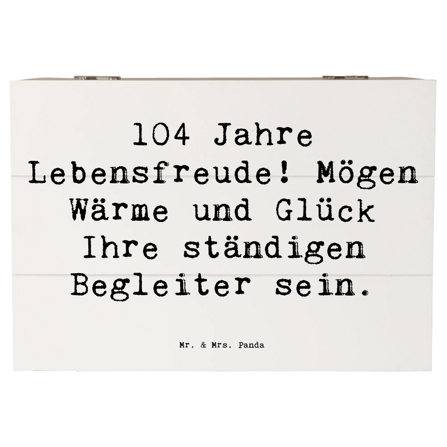 Die wundervolle Holzkiste von Mr. & Mrs. Panda ist das perfekte Geschenk zum 104. Geburtstag! Mit dem Spruch '104 Jahre Lebensfreude! Mögen Wärme und Glück Ihre ständigen Begleiter sein.' ist diese Kiste ein liebevolles Andenken für besondere Anlässe.