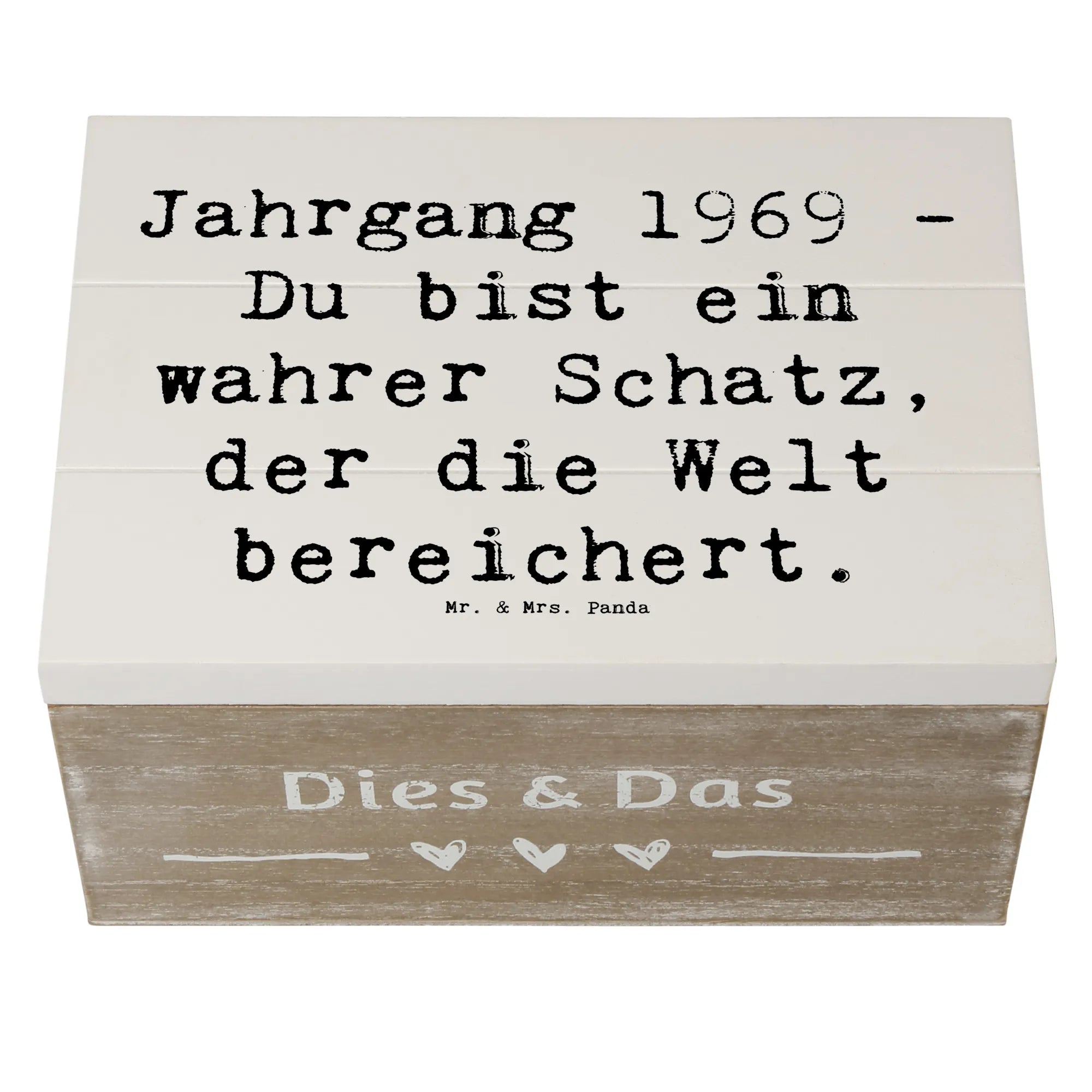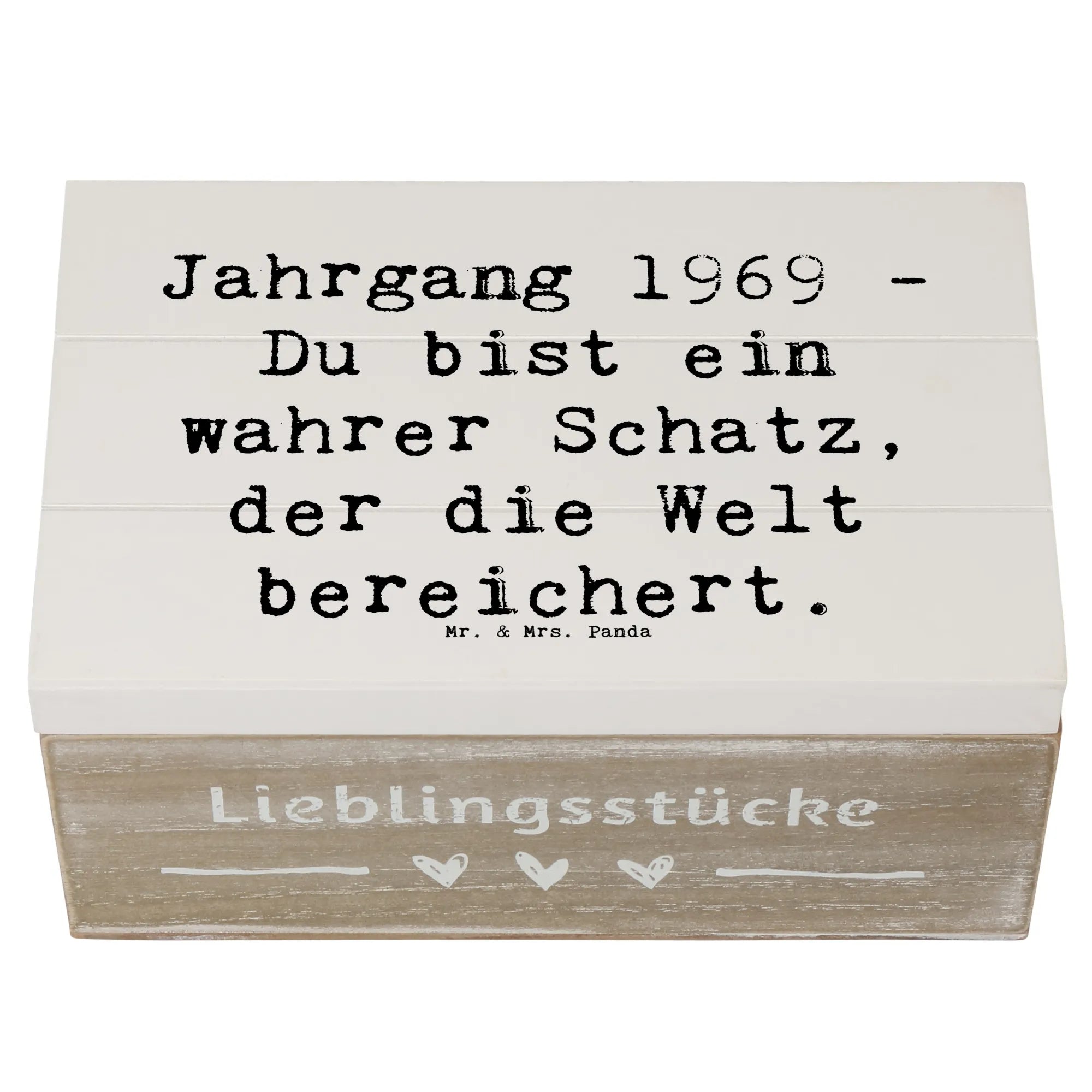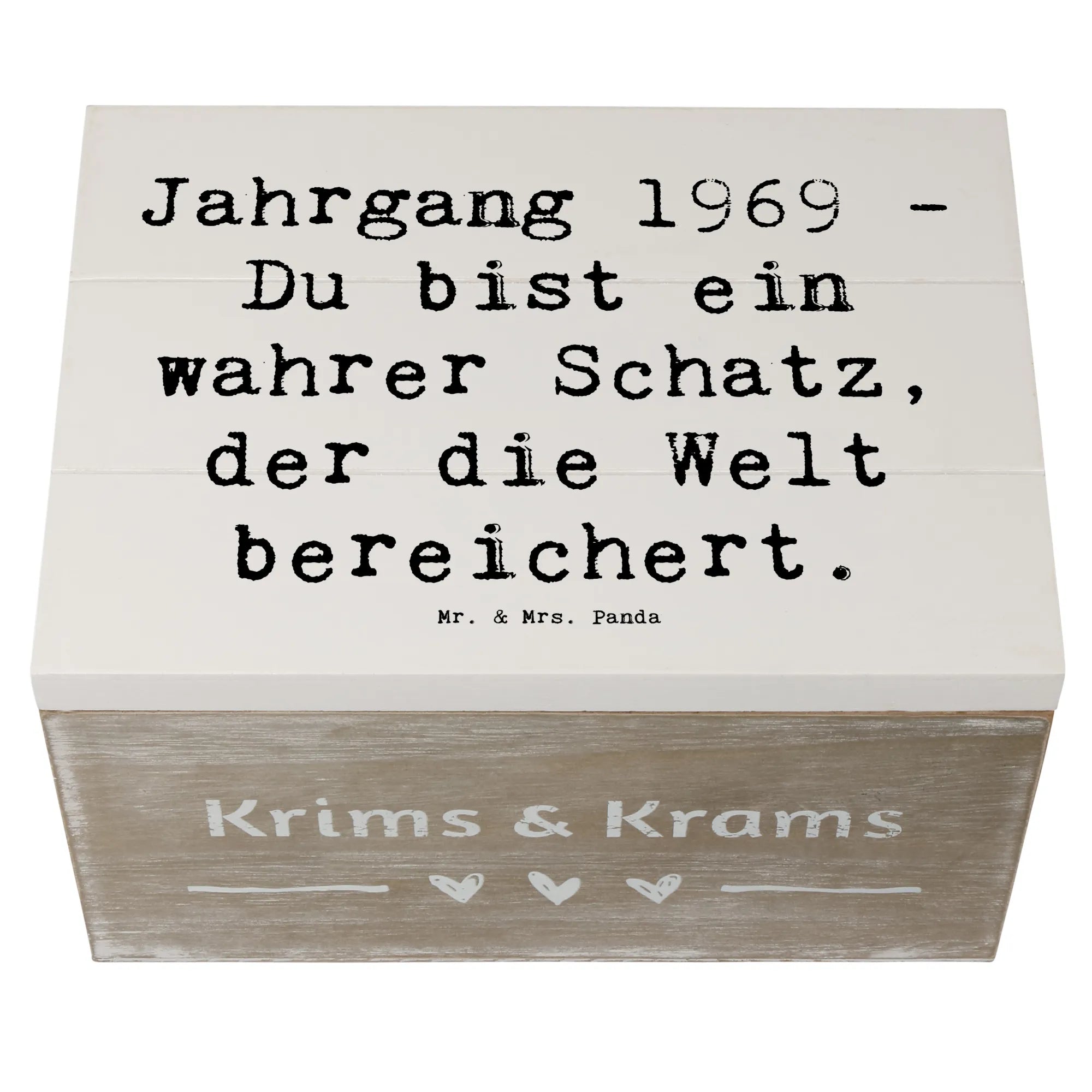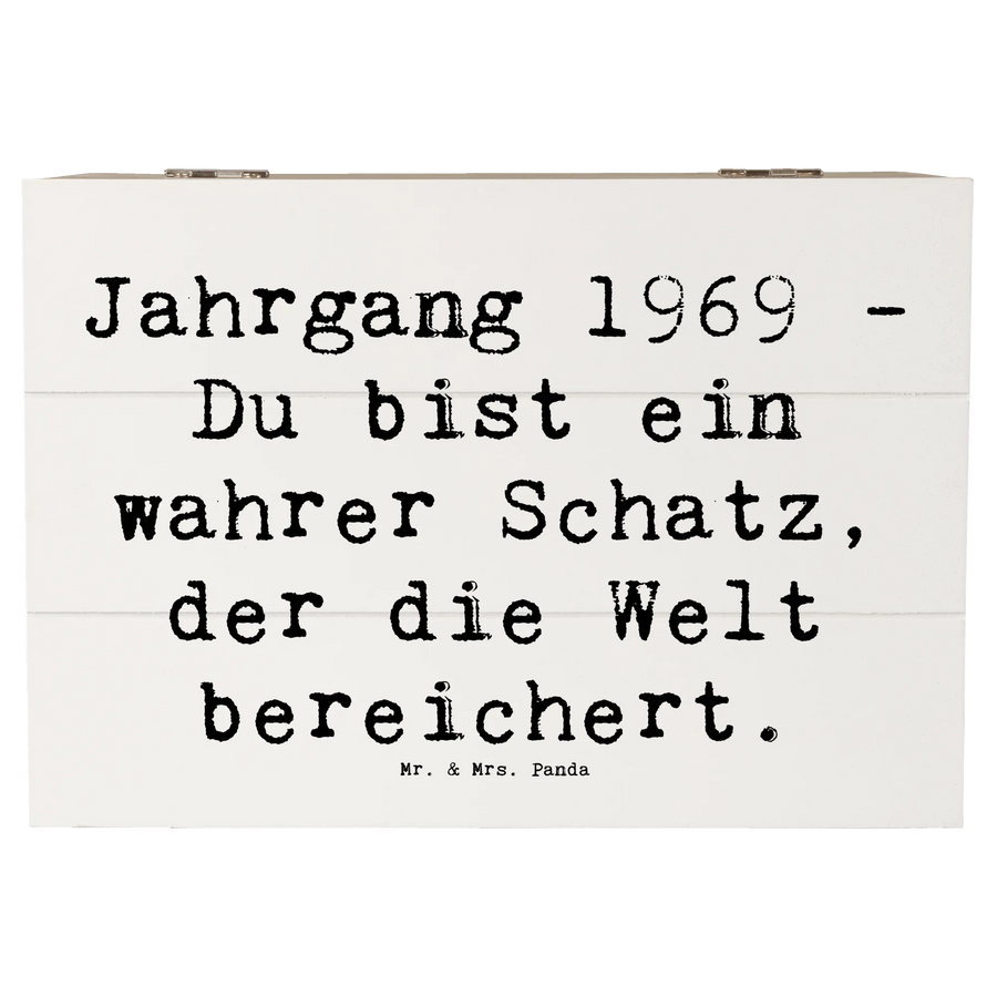Die wunderschöne Holzkiste von Mr. & Mrs. Panda ist der perfekte Begleiter für alle, die im Jahr 1969 das Licht der Welt erblickt haben. Mit dem liebevollen Slogan 'Jahrgang 1969 - Du bist ein wahrer Schatz, der die Welt bereichert.' wird diese Holzkiste zu einem unvergesslichen Geschenk, das gleichermaßen als Erinnerungsbox, Dekokiste und Aufbewahrungsbox dient.