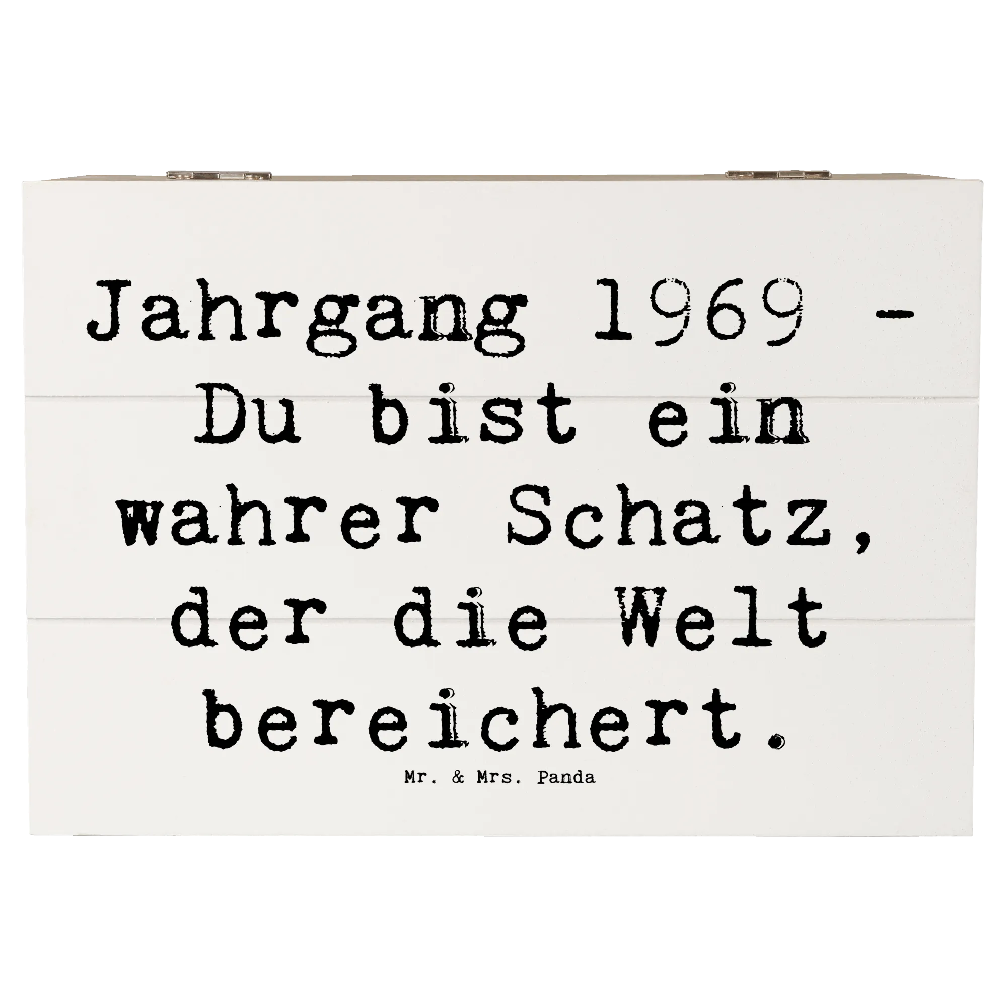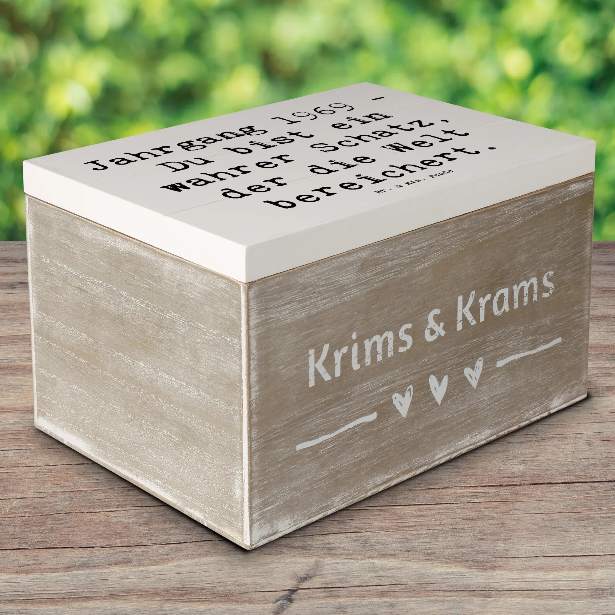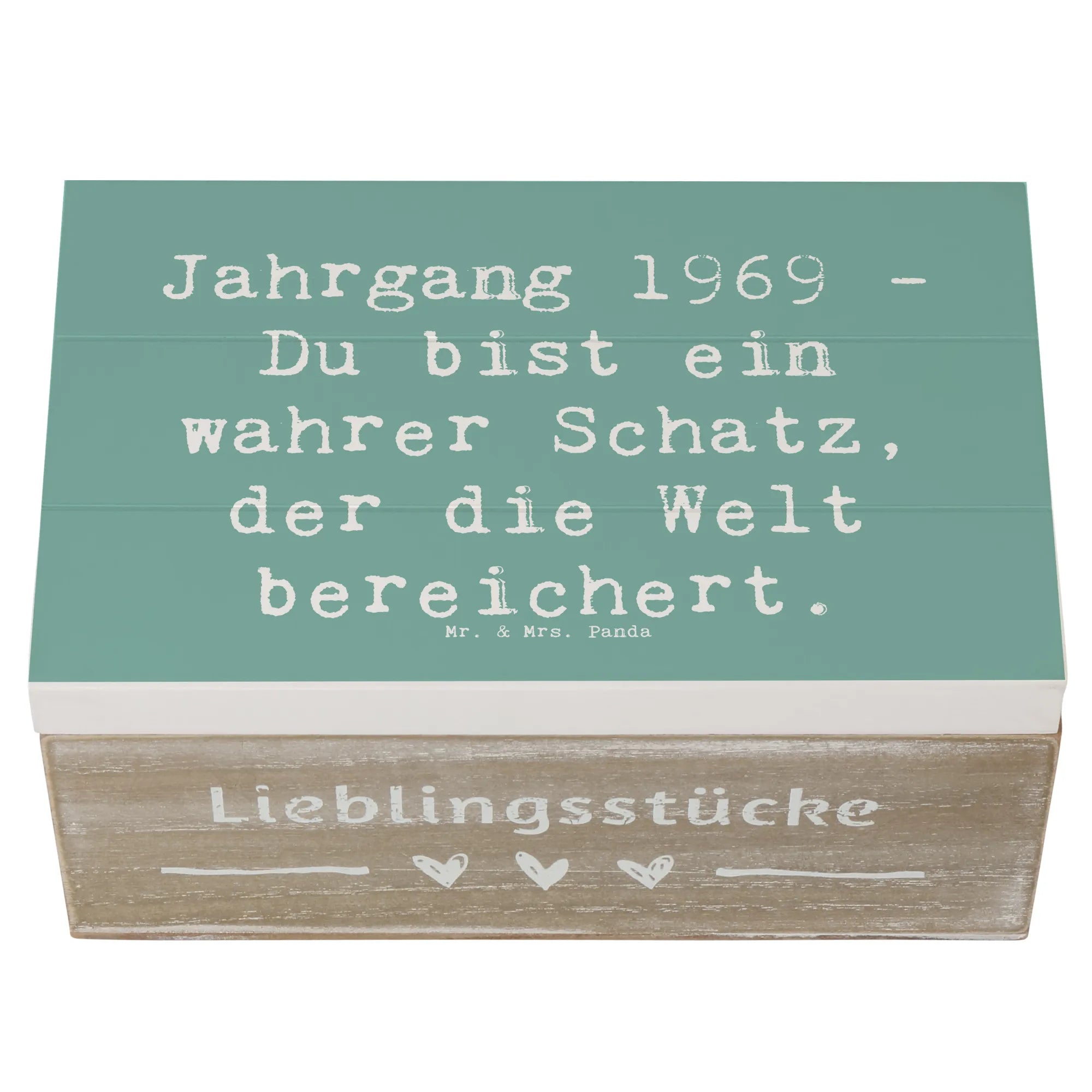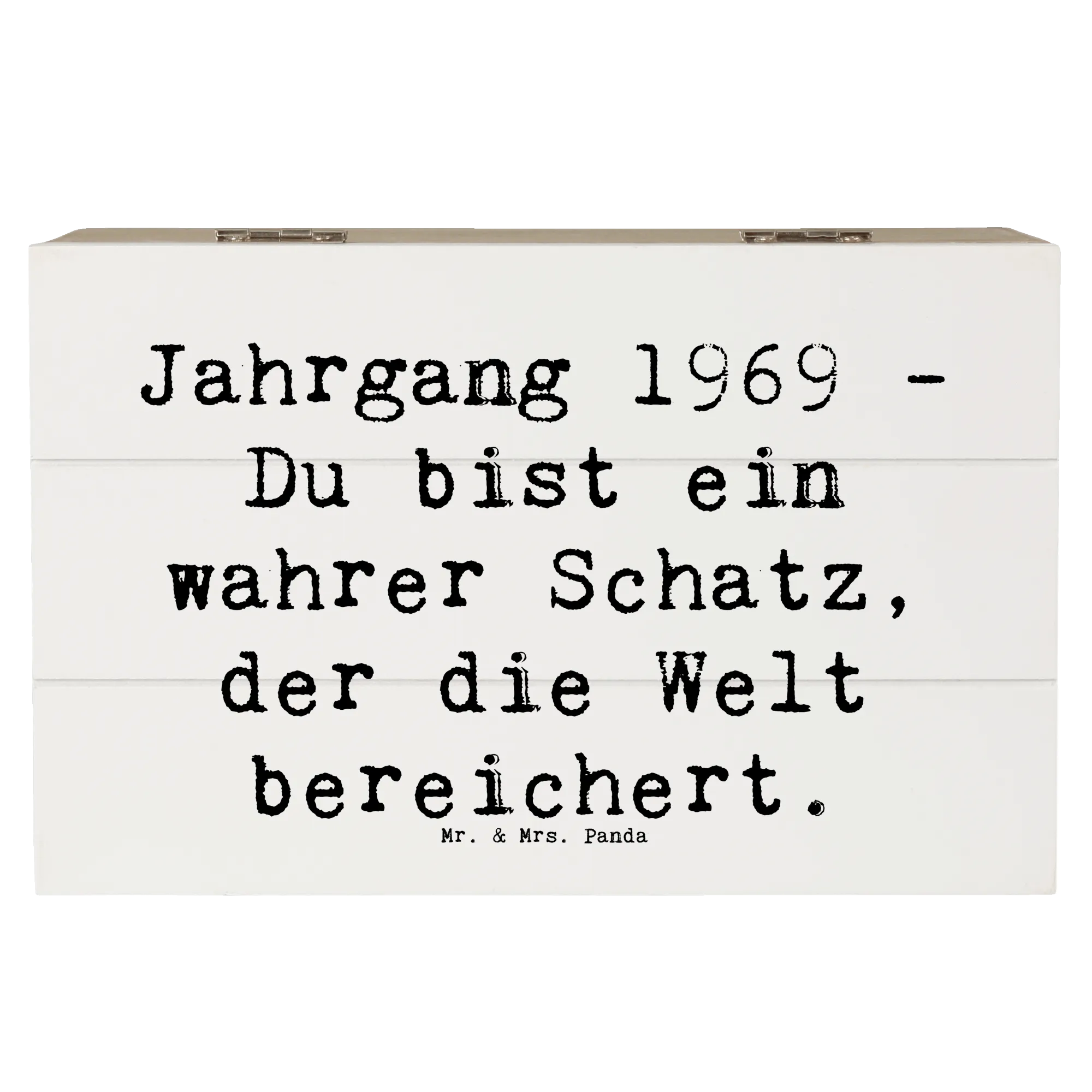 Die wunderschöne Holzkiste von Mr. & Mrs. Panda ist der perfekte Begleiter für alle, die im Jahr 1969 das Licht der Welt erblickt haben. Mit dem liebevollen Slogan 'Jahrgang 1969 - Du bist ein wahrer Schatz, der die Welt bereichert.' wird diese Holzkiste zu einem unvergesslichen Geschenk, das gleichermaßen als Erinnerungsbox, Dekokiste und Aufbewahrungsbox dient.