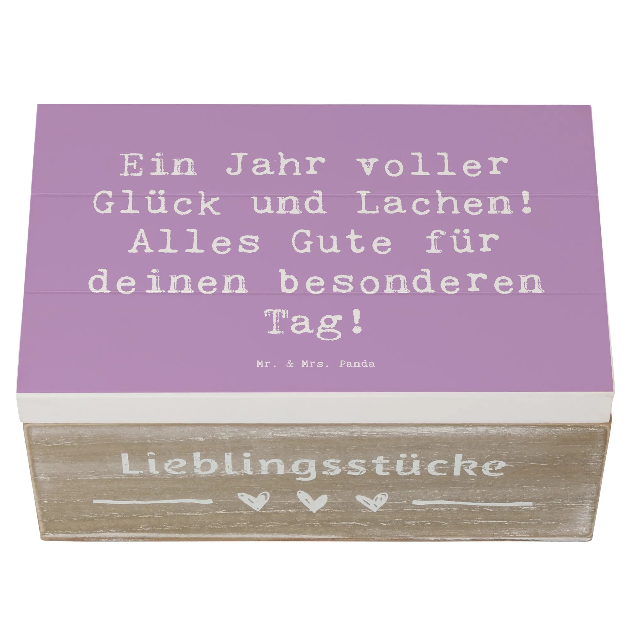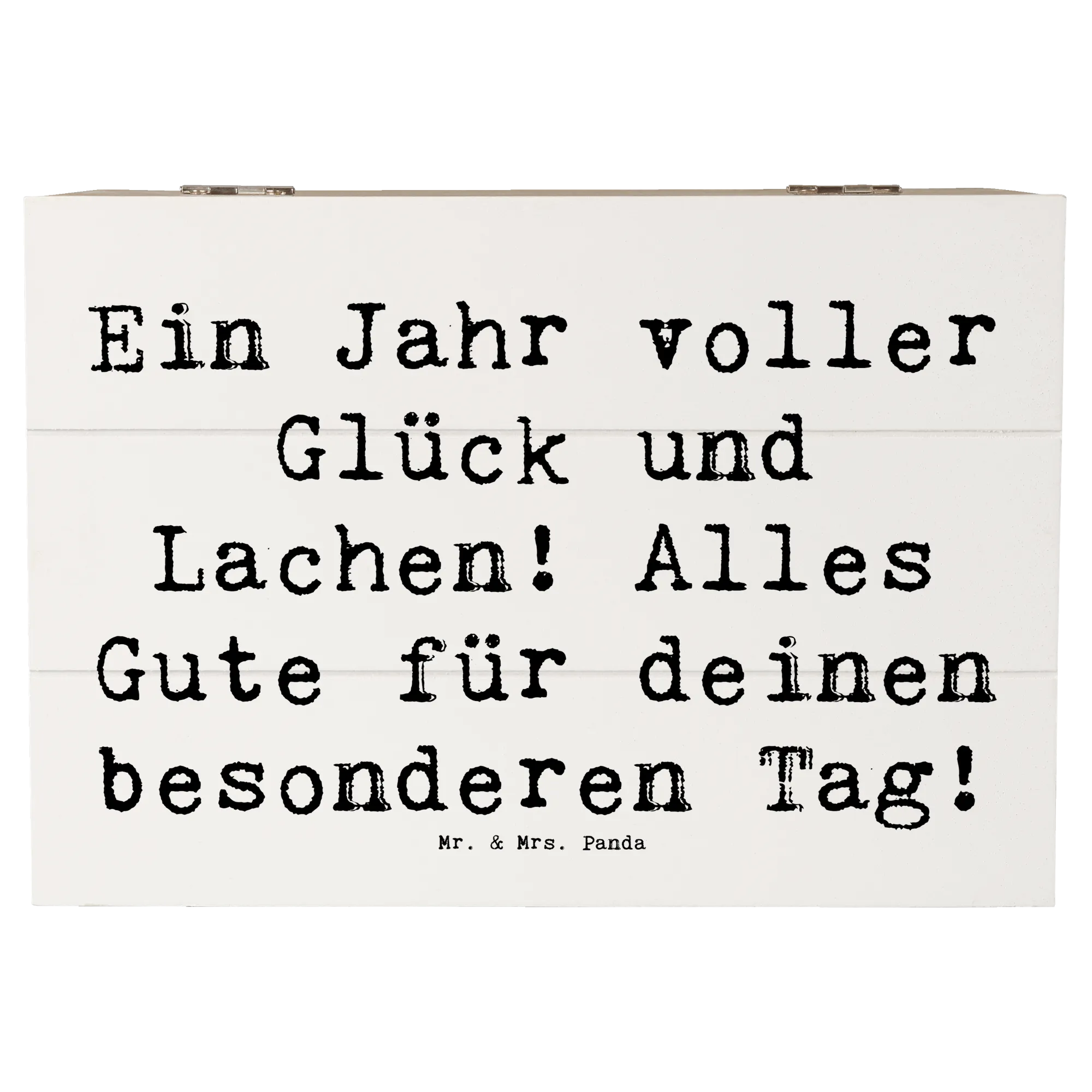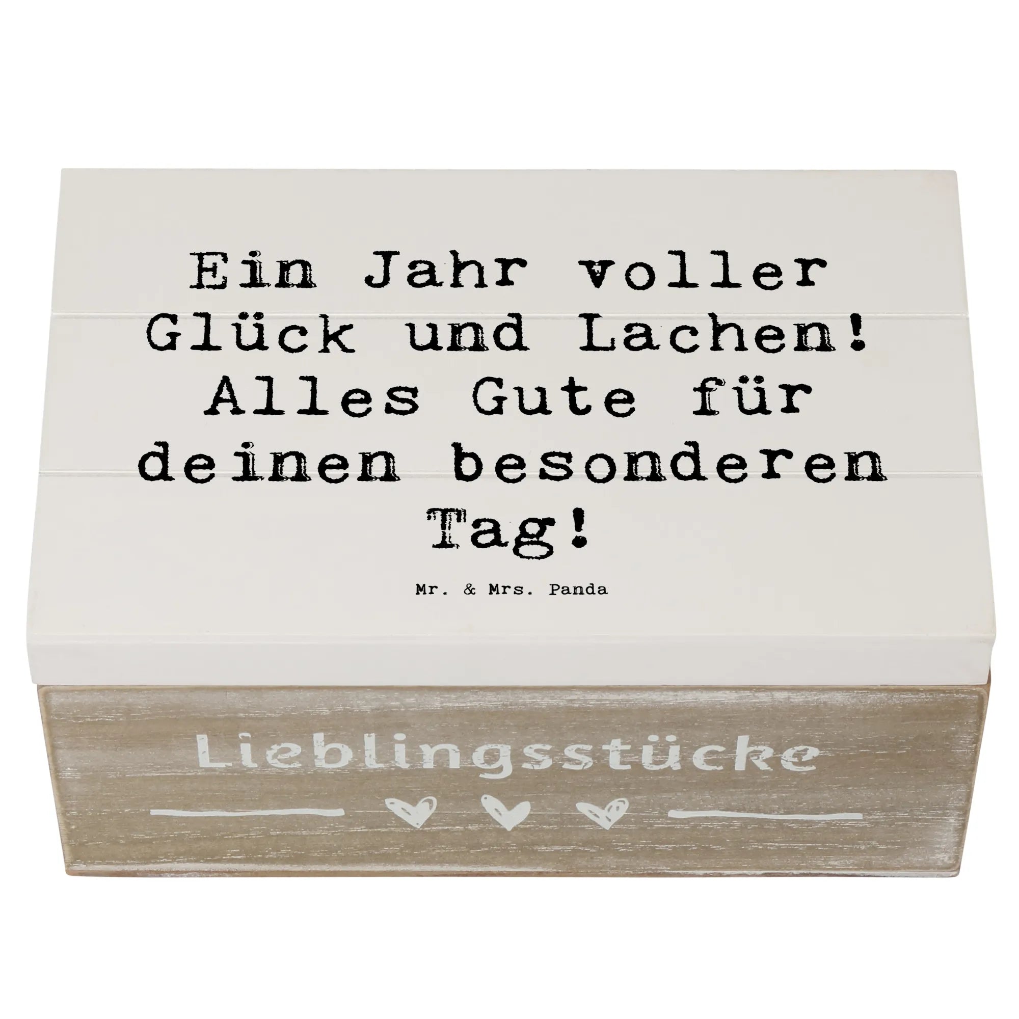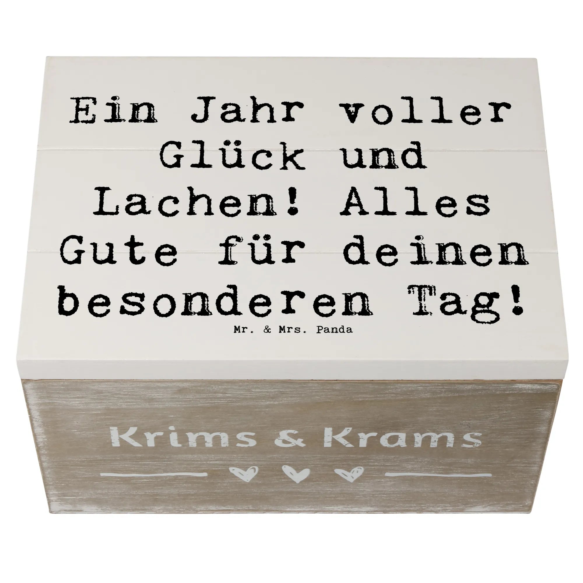 Die eingearbeiteten Einschlagscharniere sorgen dafür, dass du die Truhe jederzeit leicht öffnen und schließen kannst. Mit dem fröhlichen Spruch 'Ein Jahr voller Glück und Lachen! Alles Gute für deinen besonderen Tag!' versprüht die Kiste pure Lebensfreude und Glück. Sie ist nicht personalisierbar, aber das macht sie umso besser als durchdachtes Geschenk.