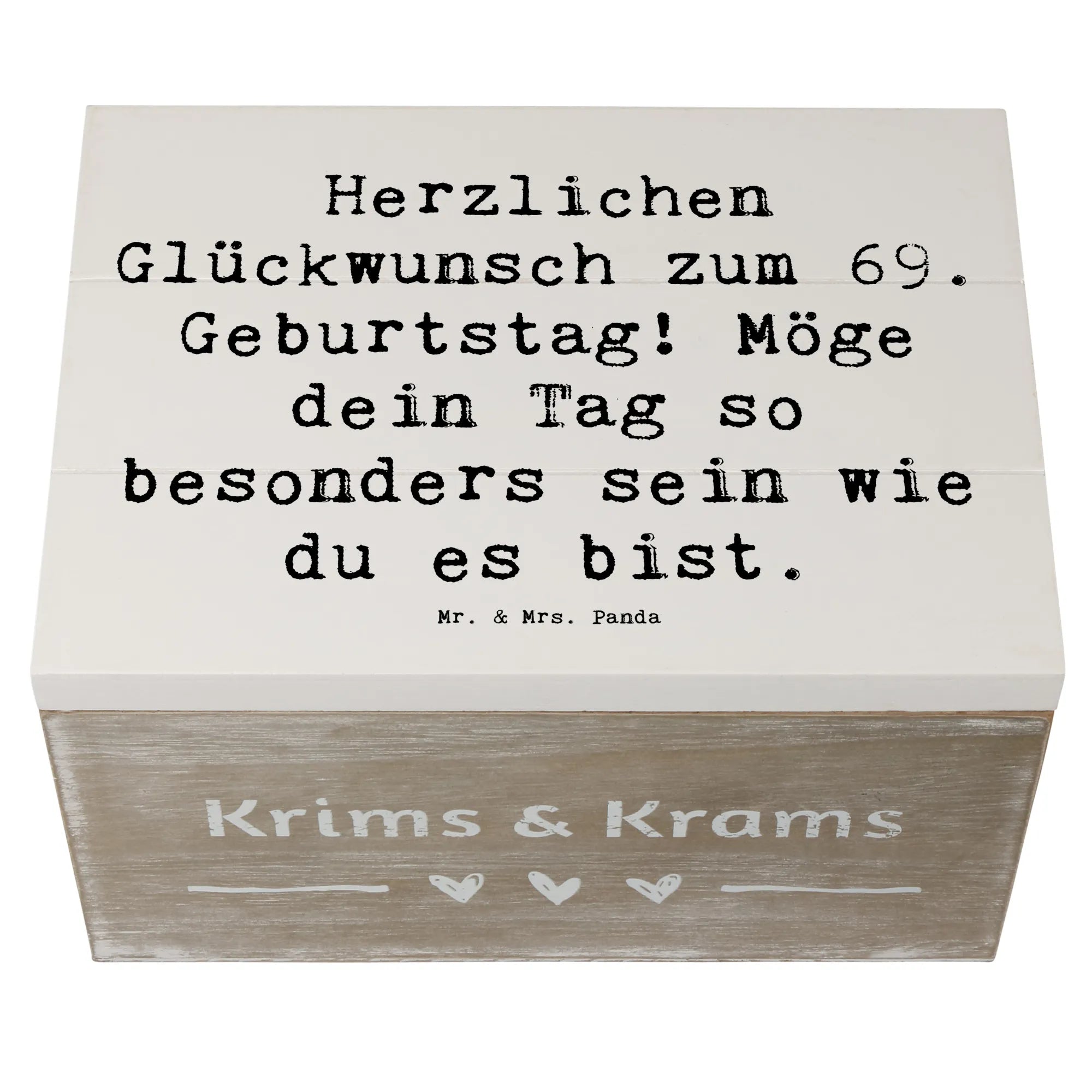 Die wunderschöne Holzkiste zum 69. Geburtstag von Mr. & Mrs. Panda ist das perfekte Geschenk, um diesem besonderen Tag einen unvergesslichen Touch zu verleihen. Mit dem liebevollen Spruch "Herzlichen Glückwunsch zum 69. Geburtstag! Möge dein Tag so besonders sein wie du es bist.", ist diese Kiste nicht nur ein toller Blickfang, sondern auch eine wunderschöne Aufbewahrung für kostbare Erinnerungen.