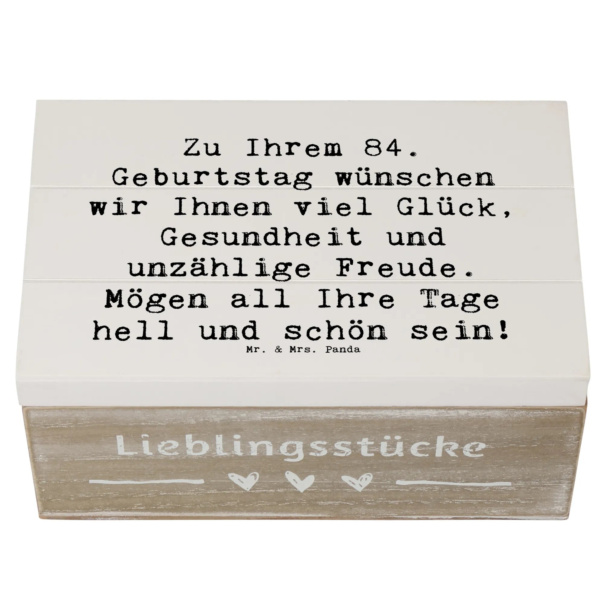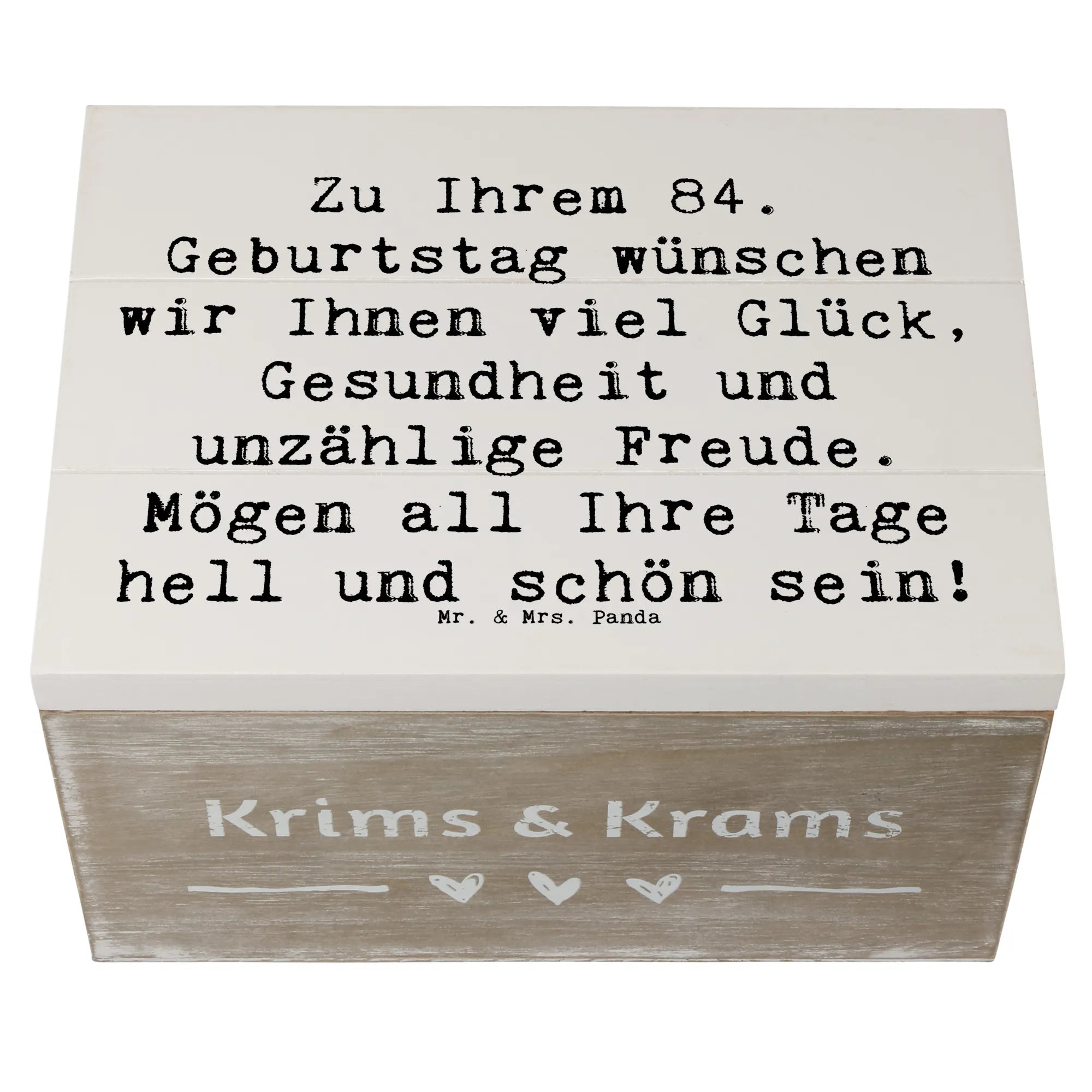 Mit dem liebevollen Spruch "Zu Ihrem 84. Geburtstag wünschen wir Ihnen viel Glück, Gesundheit und unzählige Freude. Mögen all Ihre Tage hell und schön sein!" auf der Truhe wird jede feierliche Gelegenheit auf wundervolle Weise gewürdigt.