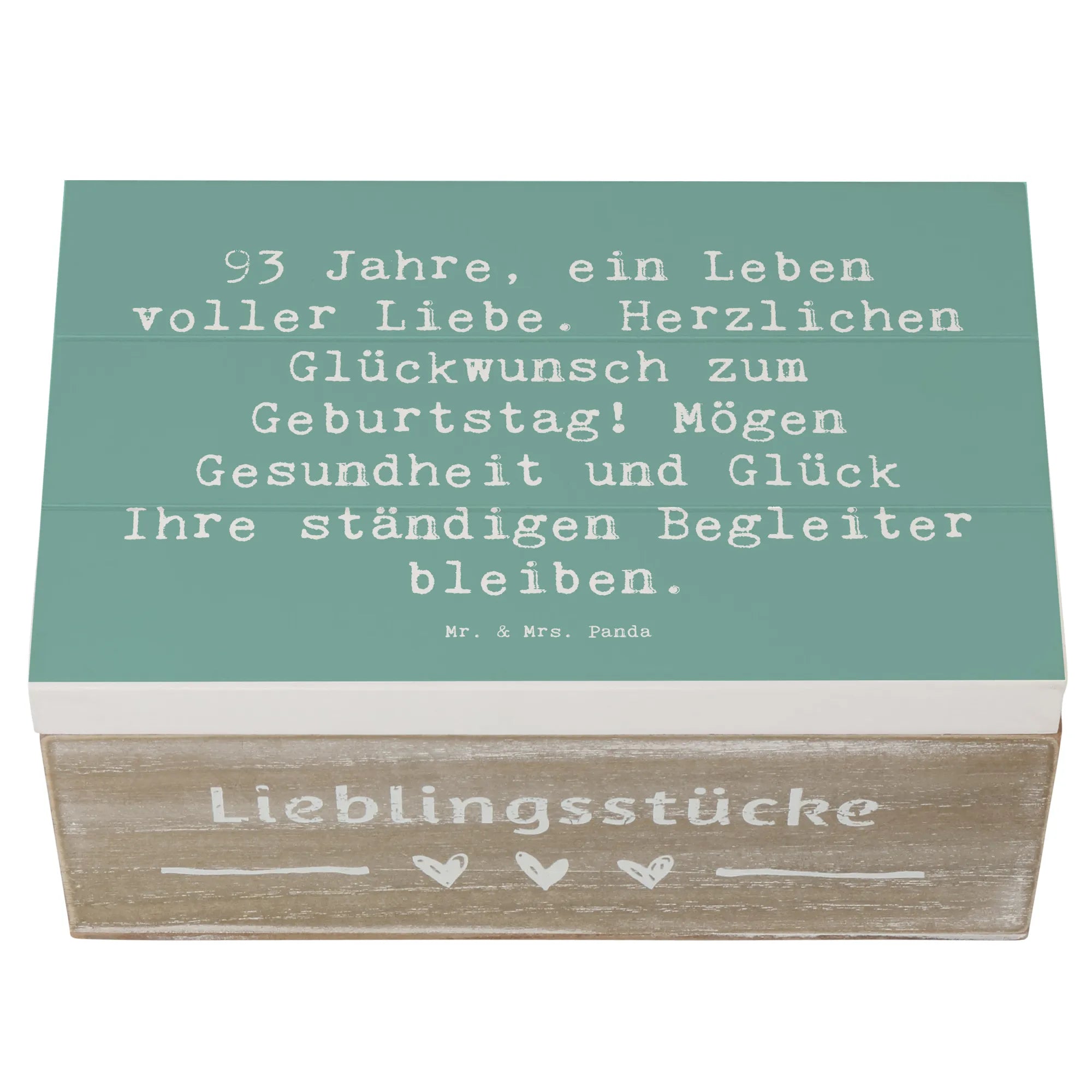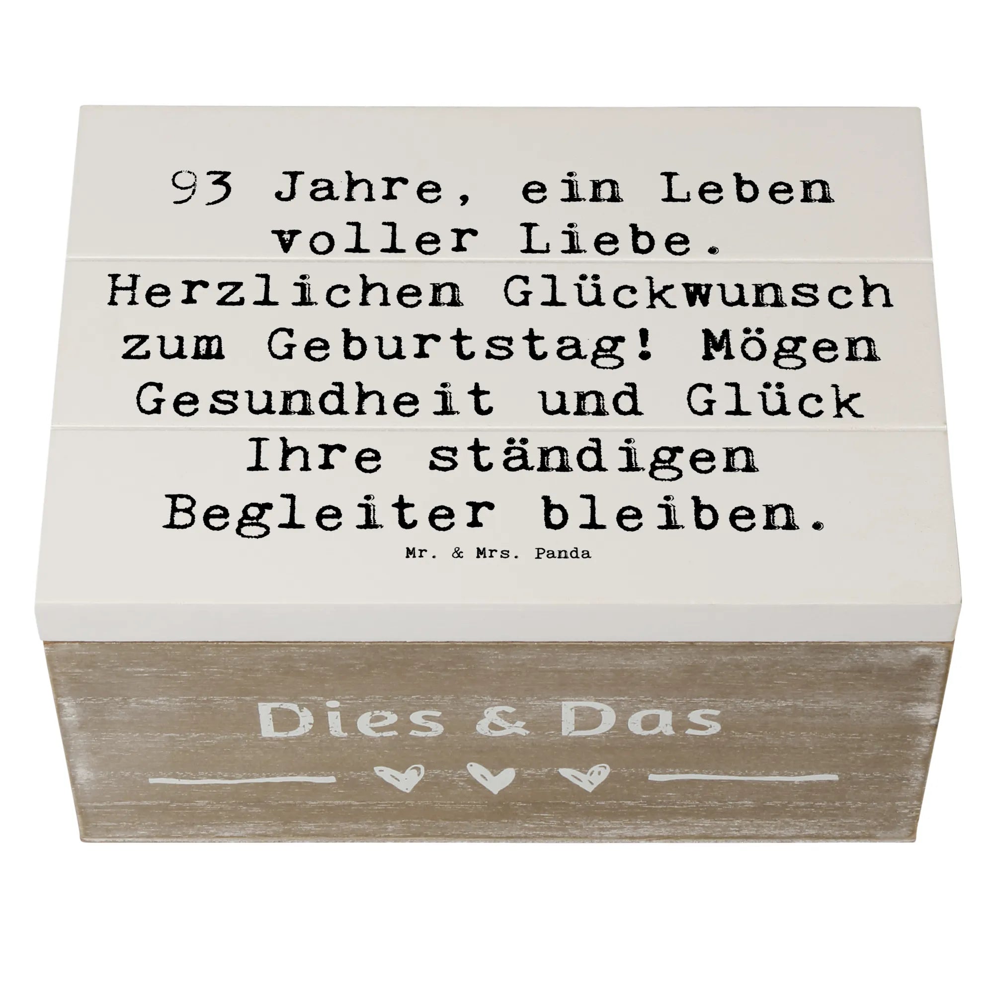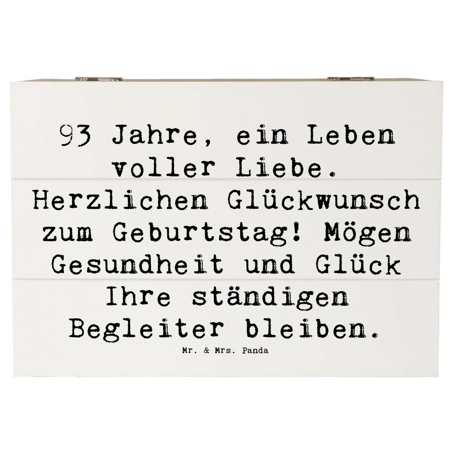 Die wunderschöne Holzkiste von Mr. & Mrs. Panda mit dem Motiv zum 93. Geburtstag ist das ideale Geschenk, um diesen besonderen Tag gebührend zu feiern! Mit dem liebevollen Spruch '93 Jahre, ein Leben voller Liebe. Herzlichen Glückwunsch zum Geburtstag! Mögen Gesundheit und Glück Ihre ständigen Begleiter bleiben.' bringt diese Erinnerungskiste nicht nur ein Lächeln ins Gesicht, sondern hält auch die wertvollsten Schätze und Erinnerungen der letzten 93 Jahre sicher aufbewahrt.