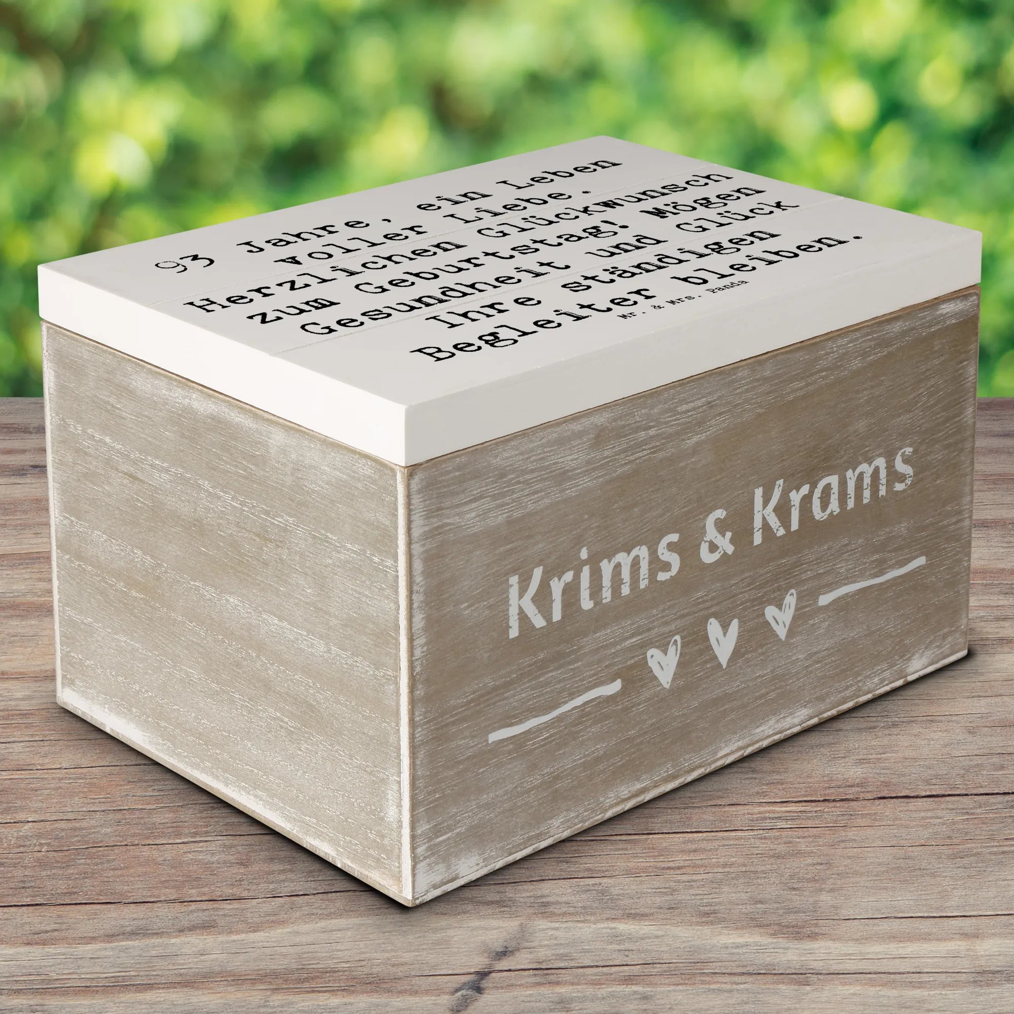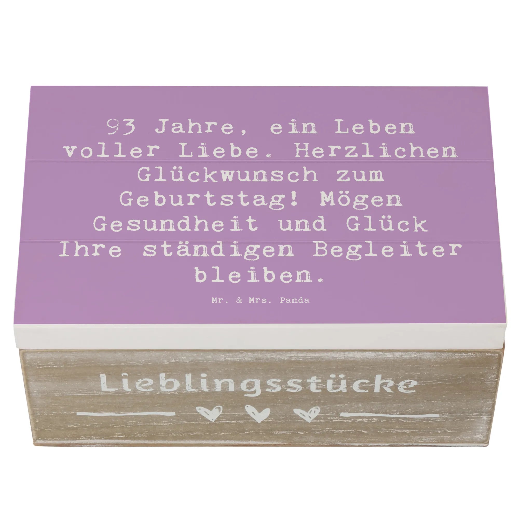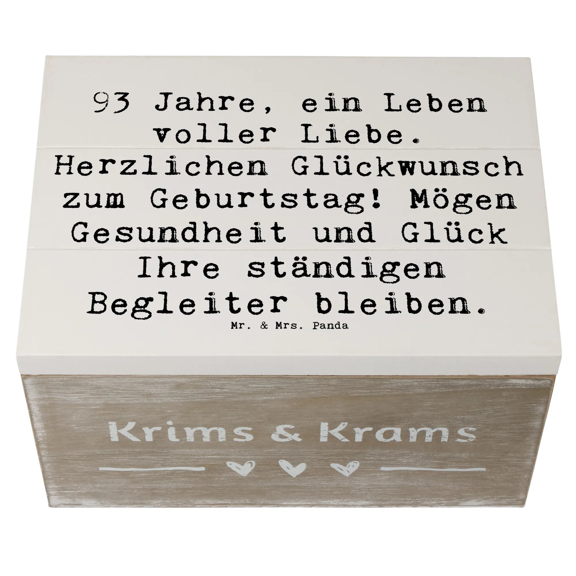 Das Design präsentiert einen herzlichen Spruch: '93 Jahre, ein Leben voller Liebe. Herzlichen Glückwunsch zum Geburtstag! Mögen Gesundheit und Glück Ihre ständigen Begleiter bleiben.' Dieser liebevolle Text macht die Kiste zum perfekten Geschenk für jemand, der diesen wundervollen Anlass feiert.