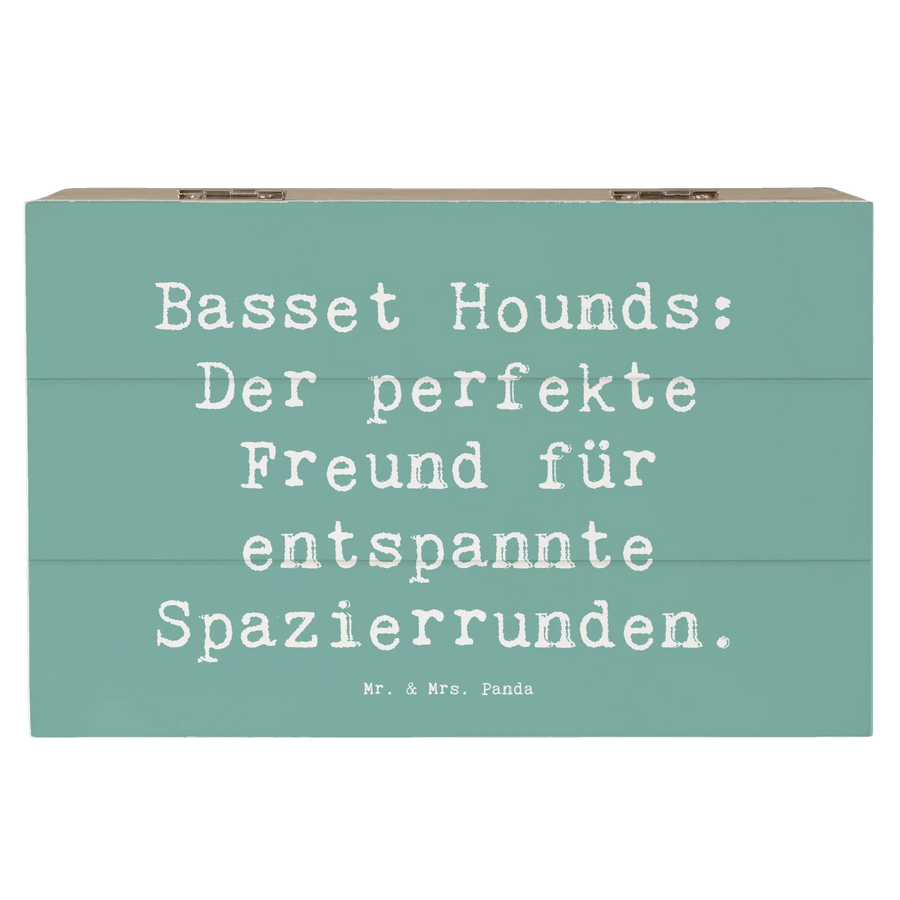 Der Spruch "Basset Hounds: Der perfekte Freund für entspannte Spazierrunden" rundet das Gesamtbild ab und macht die Kiste zu einem ganz besonderen Geschenk zu Anlässen wie Kommunion, Konfirmation oder einfach als niedliches Geschenk für zwischendurch.