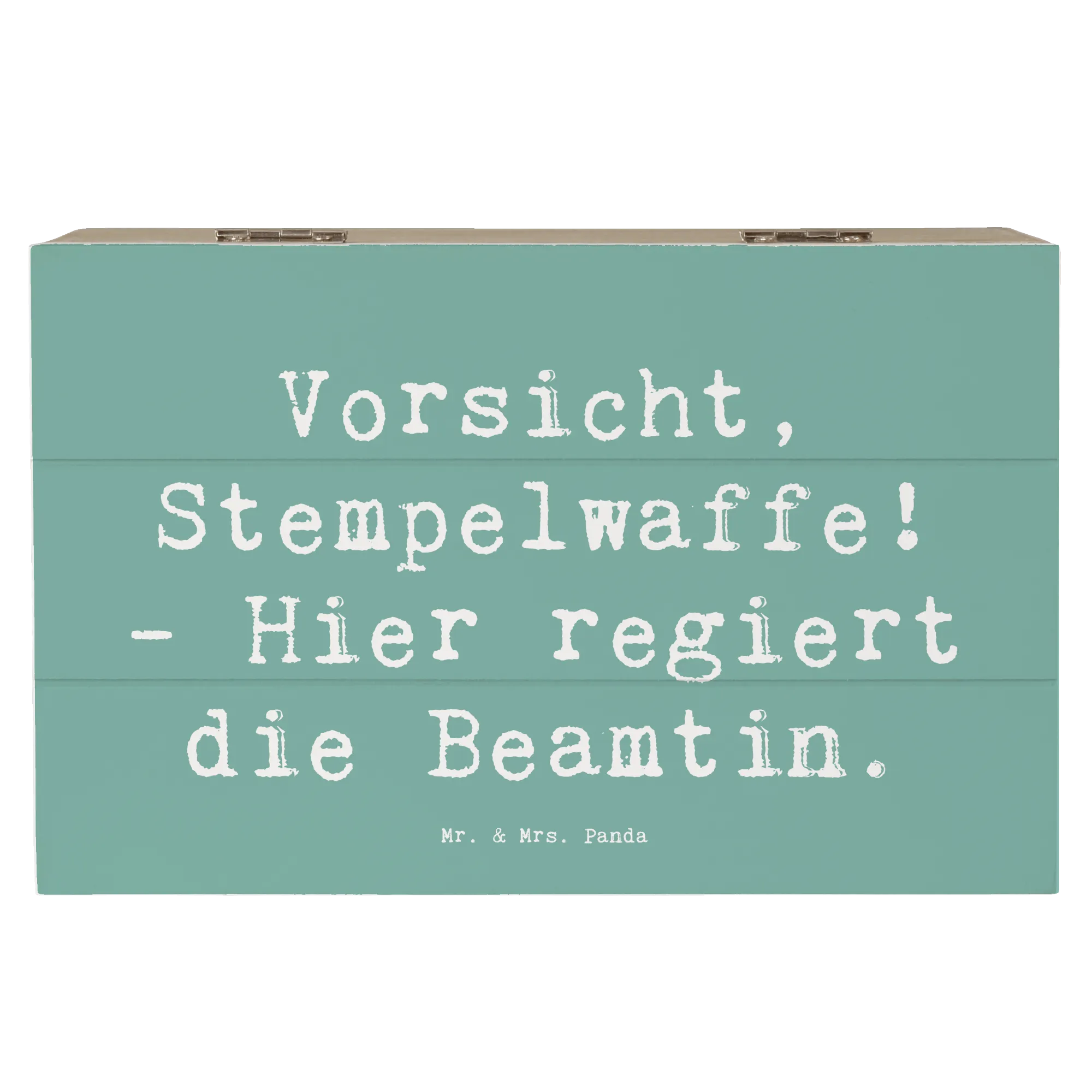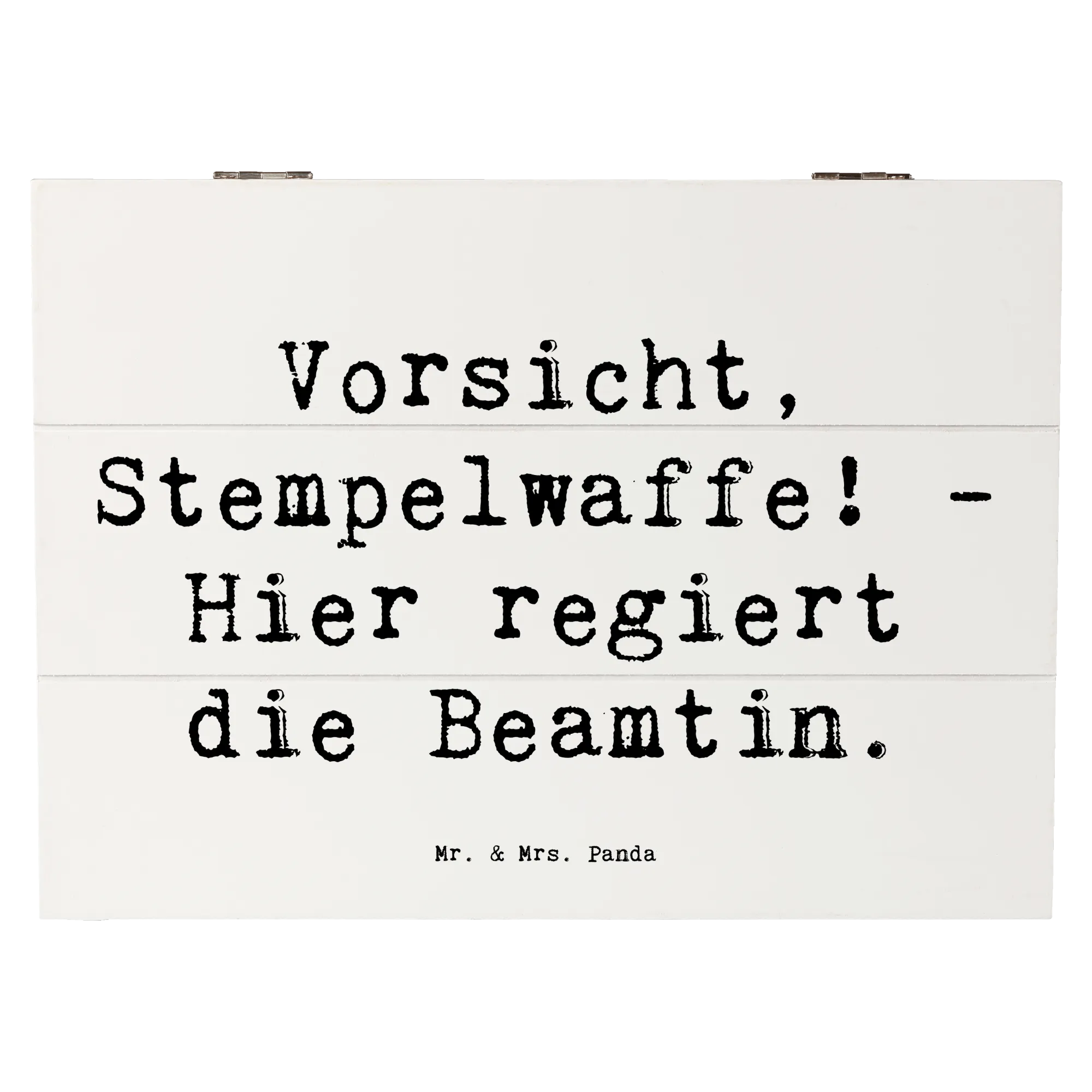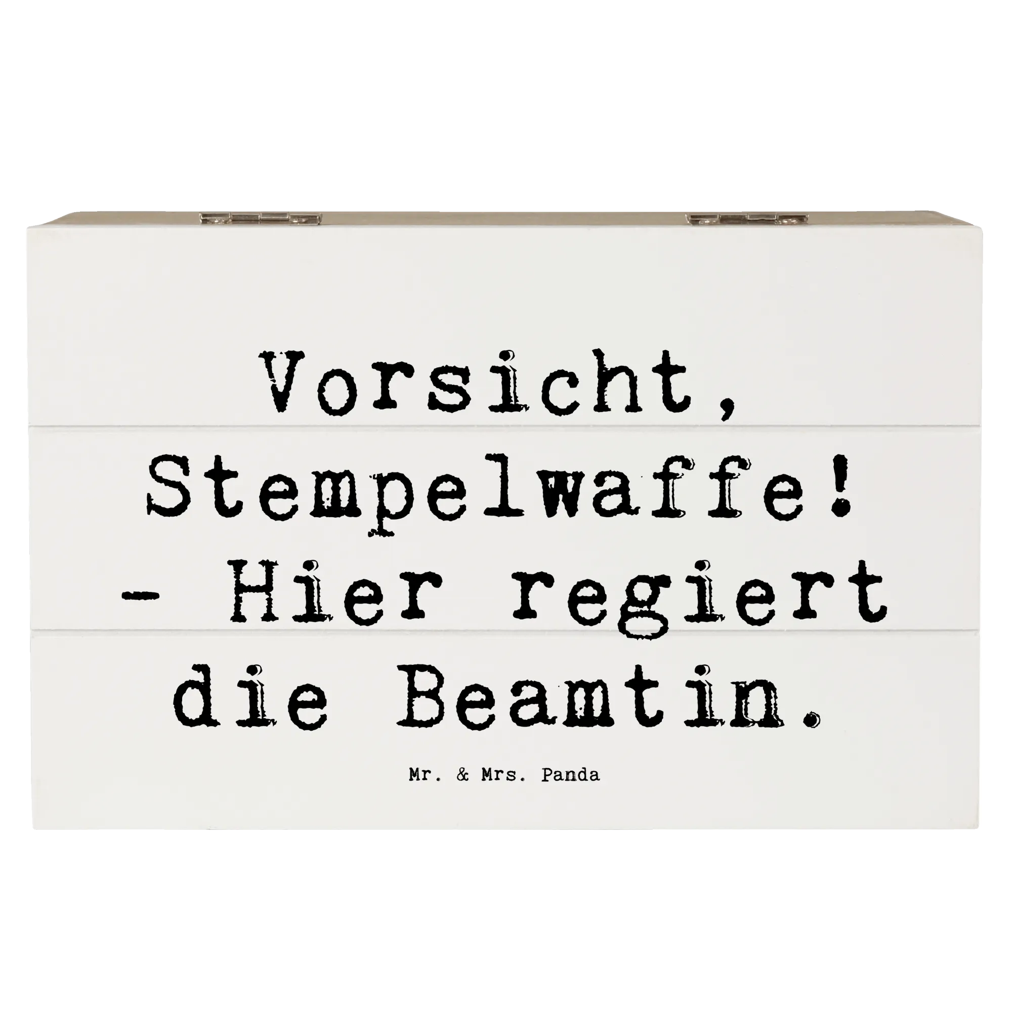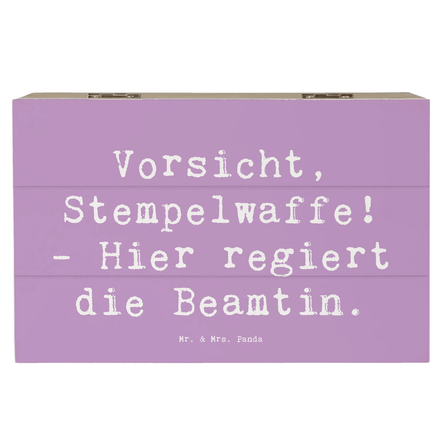 Die bezaubernde Holzkiste "Vorsicht, Stempelwaffe! - Hier regiert die Beamtin." aus der Kollektion Berufe von Mr. & Mrs. Panda ist das perfekte Geschenk für alle Beamtinnen und diejenigen, die sie schätzen. Diese wunderschöne Kiste ist nicht nur ein optisches Highlight, sondern erfüllt auch praktische Funktionen.