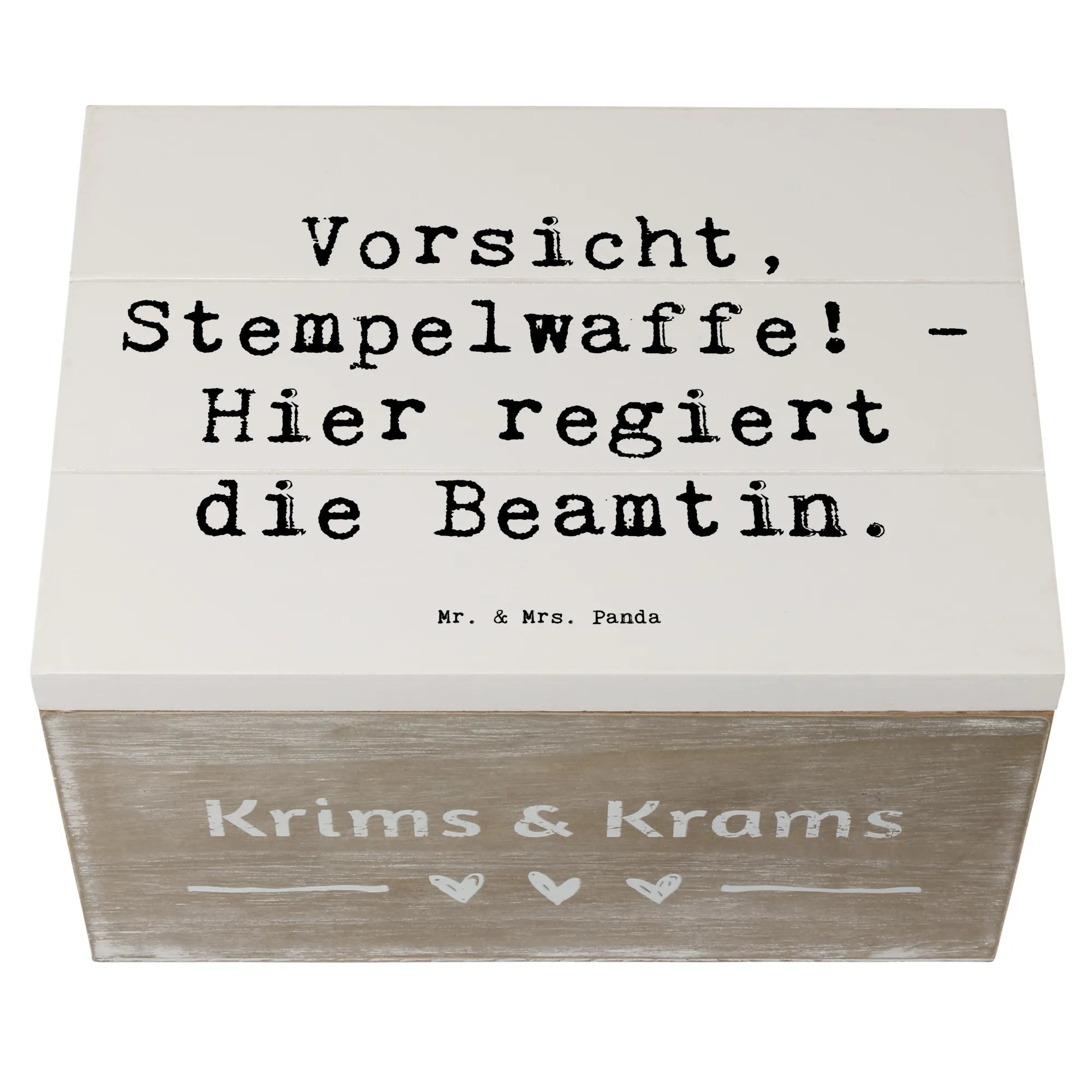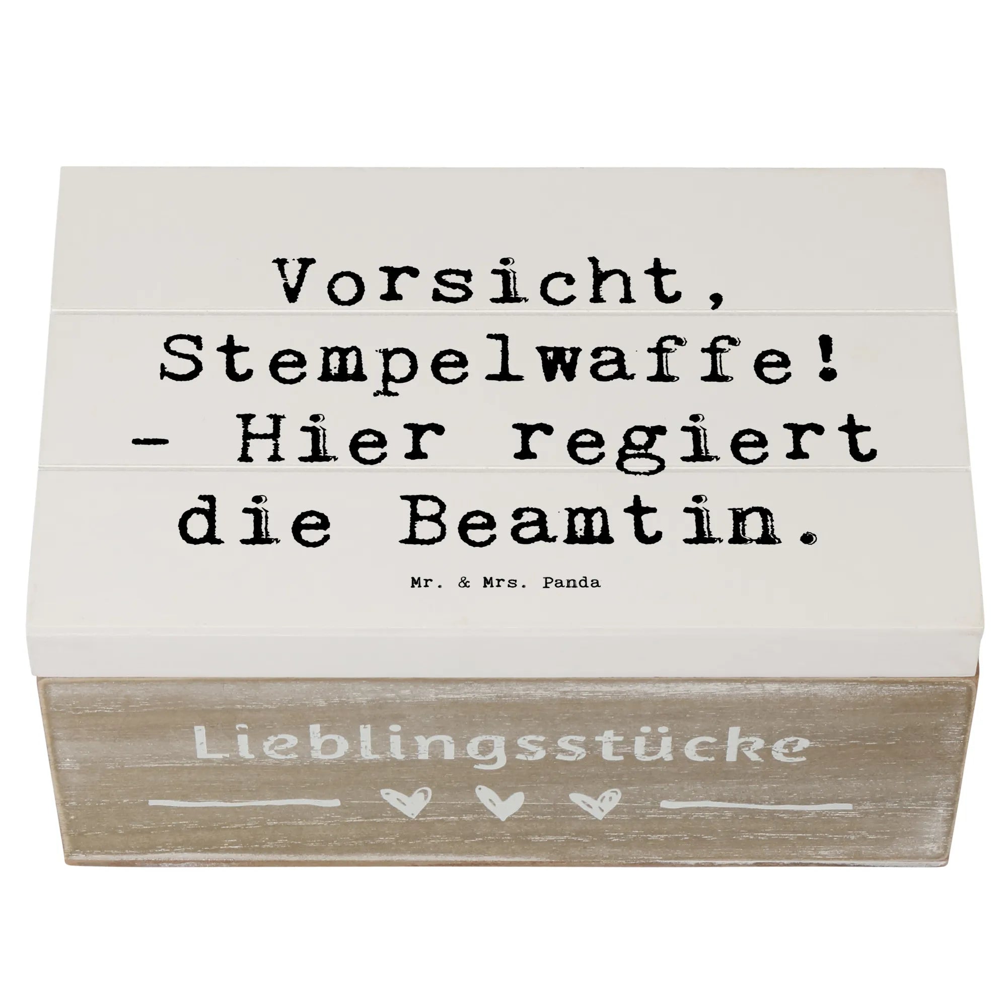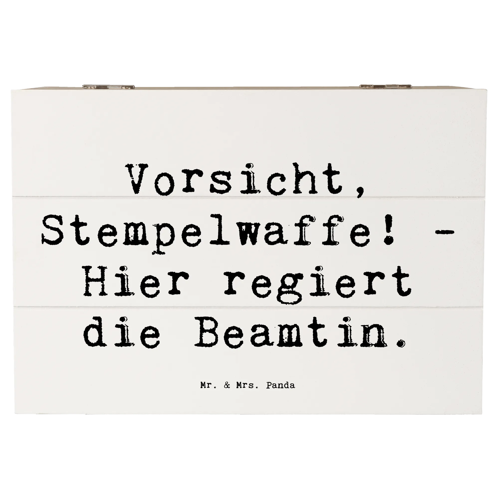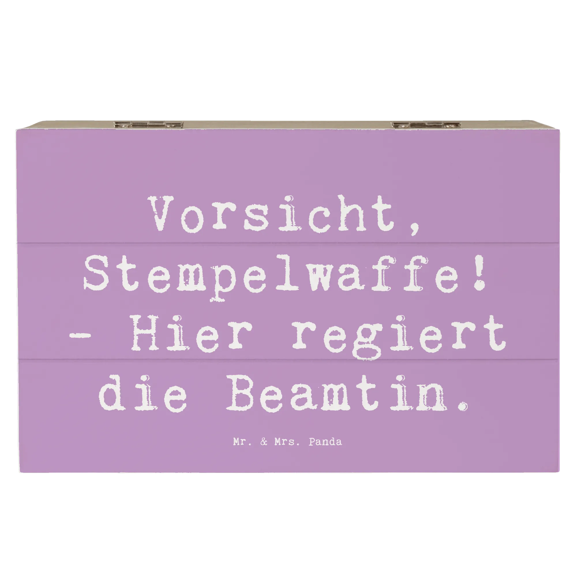 Die bezaubernde Holzkiste "Vorsicht, Stempelwaffe! - Hier regiert die Beamtin." aus der Kollektion Berufe von Mr. & Mrs. Panda ist das perfekte Geschenk für alle Beamtinnen und diejenigen, die sie schätzen. Diese wunderschöne Kiste ist nicht nur ein optisches Highlight, sondern erfüllt auch praktische Funktionen.