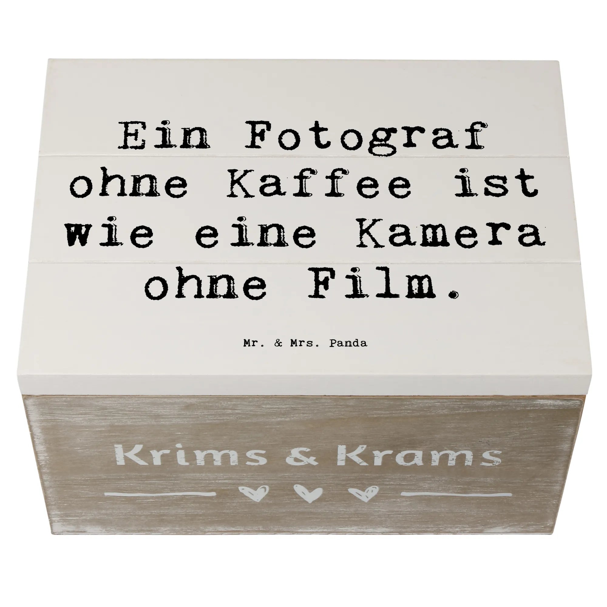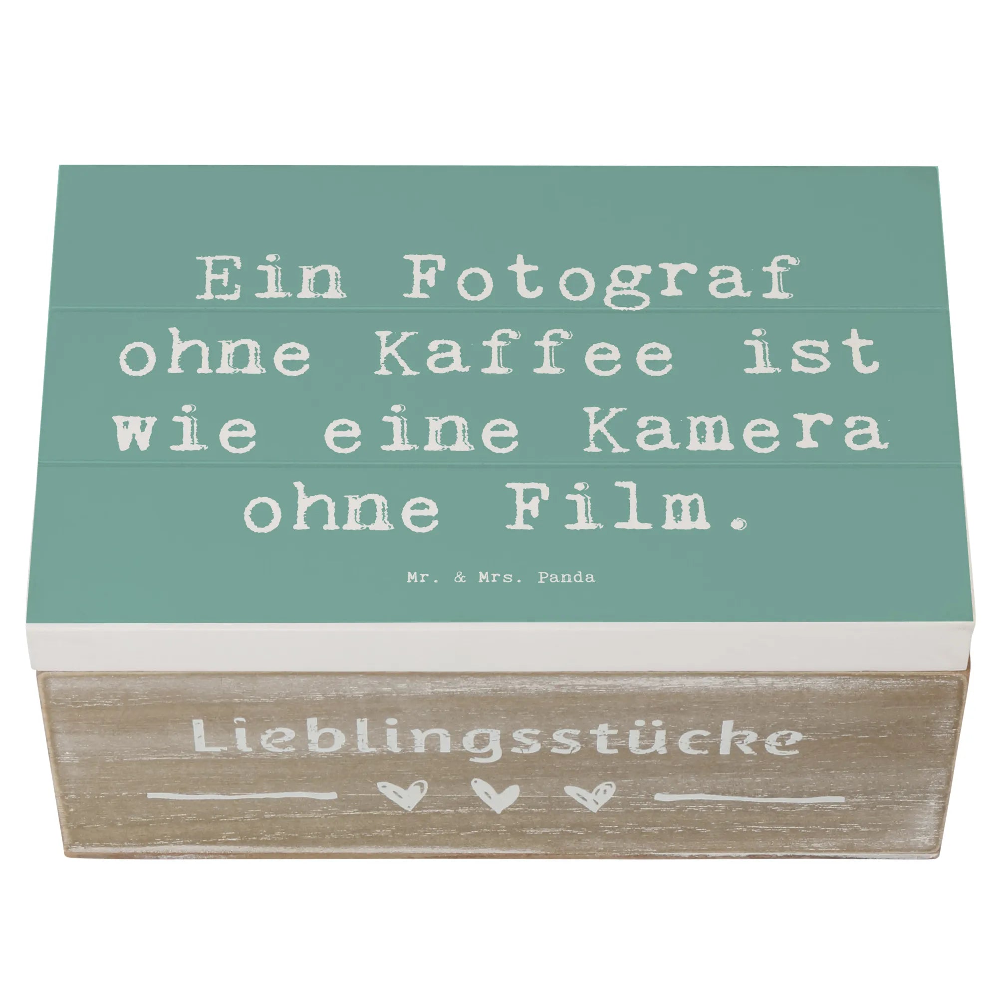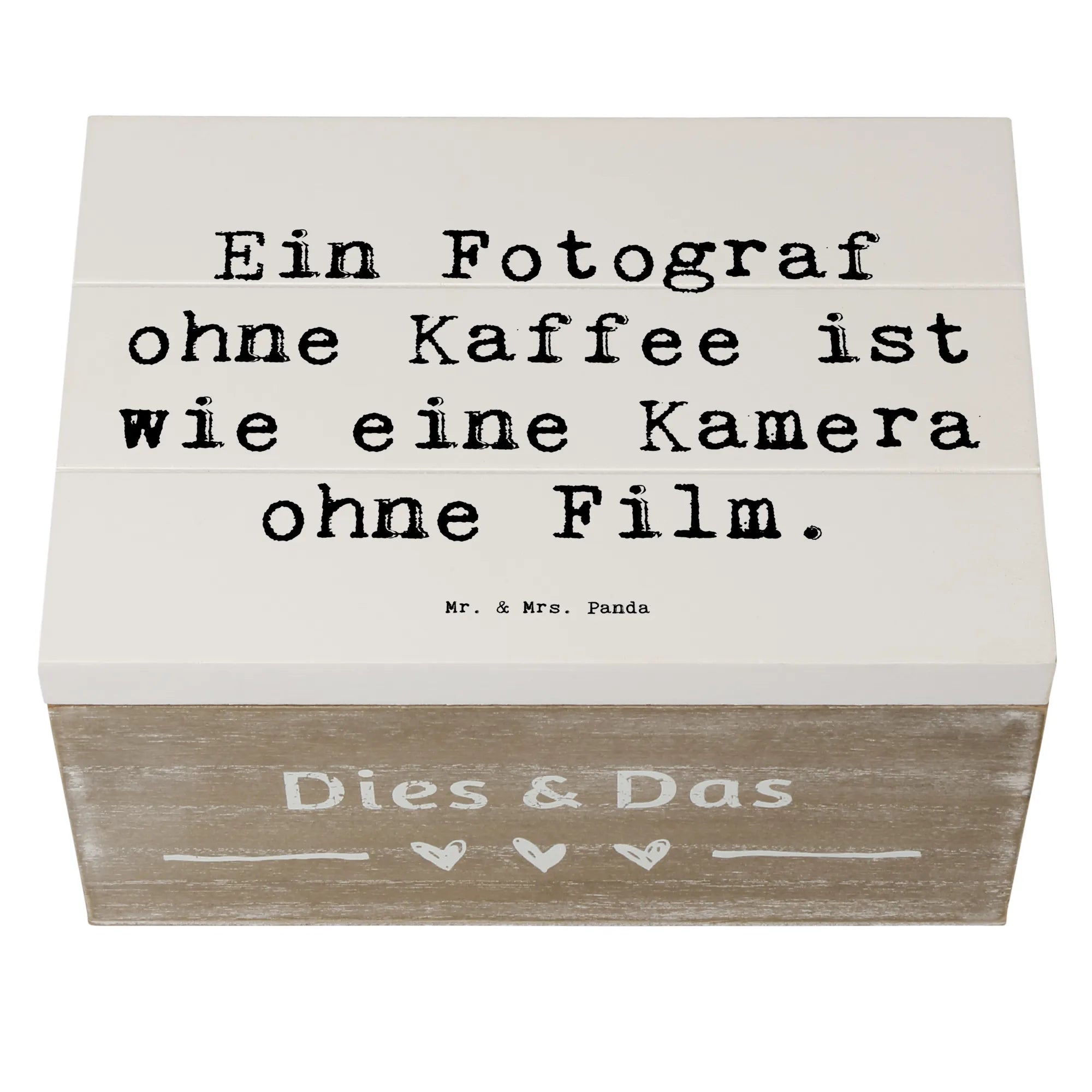Entdecke die wunderschöne Holzkiste von Mr. & Mrs. Panda, die perfekt für alle Fotografen geeignet ist! Diese bezaubernde Erinnerungskiste hat das Motto: "Ein Fotograf ohne Kaffee ist wie eine Kamera ohne Film." Sie ist nicht nur ein toller Blickfang, sondern auch super praktisch. Mit einer Größe von 19 x 12 cm bietet sie Platz für all deine wundervollen Schätze und Erinnerungen. Ob Du sie als Schatzkiste für Deine Lieblingsfotos, als Aufbewahrungsbox für besondere Andenken oder sogar als originelle Geschenkbox nutzt, dieser vielseitige Begleiter lässt keine Wünsche offen!