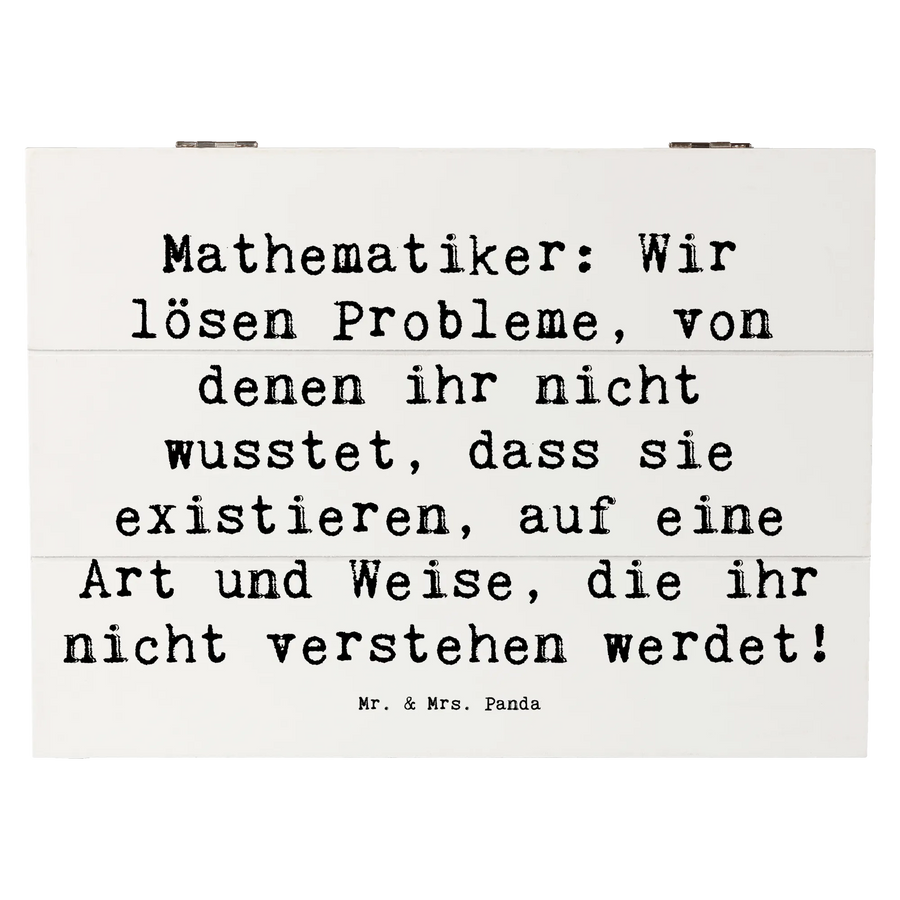 Holzkiste "Mathematiker" – die charmante Aufbewahrungsbox aus der Berufe-Kollektion von Mr. & Mrs. Panda. Mit dem witzigen Spruch „Mathematiker: Wir lösen Probleme, von denen ihr nicht wusstet, dass sie existieren, auf eine Art und Weise, die ihr nicht verstehen werdet!“ ist diese Holzbox mit Deckel das perfekte Geschenk für Mathe-Fans, Lehrer, Studenten und alle Nerds mit Humor.