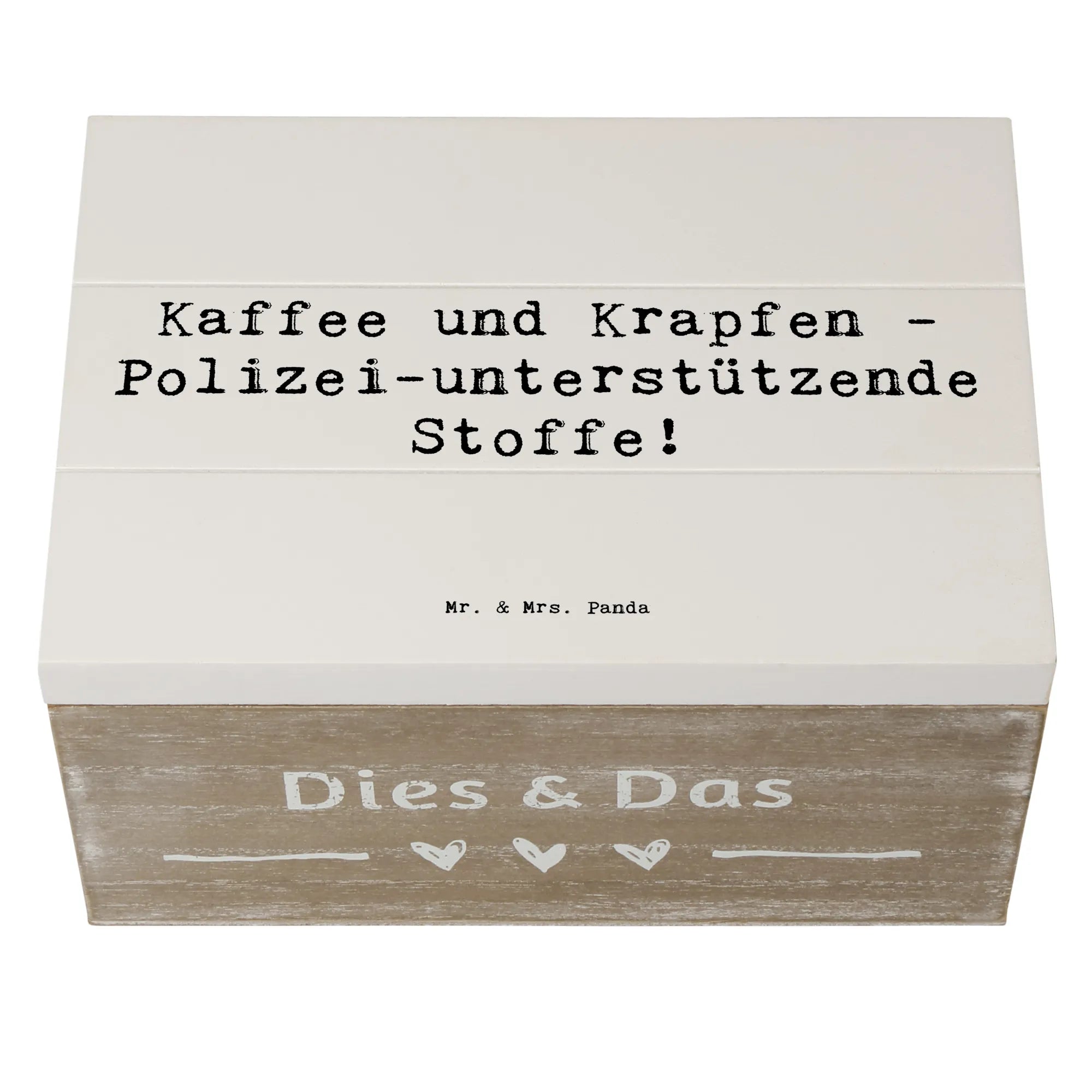 Wusstest Du, dass diese Kiste auch perfekt als nachhaltige Geschenkbox dient? Verschenke sie gefüllt mit kleinen Überraschungen oder Erinnerungen und zaubere so ein Lächeln auf das Gesicht des Beschenkten. Durch das elegante Design und den einzigartigen Spruch "Kaffee und Krapfen - Polizei-unterstützende Stoffe!" wird die Kiste immer wieder gerne in die Hand genommen und sorgt für Freude.