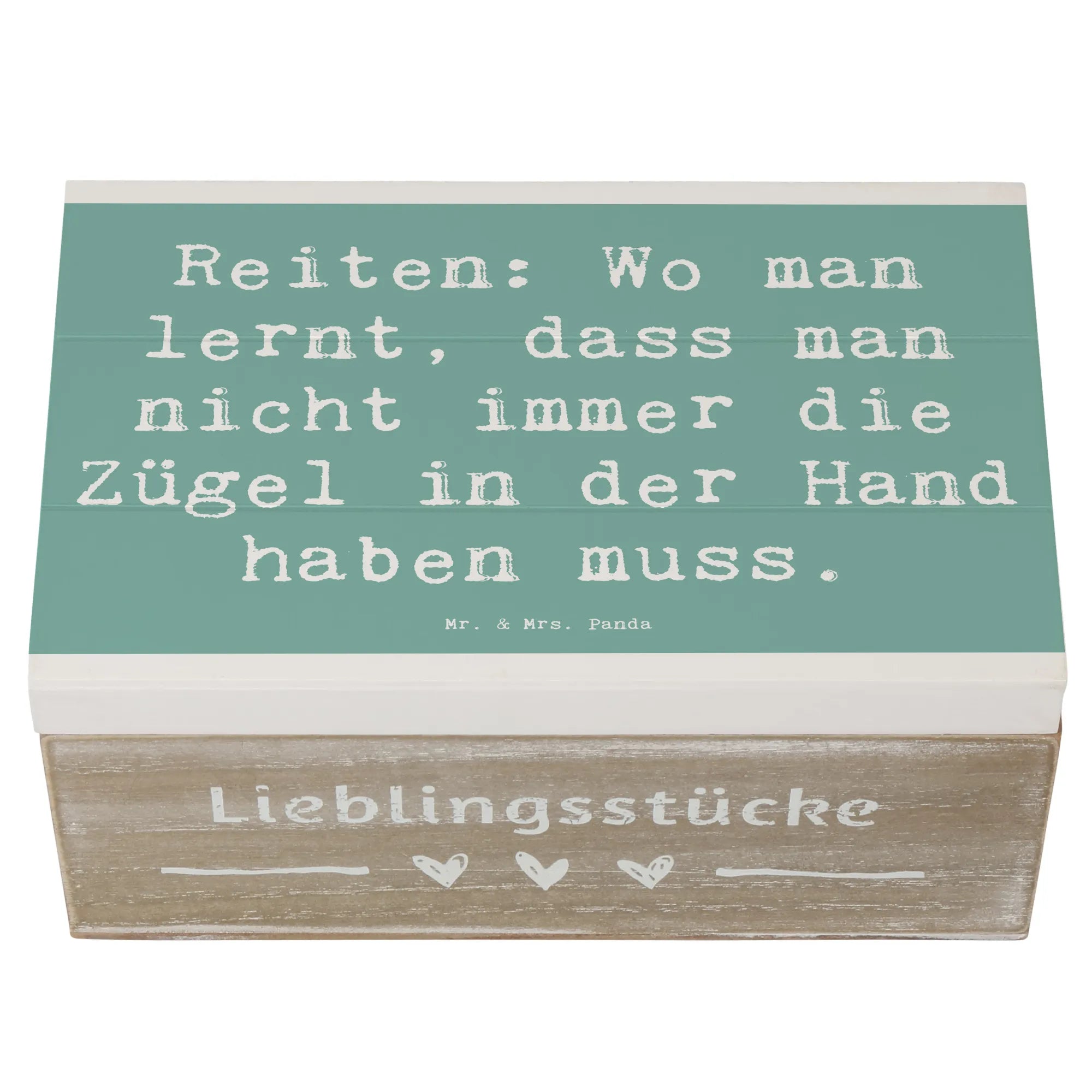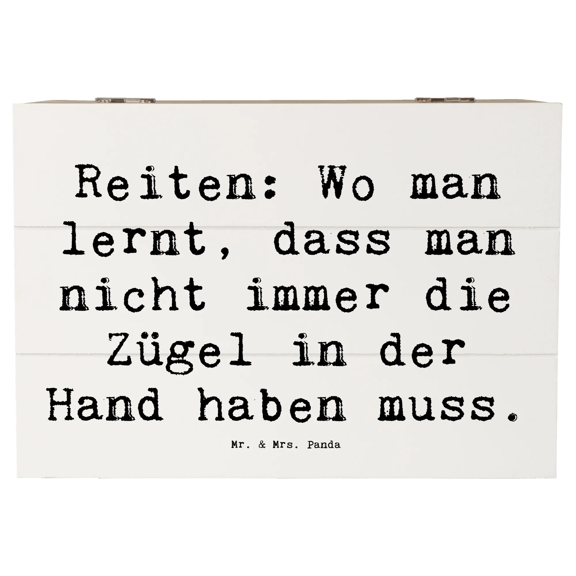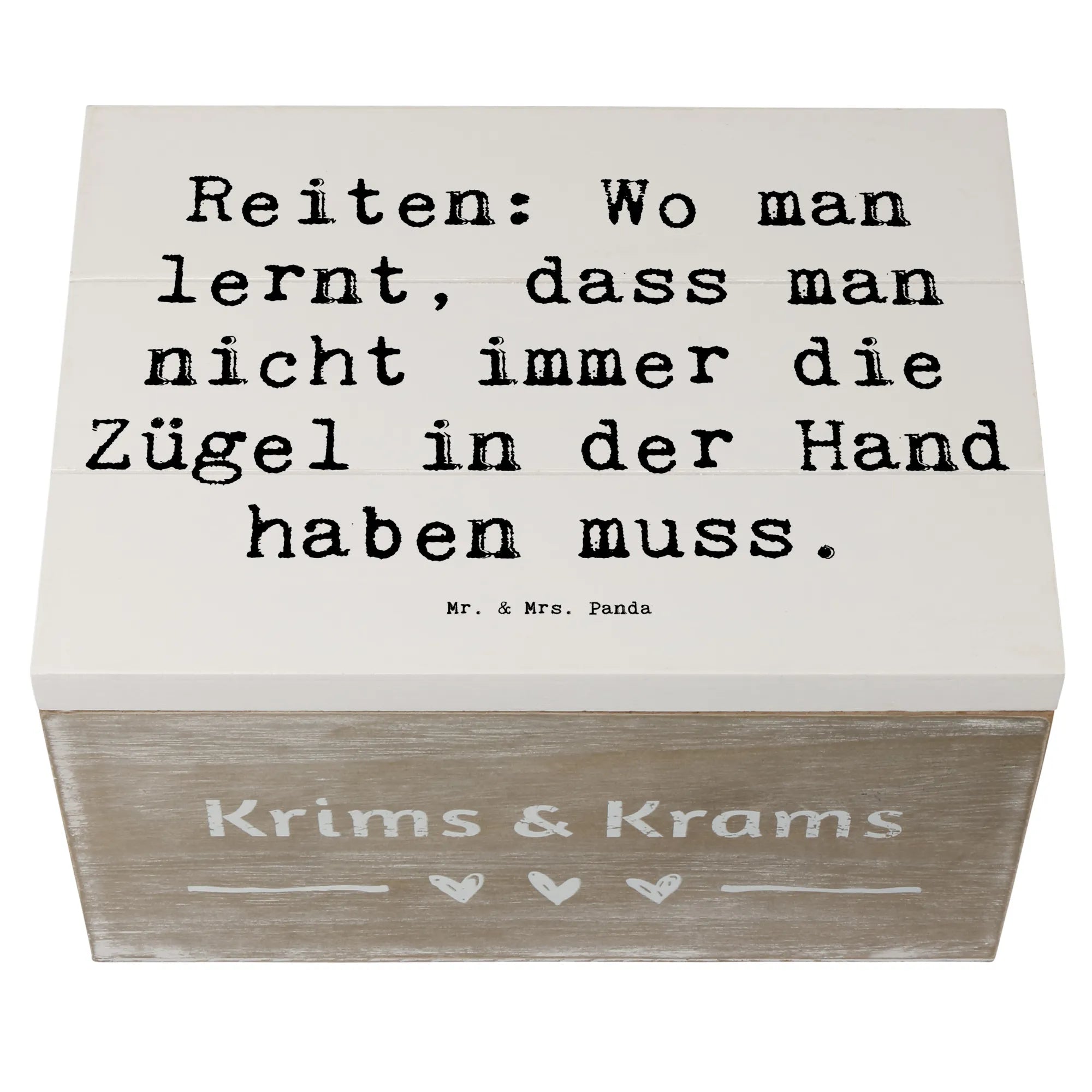 Die Holzkiste mit dem Motiv "Reiten: Wo man lernt, dass man nicht immer die Zügel in der Hand haben muss" von Mr. & Mrs. Panda ist das perfekte Geschenk für alle Pferdeliebhaber und Sportbegeisterte!