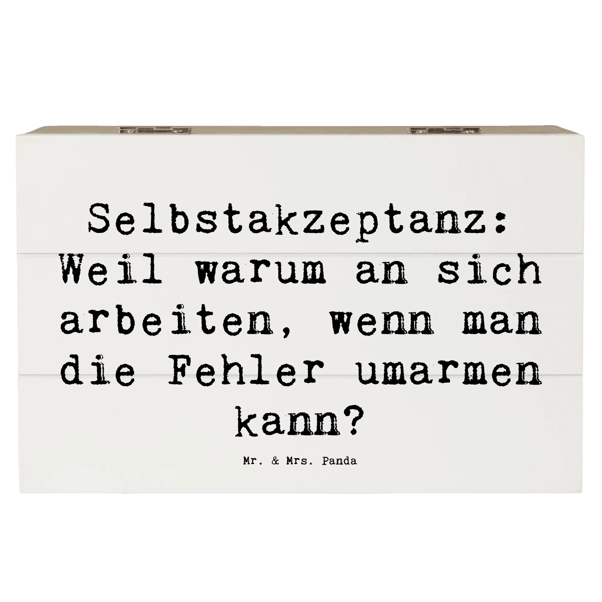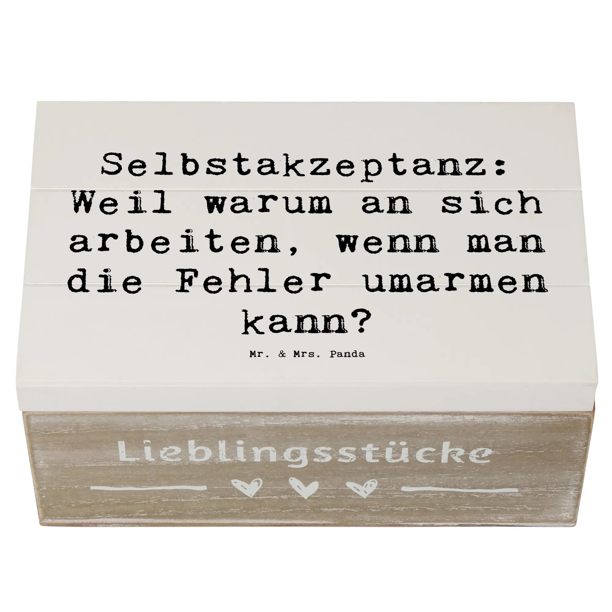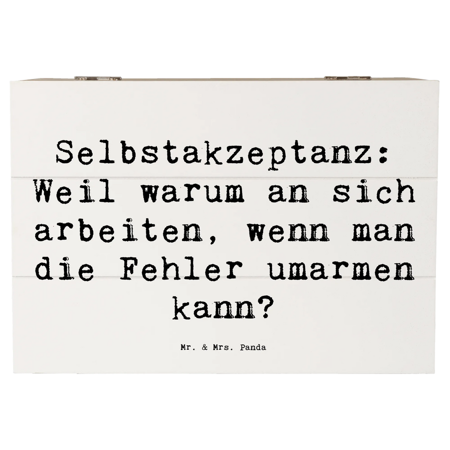 Die wunderschöne Holzkiste von Mr. & Mrs. Panda mit dem Motto 'Selbstakzeptanz: Weil warum an sich arbeiten, wenn man die Fehler umarmen kann?' ist das perfekte Geschenk für all jene, die lernen wollen, sich selbst zu lieben und zu akzeptieren. Diese hübsche, robuste Kiste ist nicht nur ein stilvolles Dekorationsstück, sondern bietet auch einen idealen Aufbewahrungsort für all die schönen Schätze, die das Leben bereithält.