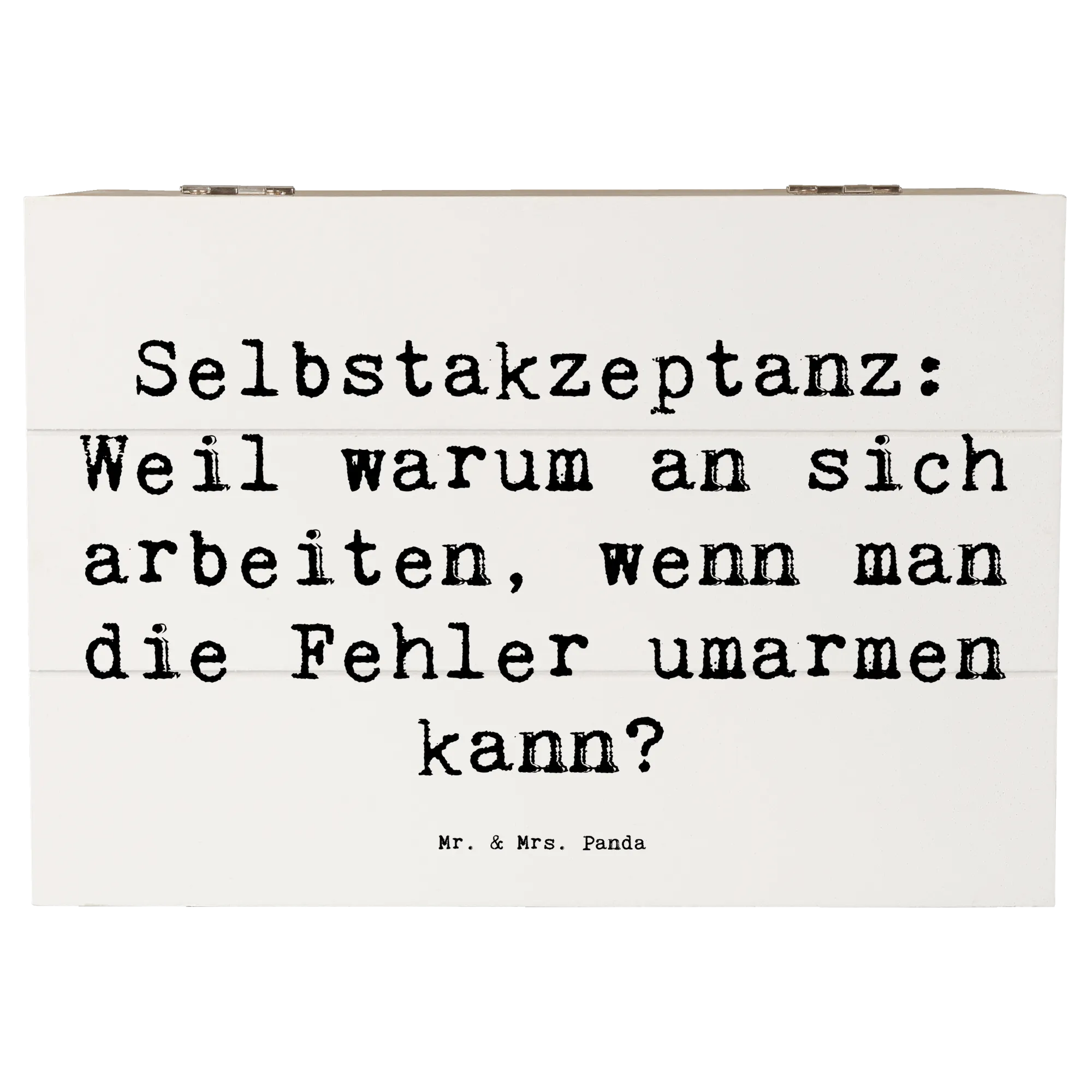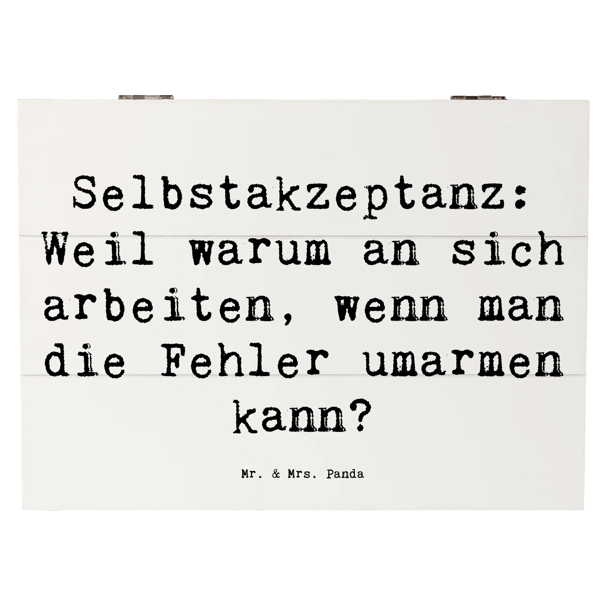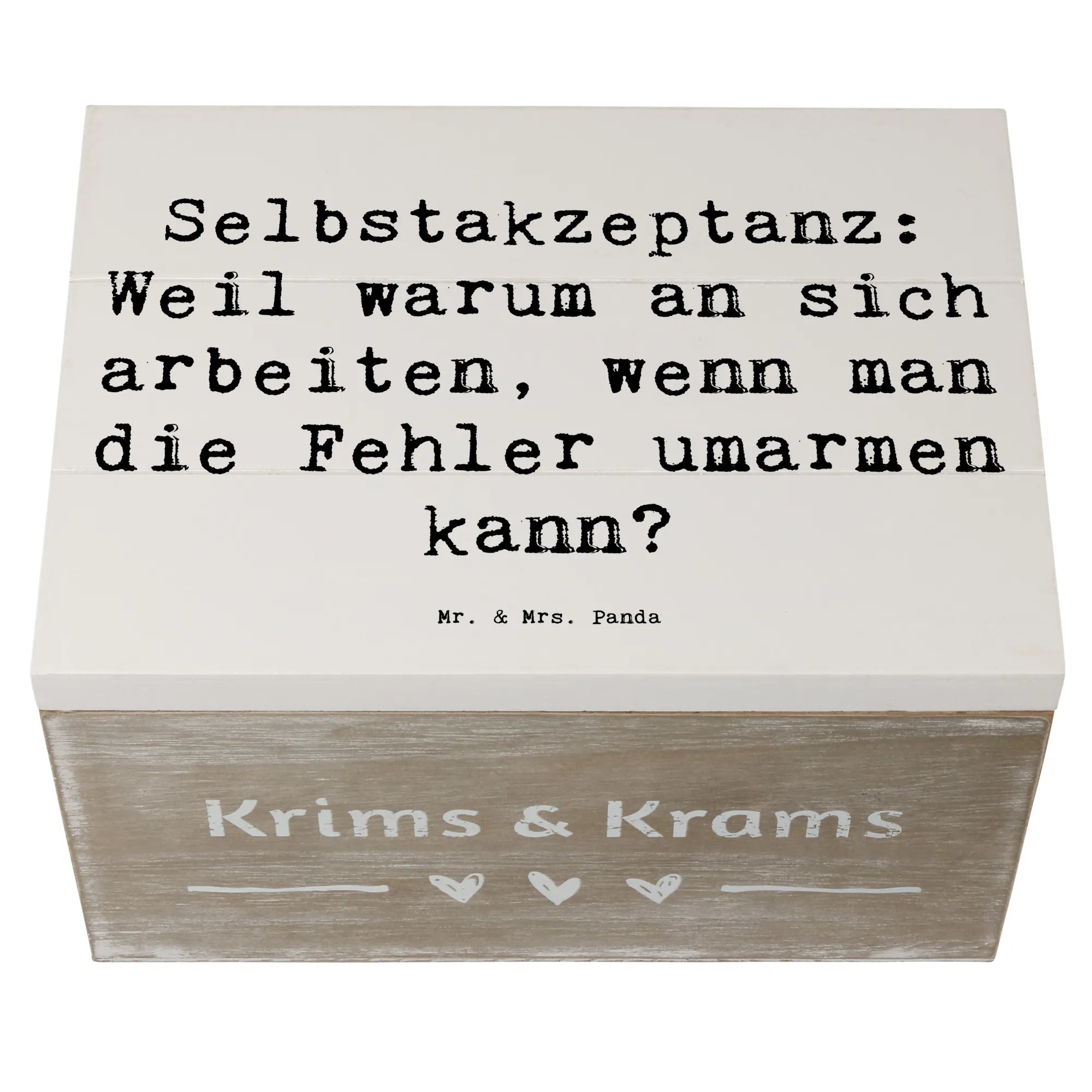 Die wunderschöne Holzkiste von Mr. & Mrs. Panda mit dem Motto 'Selbstakzeptanz: Weil warum an sich arbeiten, wenn man die Fehler umarmen kann?' ist das perfekte Geschenk für all jene, die lernen wollen, sich selbst zu lieben und zu akzeptieren. Diese hübsche, robuste Kiste ist nicht nur ein stilvolles Dekorationsstück, sondern bietet auch einen idealen Aufbewahrungsort für all die schönen Schätze, die das Leben bereithält.