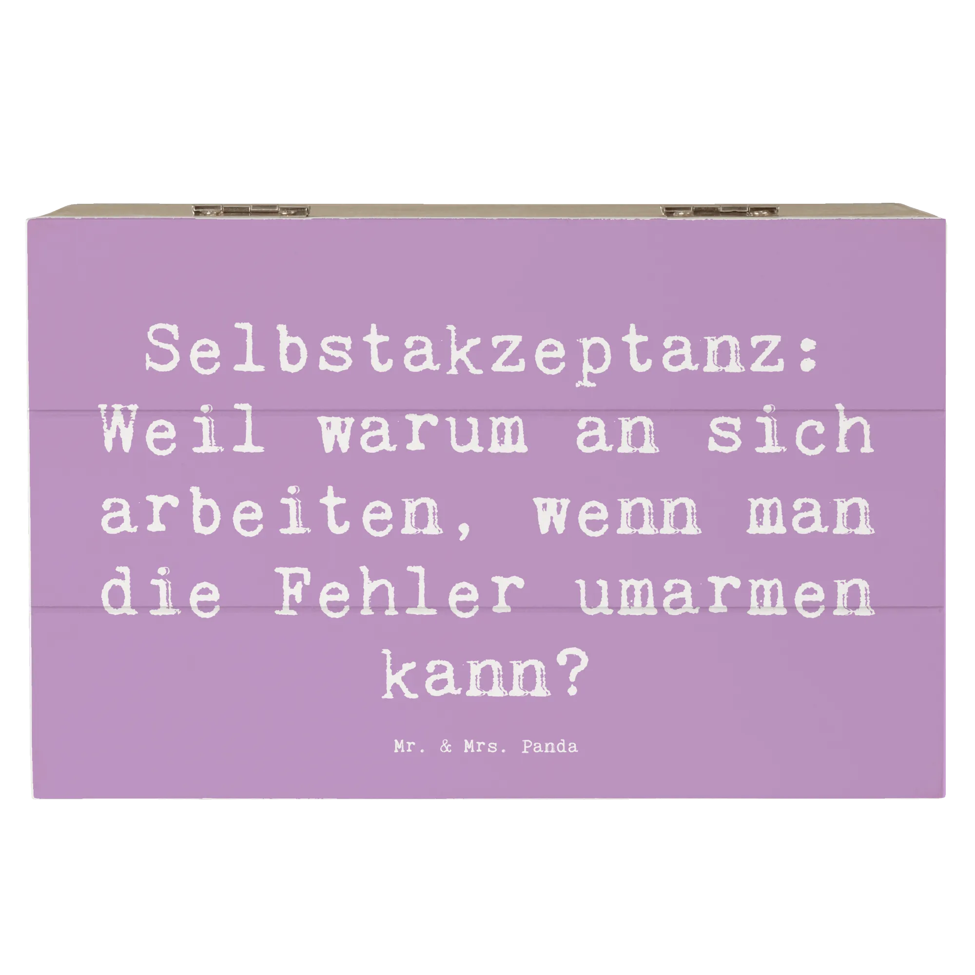 Diese zauberhafte Holzkiste von Mr. & Mrs. Panda aus der Kollektion Gefühle & Stimmungen trägt auf dem zarten Lavendeltraum-Hintergrund den liebevollen Spruch: „Selbstakzeptanz: Weil warum an sich arbeiten, wenn man die Fehler umarmen kann?“ Ein freches, tröstendes Motto, das lächeln lässt und zum Innehalten einlädt.