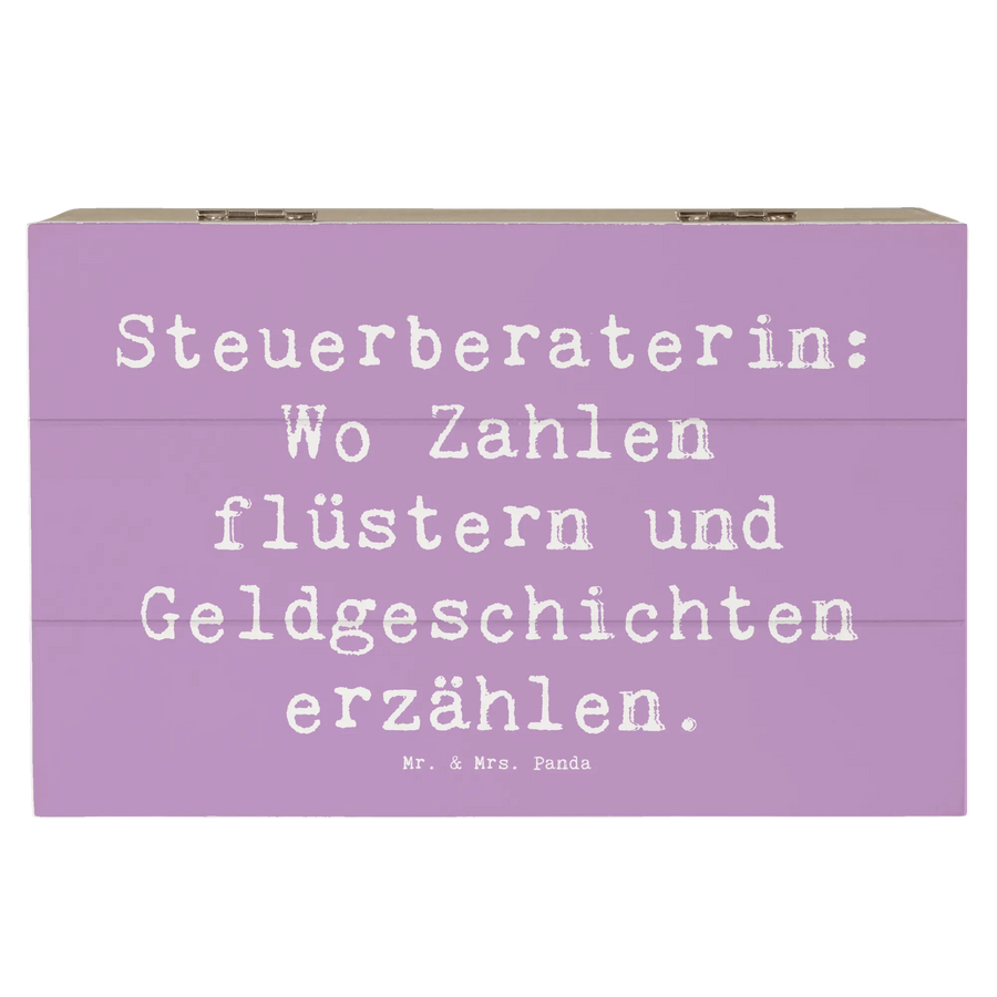 Die wunderschöne Holzkiste mit dem Motiv "Steuerberaterin: Wo Zahlen flüstern und Geldgeschichten erzählen" von Mr. & Mrs. Panda ist das perfekte Geschenk für alle Steuerberaterinnen und Zahlenliebhaberinnen! Diese liebevoll gestaltete Erinnerungskiste eignet sich wunderbar als Aufbewahrungsort für ganz besondere Schätze. Egal, ob Du Fotos, kleine Erinnerungsstücke oder vielleicht auch Dekorationen aufbewahren möchtest, diese Schatzkiste ist einfach ideal dafür.