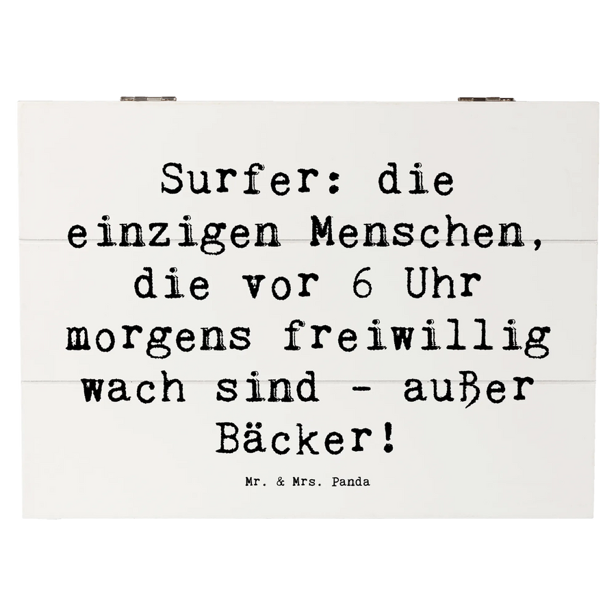 Die Holzkiste "Surfen" von Mr. & Mrs. Panda ist das perfekte Geschenk für alle Sportbegeisterten und Surfer. Mit dem lustigen Spruch "Surfer: die einzigen Menschen, die vor 6 Uhr morgens freiwillig wach sind - außer Bäcker!" ist sie nicht nur eine praktische Aufbewahrungslösung, sondern auch ein echtes Lebensgefühl.