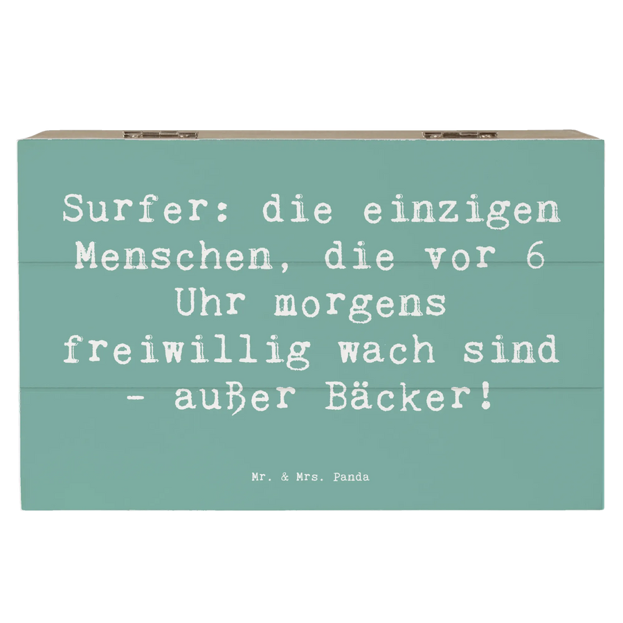 Die Holzkiste "Surfen" von Mr. & Mrs. Panda ist das perfekte Geschenk für alle Sportbegeisterten und Surfer. Mit dem lustigen Spruch "Surfer: die einzigen Menschen, die vor 6 Uhr morgens freiwillig wach sind - außer Bäcker!" ist sie nicht nur eine praktische Aufbewahrungslösung, sondern auch ein echtes Lebensgefühl.