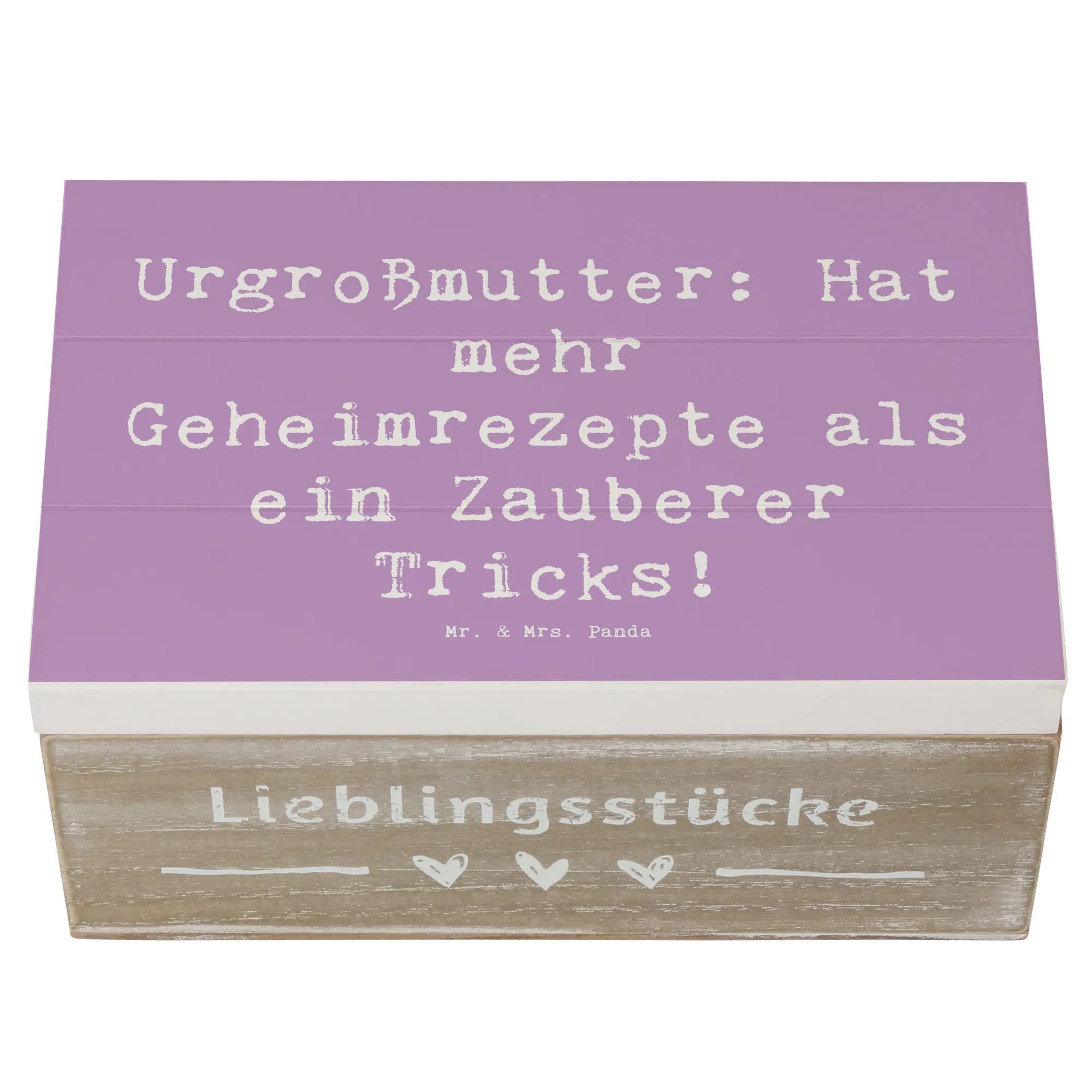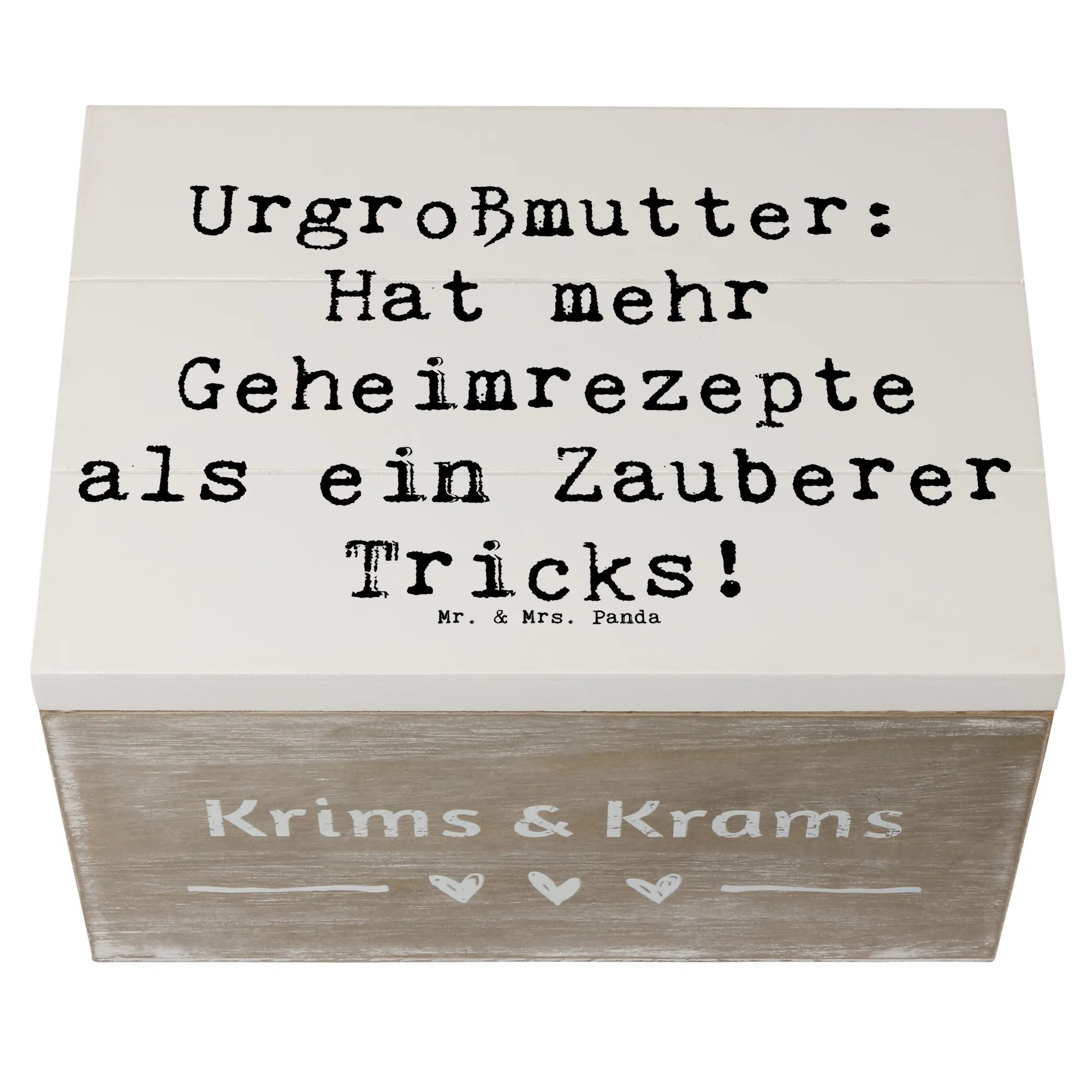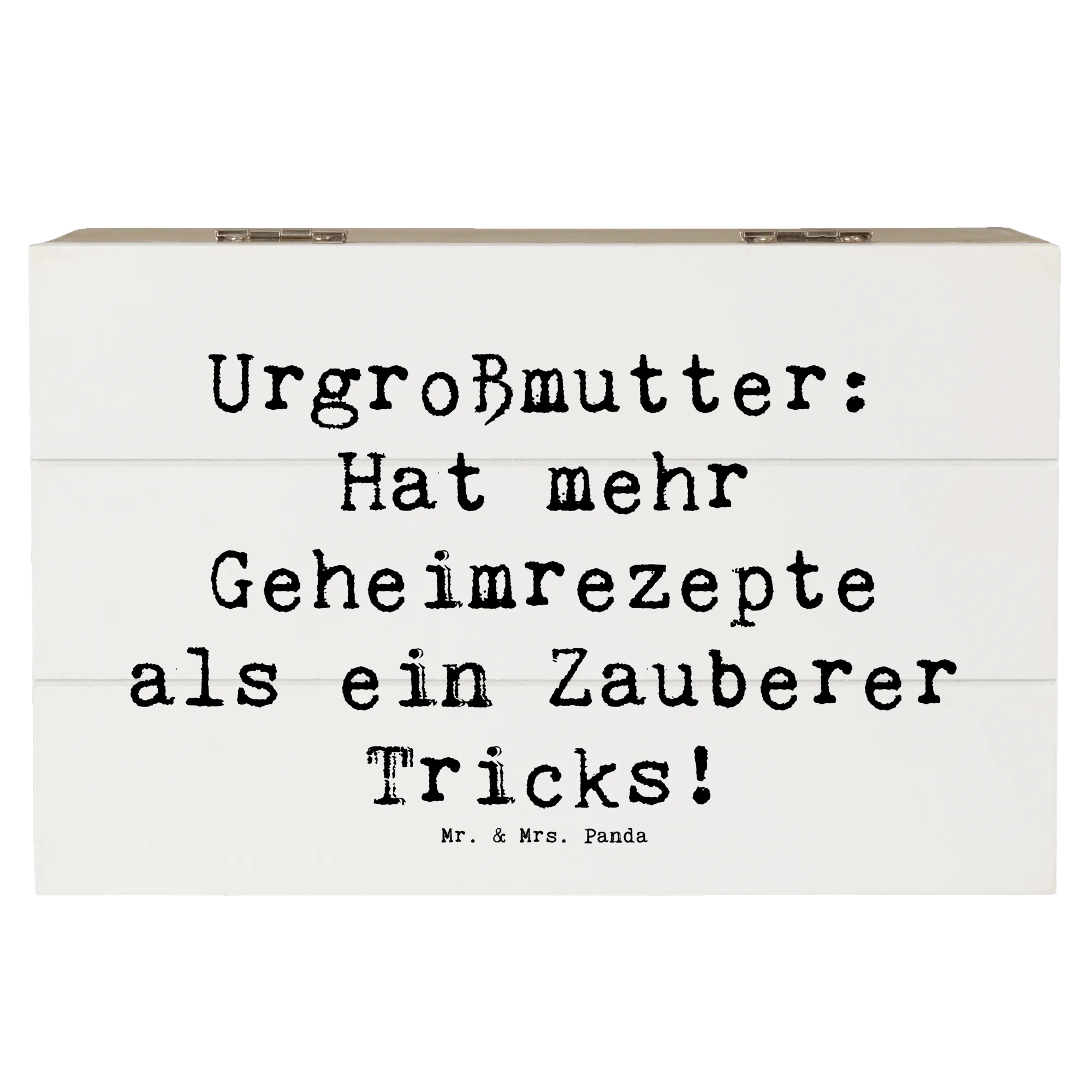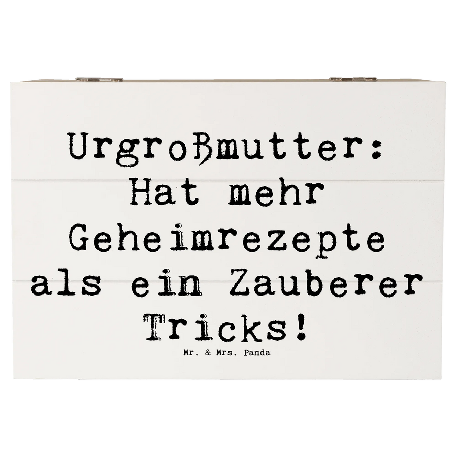 Entdecke die liebevoll gestaltete Holzkiste von Mr. & Mrs. Panda mit dem zauberhaften Motiv "Urgroßmutter: Hat mehr Geheimrezepte als ein Zauberer Tricks!" Diese wunderschöne Holzkiste ist nicht nur ein einzigartiges Deko-Element, sondern auch ein praktischer Aufbewahrungsort für all Deine wertvollen Schätze und Erinnerungen.