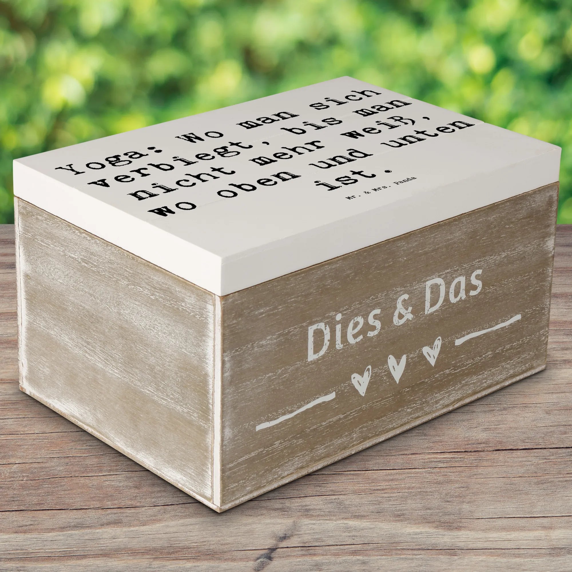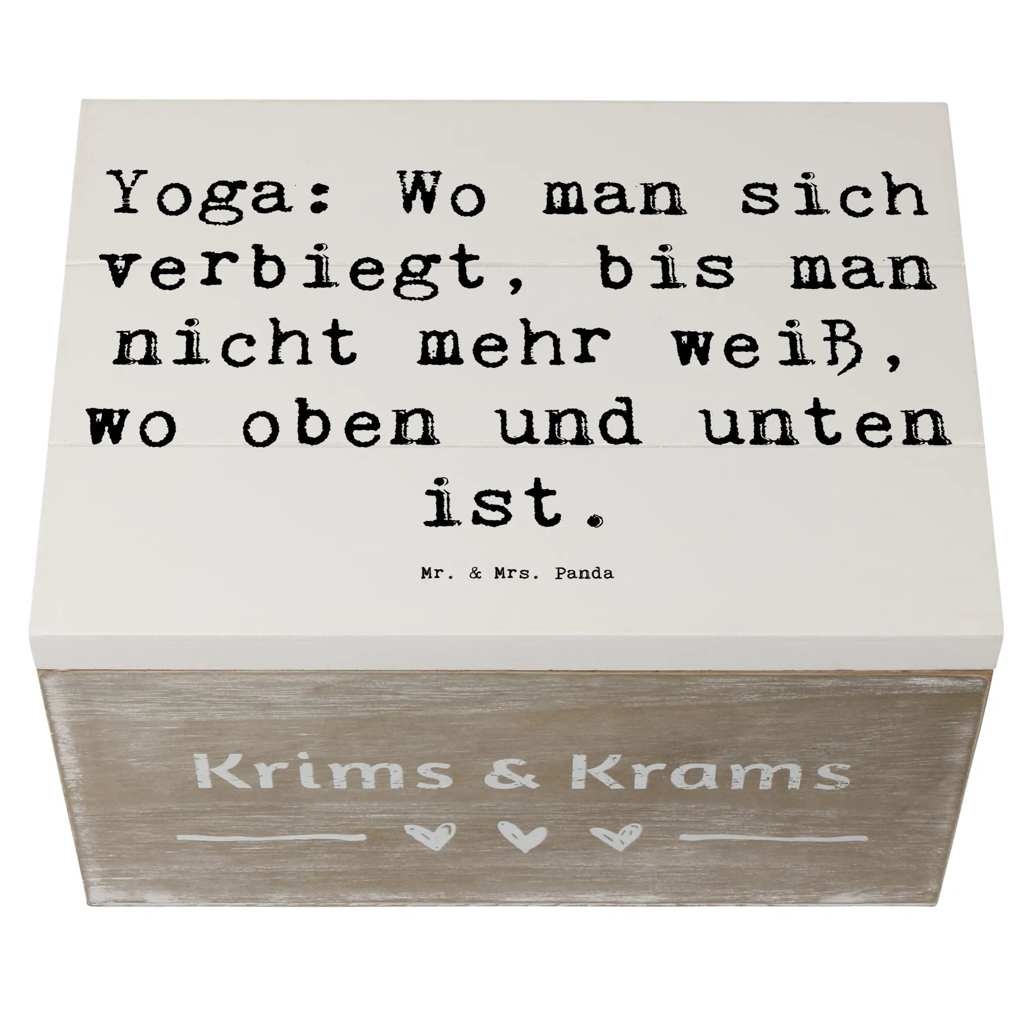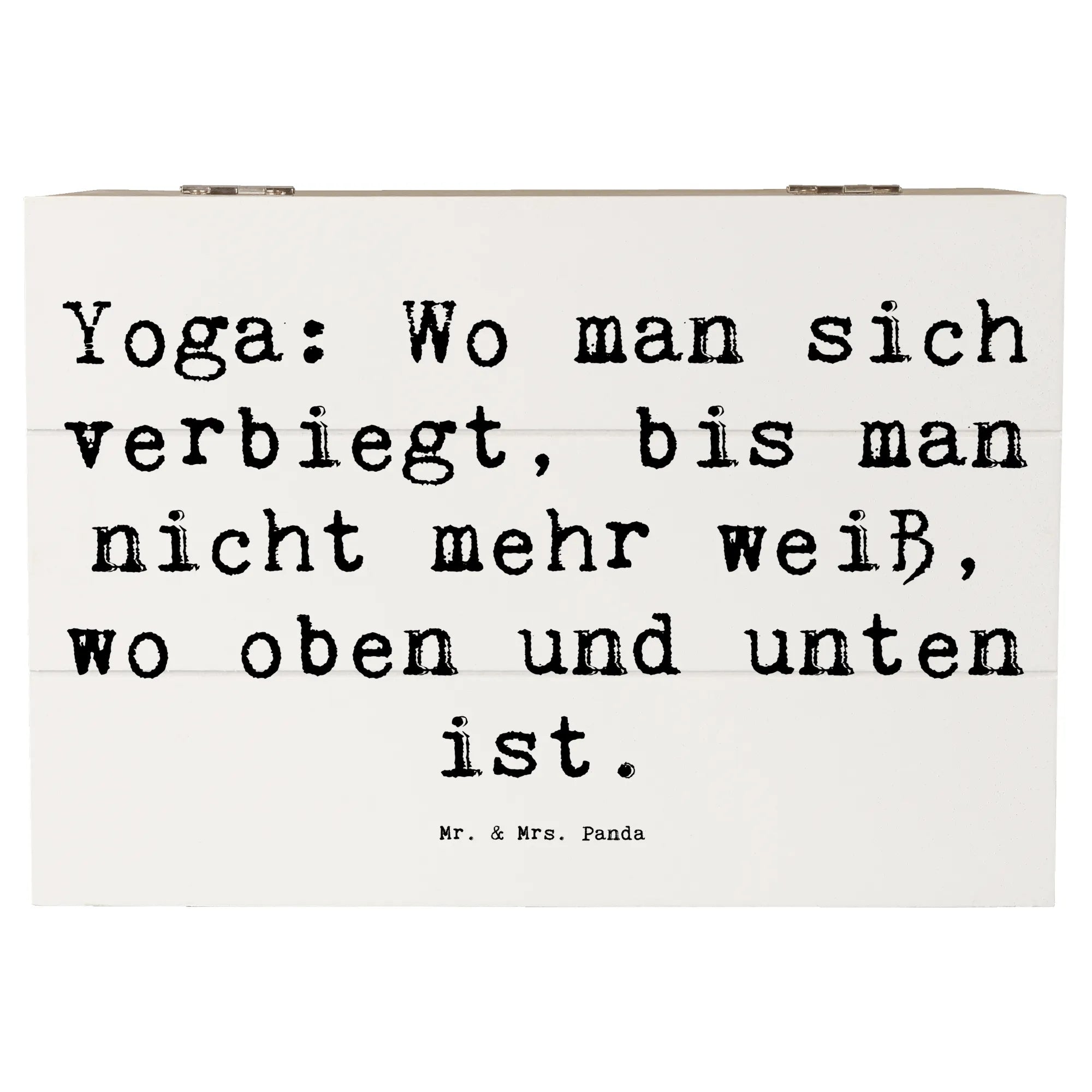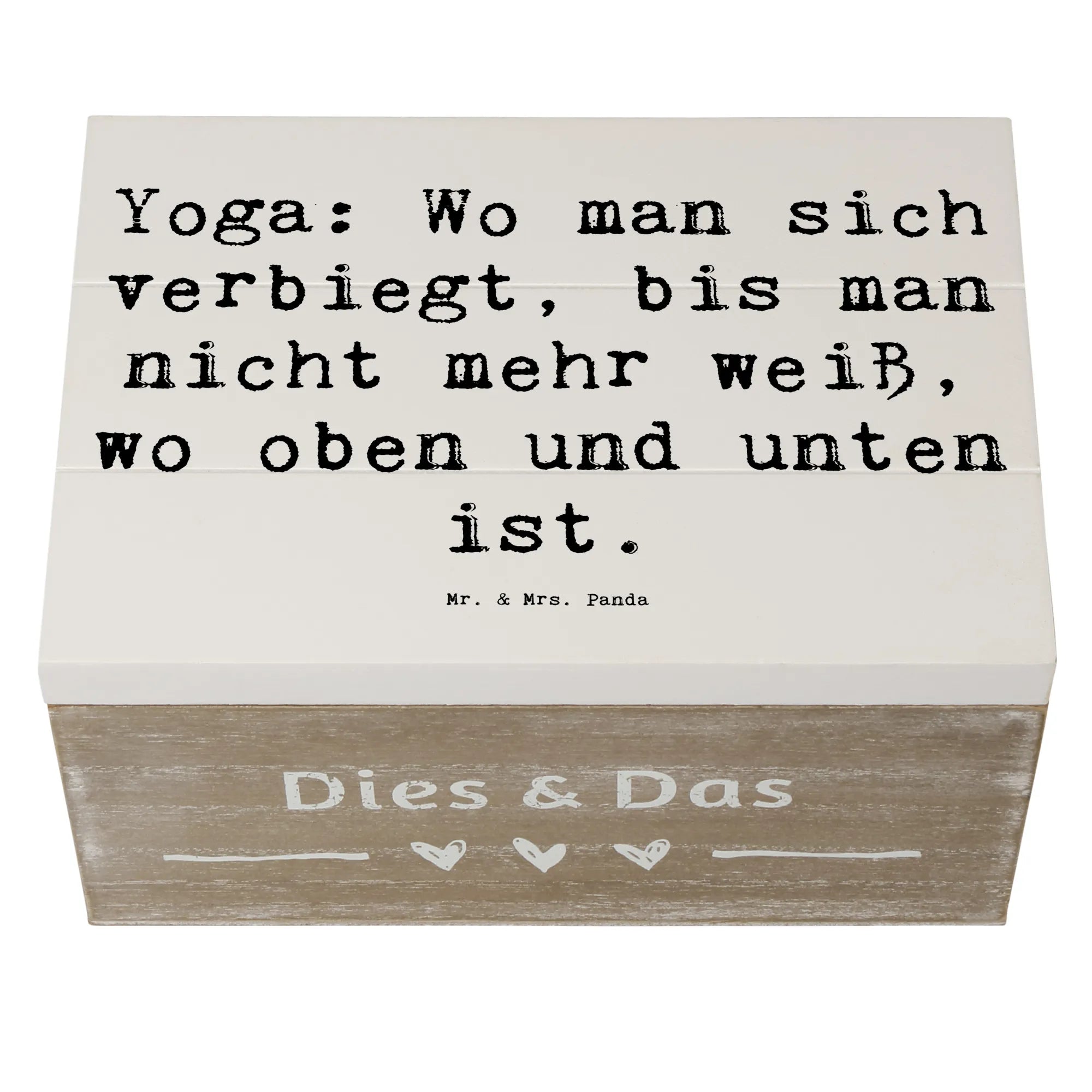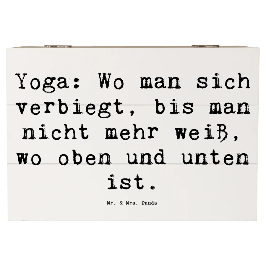 Mit dem liebevoll gestalteten Spruch "Yoga: Wo man sich verbiegt, bis man nicht mehr weiß, wo oben und unten ist." sorgt diese Holzkiste dafür, dass nicht nur deine Schätze, sondern auch dein Geist zur Ruhe kommen. Die robuste Holzfaser macht die Kiste besonders stabil und langlebig, sodass sie viele Jahre hält.