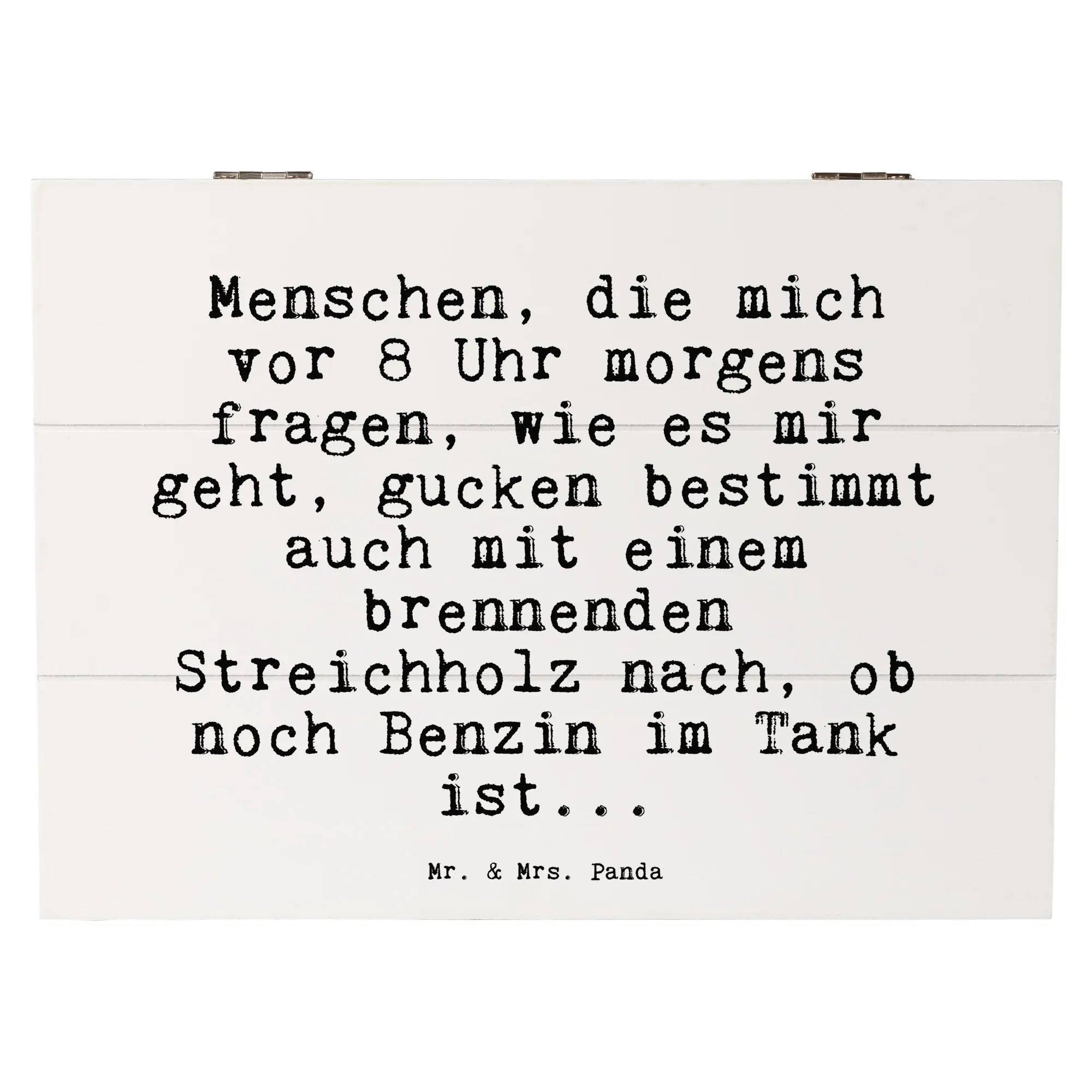 Eine wunderschöne Holzkiste von Mr. & Mrs. Panda, bedruckt mit dem witzigen Spruch: "Menschen, die mich vor 8 Uhr morgens fragen, wie es mir geht, gucken bestimmt auch mit einem brennenden Streichholz nach, ob noch Benzin im Tank ist..." ist das perfekte Geschenk für alle Morgenmuffel und Frühaufsteher. Ob im Büro oder für den Chef, die Chefin, Kollegen oder die beste Kollegin - dieser humorvolle Spruch wird garantiert ein Lächeln auf die Gesichter zaubern. Die Holzkiste hat die idealen Maße von 180 mm x 250 mm x 150 mm und bietet genug Platz für Erinnerungen, Fotos oder kleine Schätze aus dem Büroalltag. Du kannst sie auch als dekorative Aufbewahrungsbox nutzen!