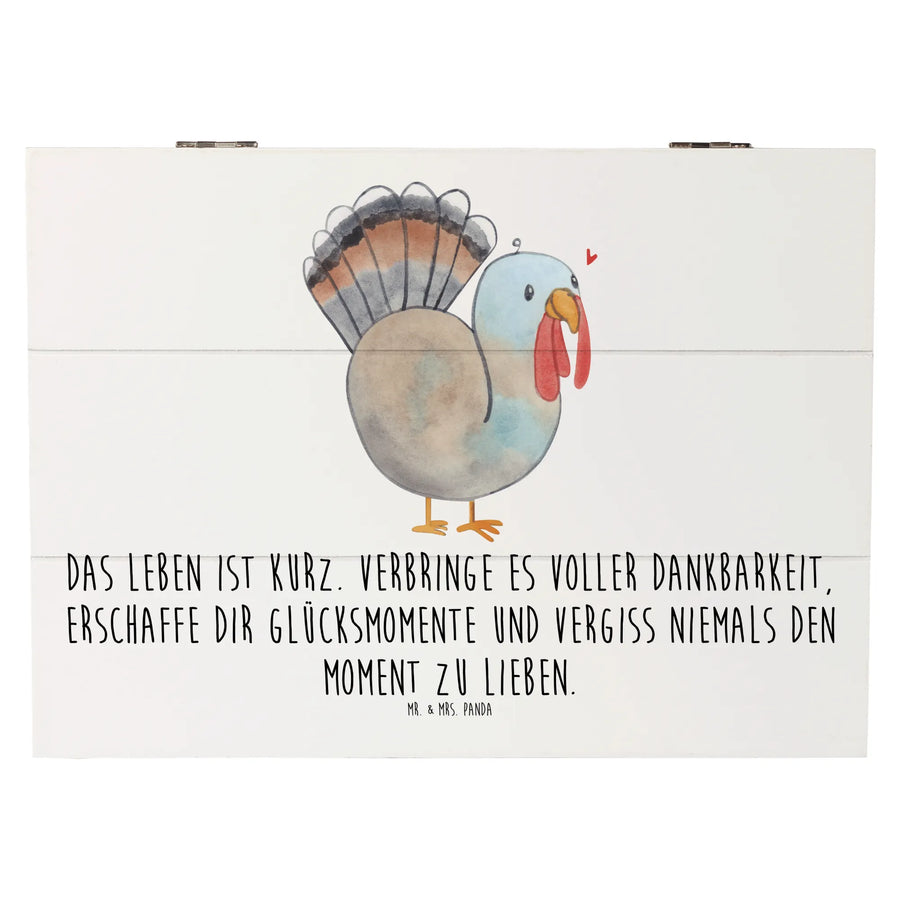 Das charmante Motiv des Truthahns strahlt Wärme und Freude aus. Mit einem lächelnden Gesicht und einer fluffigen Frisur ist dieser kleine Vogel ein wahrer Blickfang! Entworfen mit viel Liebe und Detail von Mr. & Mrs. Panda, verleiht der Truthahn der Kiste eine festliche Atmosphäre, die perfekt zum Erntedankfest passt. Der mit einem herzlichen Spruch, "Das Leben ist kurz. Verbringe es voller Dankbarkeit, erschaffe dir Glücksmomente und vergiss niemals den Moment zu lieben," bedruckte Deckel regt dazu an, die wertvollen Augenblicke des Lebens zu schätzen.