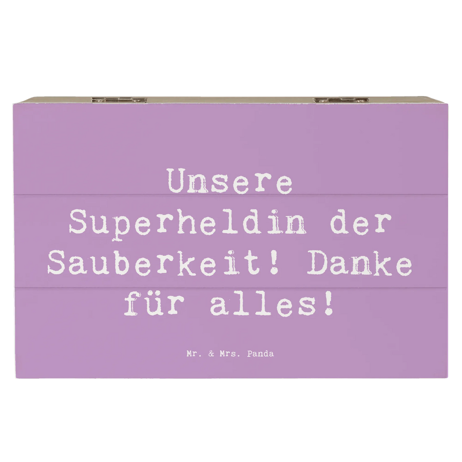 Die wunderschöne Holzkiste Putzfrau von Mr. & Mrs. Panda ist das perfekte Geschenk, um Danke zu sagen. Mit ihrem liebevollen Slogan "Unsere Superheldin der Sauberkeit! Danke für alles!" wird diese Kiste zu einem ganz besonderen Erinnerungsstück.