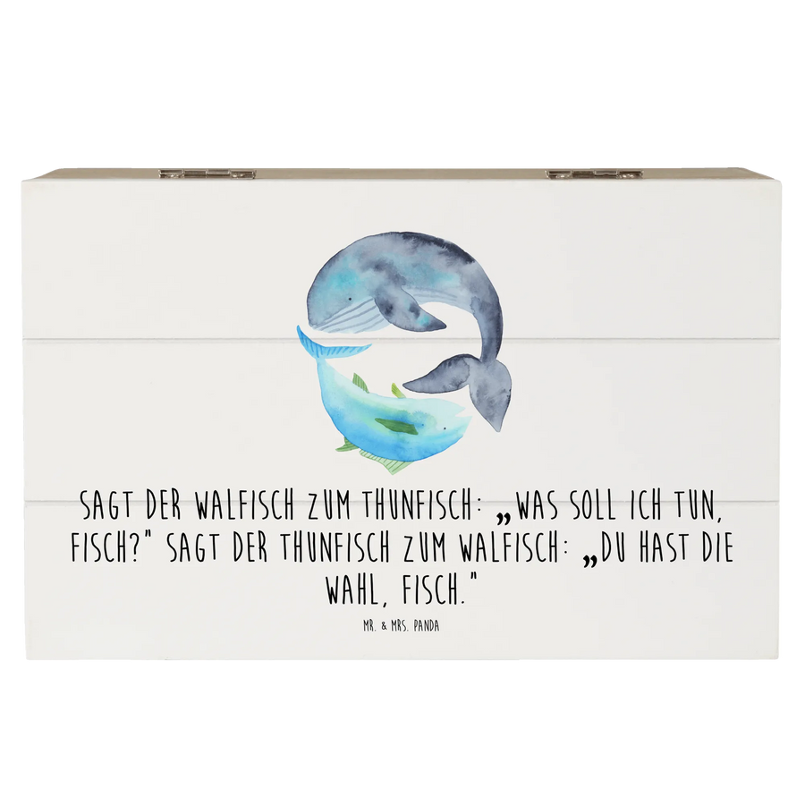 Der lustige Spruch "Sagt der Walfisch zum Thunfisch: „Was soll ich tun, Fisch?“ Sagt der Thunfisch zum Walfisch: „Du hast die Wahl, Fisch." verleiht der Kiste einen charmanten und fröhlichen Touch.