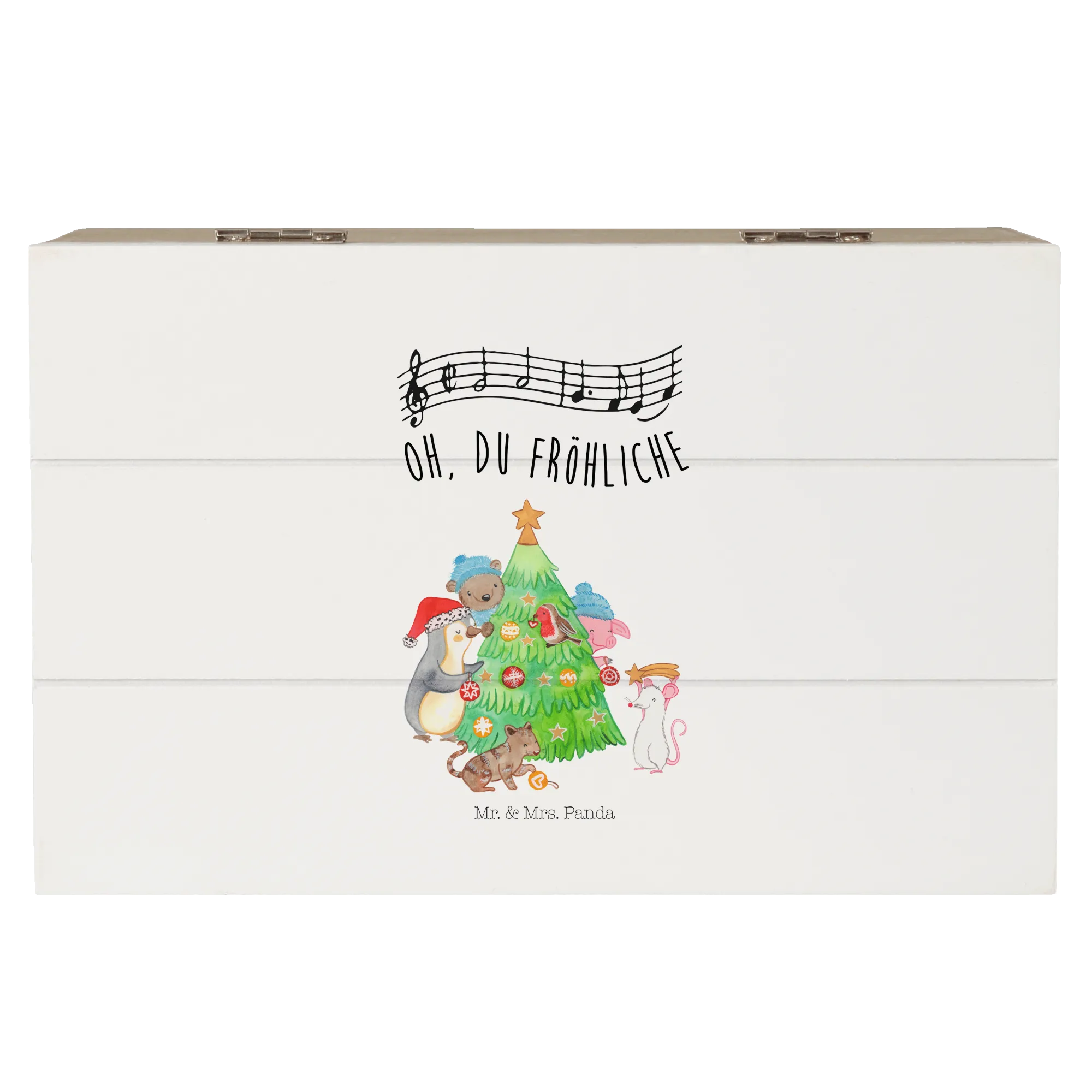 Entdecke die wunderbare Holzkiste "Weihnachtsbaum schmücken" von Mr. & Mrs. Panda aus unserer exklusiven Winter Kollektion! Diese zauberhafte Schatzkiste ist mehr als nur ein Aufbewahrungsort für deine schönsten Erinnerungen – sie ist ein echtes Highlight in jedem Zuhause zur Winter- und Weihnachtszeit. Mit einem charmanten Motiv, das einen Pinguin, ein Schwein, eine Maus, eine Katze und einen Bären zeigt, die fröhlich gemeinsam einen Weihnachtsbaum schmücken, zaubert sie dir garantiert ein Lächeln ins Gesicht.
