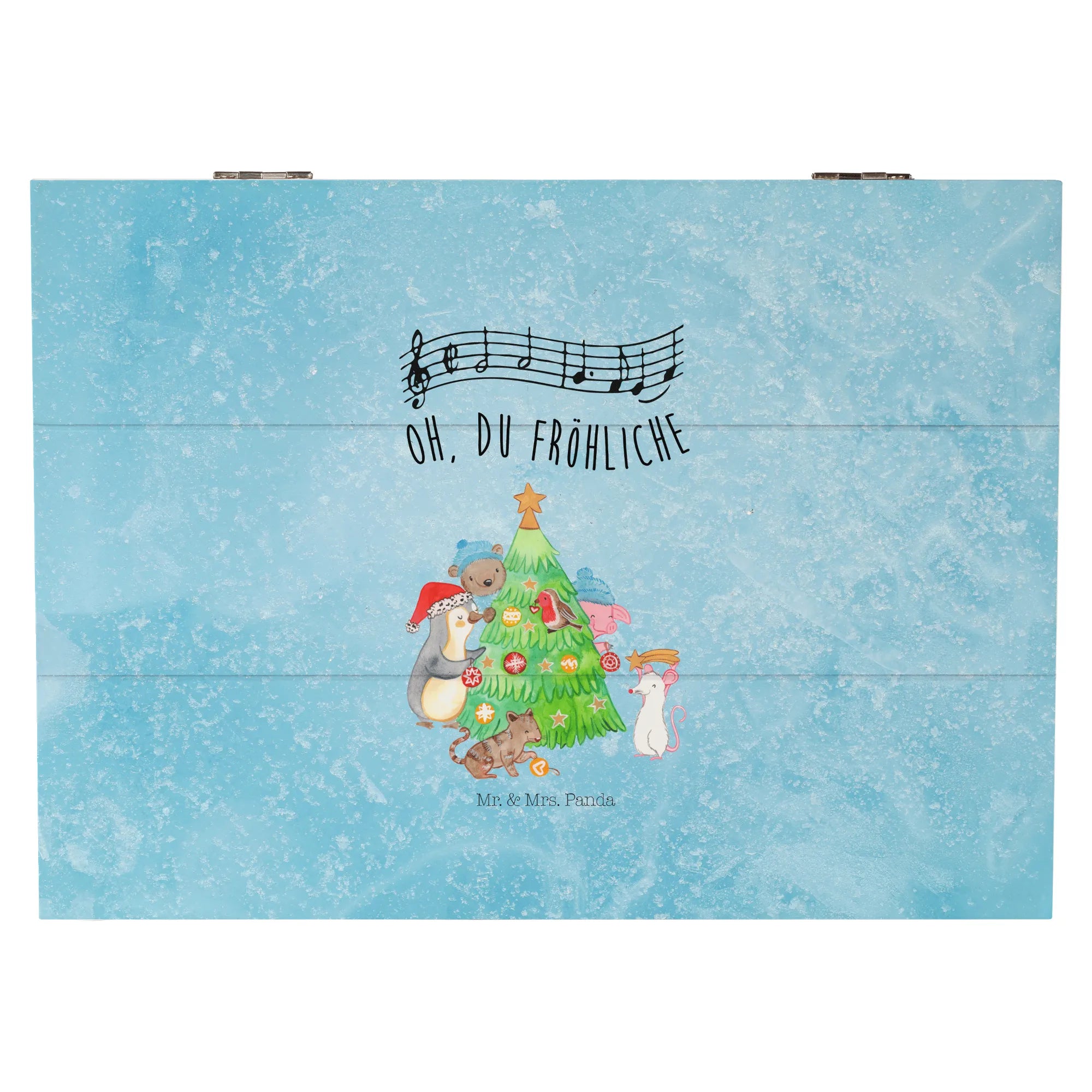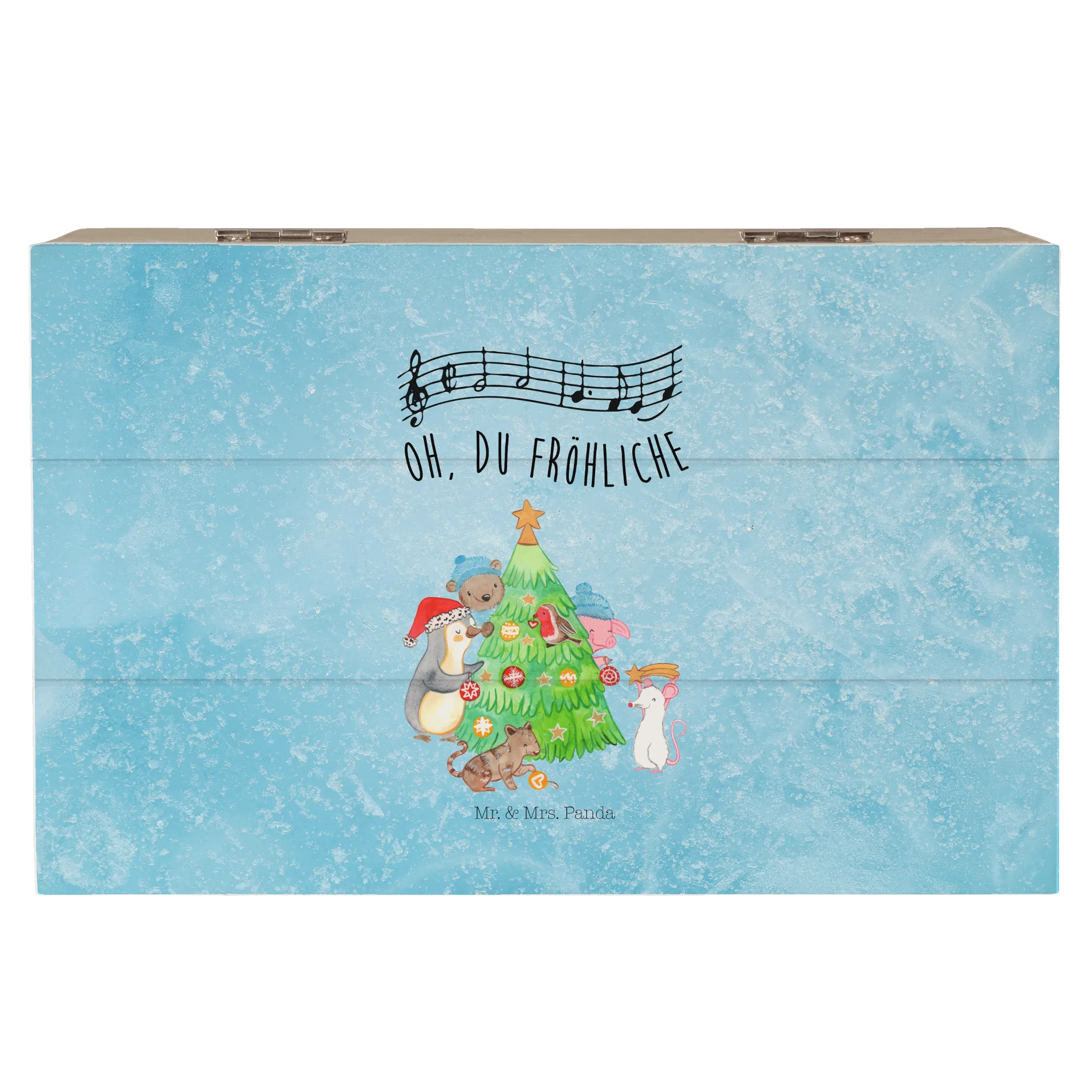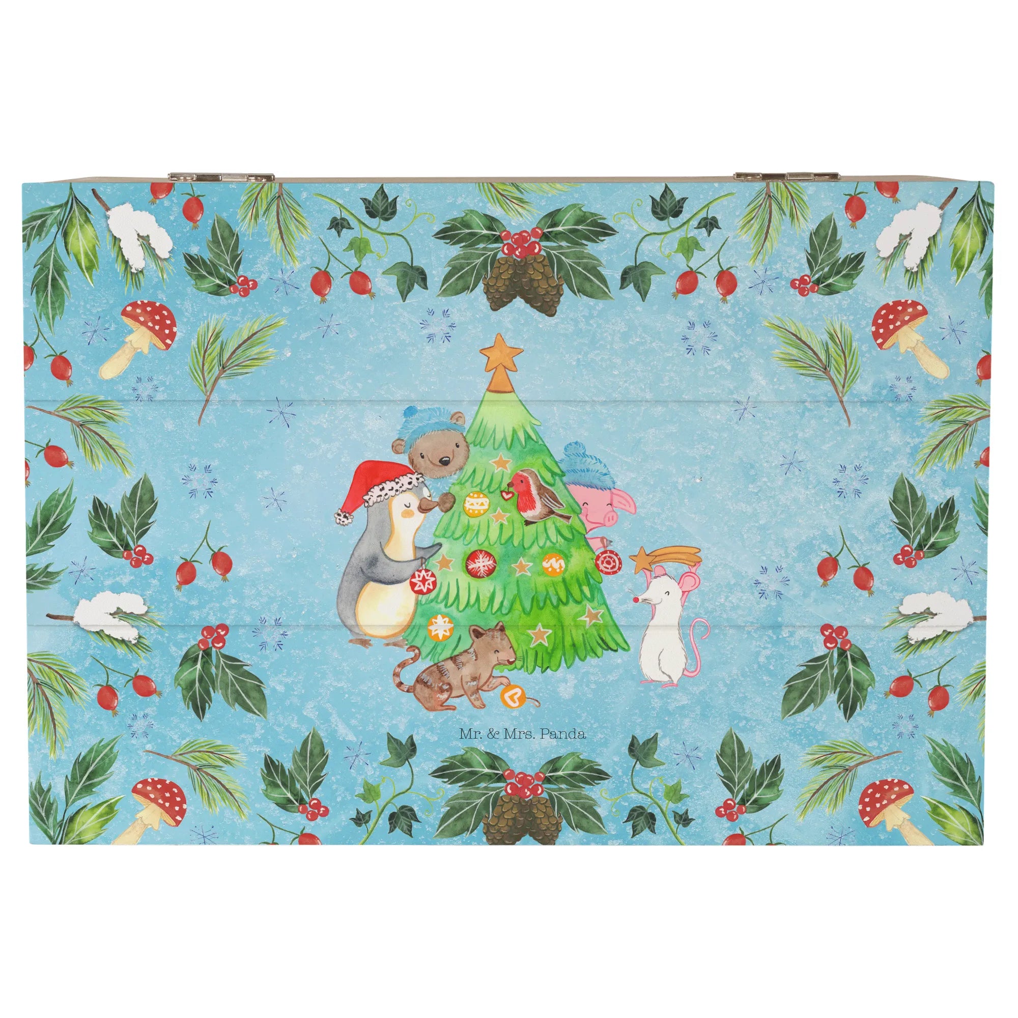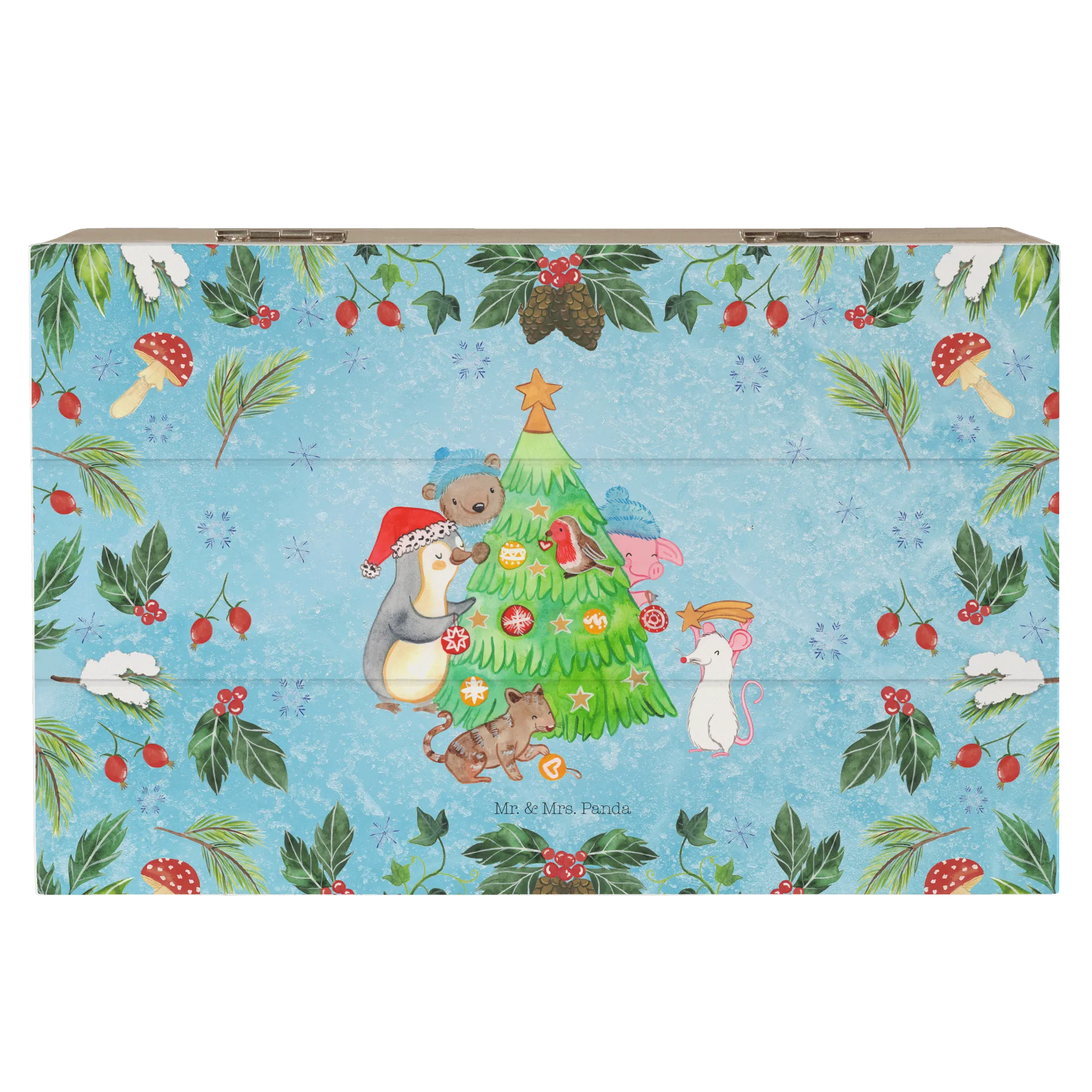 Entdecke die wunderschöne Holzkiste aus der Winter Kollektion von Mr. & Mrs. Panda, die nicht nur funktional, sondern auch ein echter Blickfang ist. Diese bezaubernde Aufbewahrungsbox in edlem Eisblau zeigt ein kreatives Motiv: Ein Pinguin, ein Schwein, eine Maus, eine Katze und ein Bär schmücken fröhlich einen Weihnachtsbaum. Diese Szene bringt dich sofort in die festliche Stimmung der Weihnachtszeit.