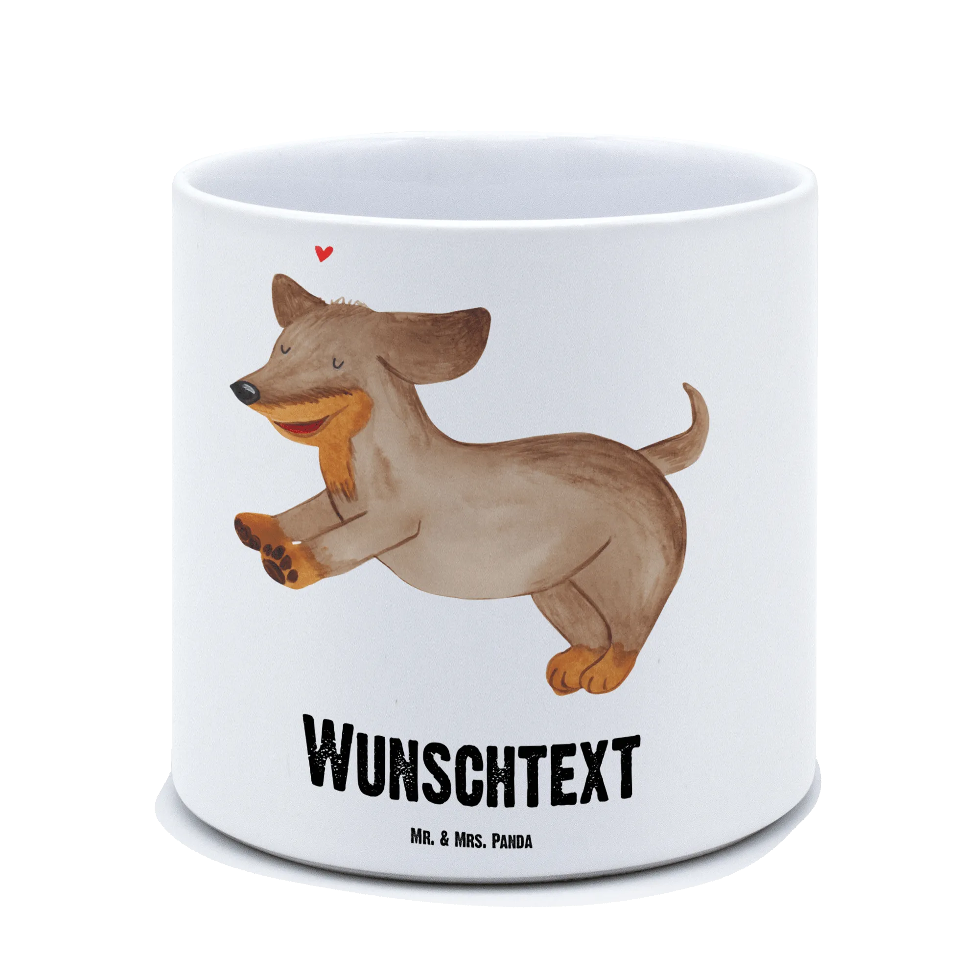Erlebe die Freude an Pflanzen mit dem personalisierten XL Blumentopf Hund Dackel fröhlich aus der Hunde Kollektion von Mr. & Mrs. Panda! Dieser liebevoll gestaltete Blumentopf ist nicht nur ein echter Hingucker, sondern bringt auch eine Prise Lebensfreude in dein Zuhause oder deinen Garten.