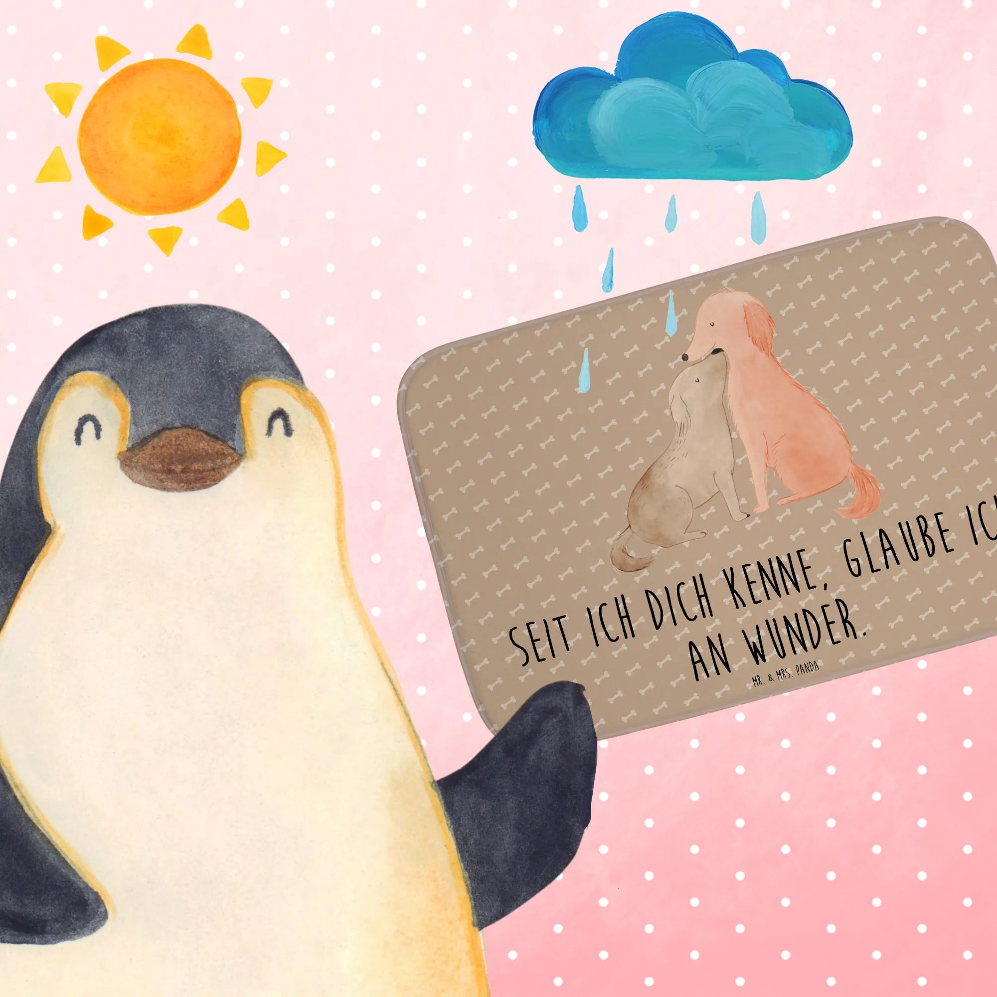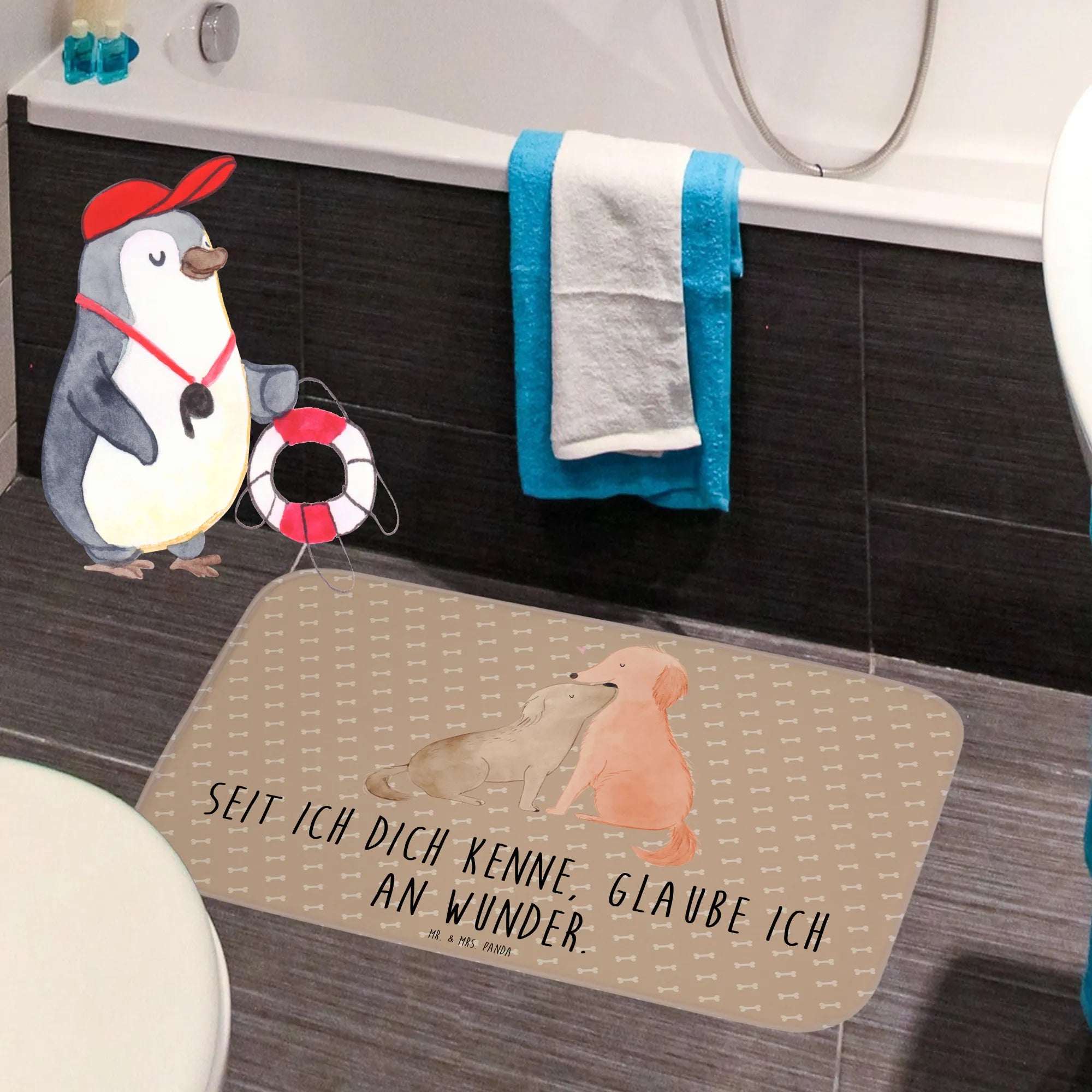 Entdecke den perfekten Badvorleger von Mr. & Mrs. Panda mit dem bezaubernden Motiv "Hunde Liebe"! Dieser Badteppich ist nicht nur ein echter Hingucker in deinem Badezimmer, sondern auch unglaublich praktisch und hygienisch. Die Vorderseite besteht aus flauschiger Premium-Kunstfaser, die nicht nur ein gemütliches Gefühl unter den Füßen vermittelt, sondern auch dazu beiträgt, dein Badezimmer in einen Wohlfühlort zu verwandeln. Die rutschfeste Gummibeschichtung sorgt dafür, dass du auch nach dem Duschen sicher und stabil stehst. Das süße Motiv, das zwei niedliche Hunde zeigt, die liebevoll kuscheln, strahlt Wärme und Geborgenheit aus und versüßt dir jeden Morgen.