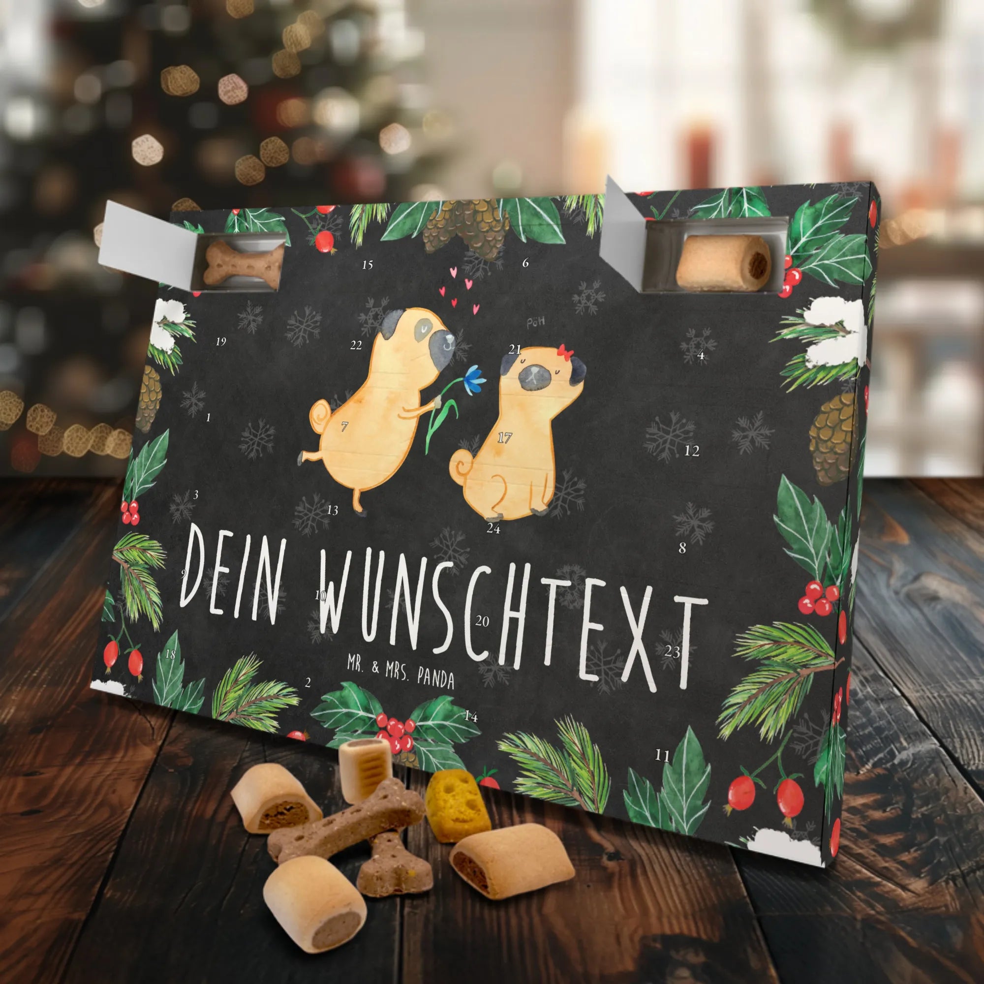 Der personalisierte Hunde Adventskalender Mops verliebt von Mr. & Mrs. Panda ist das perfekte Geschenk für alle Hundeliebhaber, die ihren vierbeinigen Freunden zur Adventszeit eine besondere Freude bereiten möchten. Mit seinem bezaubernden Motiv von zwei niedlichen Mopsen, die verliebt dastehen und einander eine Blume schenken, bringt dieser Adventskalender sofort gute Laune in jedes Zuhause. Ob für Hundebesitzer, Tierliebhaber oder als romantisches Geschenk für deinen Partner – dieser Kalender ist ein echter Hingucker und sorgt garantiert für strahlende Augen!