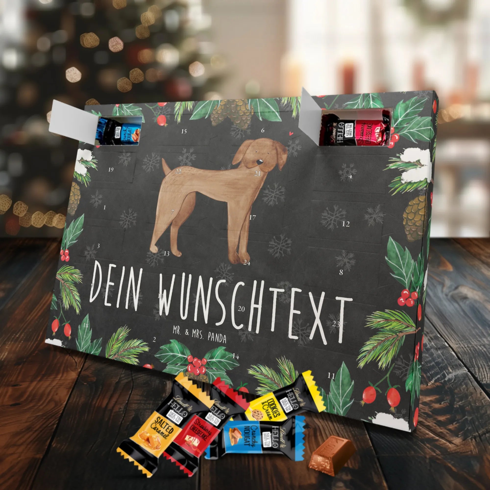 Unser Personalisierter Schoko-Adventskalender von Mr. & Mrs. Panda bringt Freude ins Adventsfenster und zaubert jedem ein Lächeln aufs Gesicht. Du gestaltest ihn ganz individuell: wähle deinen Wunschtext oder Namen und wir drucken ihn auf den Kalender – inklusive bedruckter Seitenflächen für ein rundum schönes Ergebnis. Die seidenmatte Oberflächenveredelung sorgt für eine elegante Haptik, während die brillante Druckqualität die Motive zum Strahlen bringt. Der Kalender ist flexibel einsetzbar, denn er kann aufgehängt oder einfach aufgestellt werden. Gefüllt mit Lindt Hello: 24 einzelne Schokoladen Mini Sticks in vier leckeren Geschmacksrichtungen (Karamell-Schokoladenkuchen, Kekse, Knuspriger Nougat, Erdbeer-Cheesecake). Zutaten und Allergene (Milcheiweiß, Milchzucker, Soja, Weizen, Haselnüsse; kann Mandeln und andere Schalenfrüchte enthalten) sind ausgewiesen. Ideal als persönliches Geschenk für Familienmitglieder, Freundinnen oder für dich selbst – mit viel Liebe gestaltet von Mr. & Mrs. Panda. Maße: 325 mm x 225 mm x 27 mm, praktische Größe für Regal oder Wand.