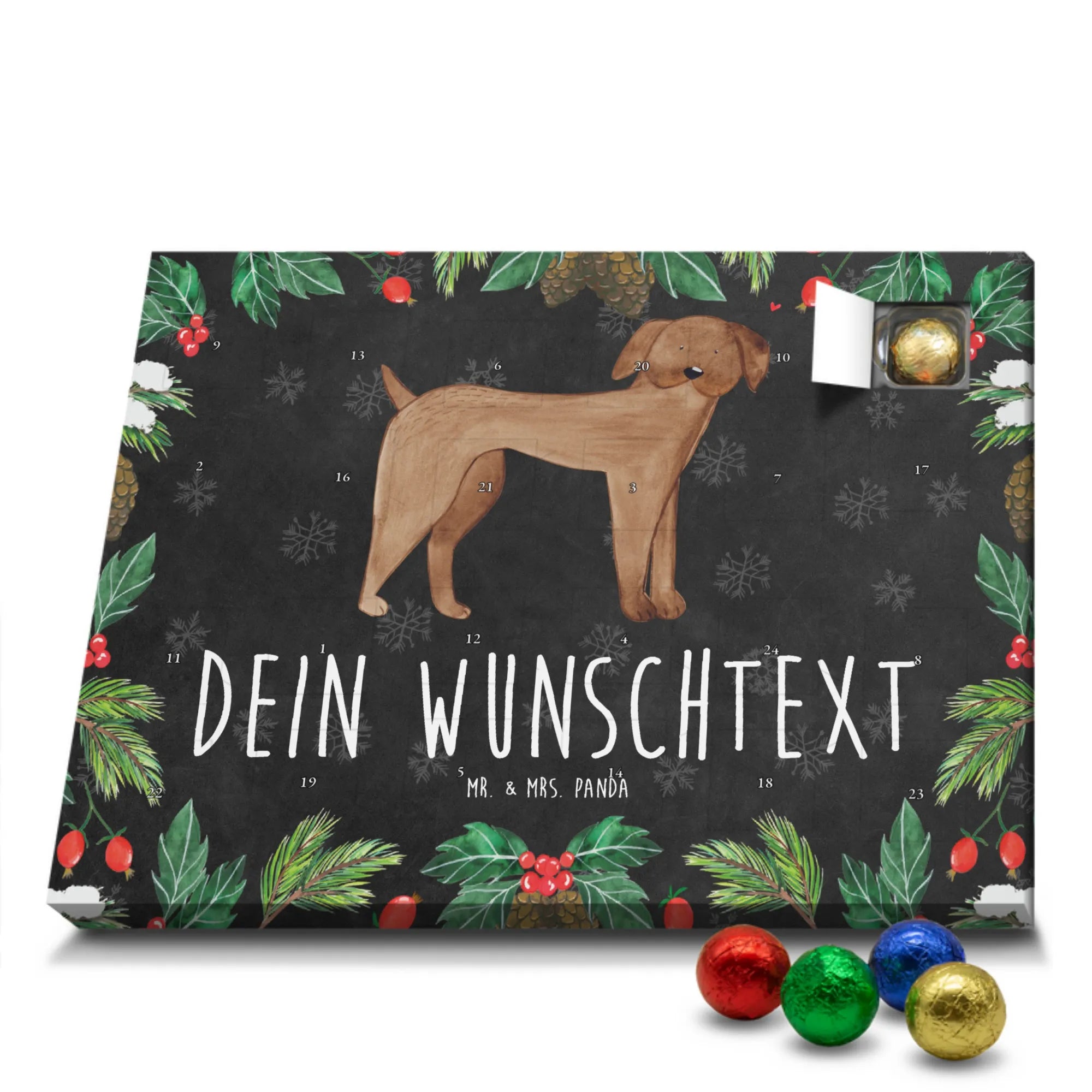 Du suchst einen besonderen Adventskalender? Unser Personalisierter Schoko-Adventskalender von Mr. & Mrs. Panda ist perfekt für dich! Er ist liebevoll gestaltet, mit vielen süßen Motiven und kurzen Sprüchen bedruckt und lässt sich ganz individuell mit deinem Wunschnamen oder einem Wunschtext personalisieren. Die hochwertige Bedruckung erhält durch eine seidenmatte Veredelung einen edlen Look, und auch die Seitenflächen sind komplett bedruckt – so wirkt der Kalender von vorne bis hinten durchgestylt. Maße: 233 mm x 178 mm x 24 mm. Eine tolle Besonderheit: Du kannst ihn aufstellen oder an die Wand hängen, je nachdem, wo er bei dir am besten zur Geltung kommt. Gefüllt ist der Kalender mit MARKENNAMEN Schokolade sowie leckeren Schokoladenkugeln für echte Genießer. Bitte beachten: (Kann Spuren von Haselnüssen, Mandeln, Gluten und Soja enthalten!), kühl und trocken lagern! Ob als Geschenk für Freunde oder als personalisierte Überraschung für dich selbst – dieser Kalender bringt Freude und süße Momente in die Vorweihnachtszeit. Hol ihn dir und gestalte deinen Advent mit persönlicher Note und liebevollen Panda-Motiven.