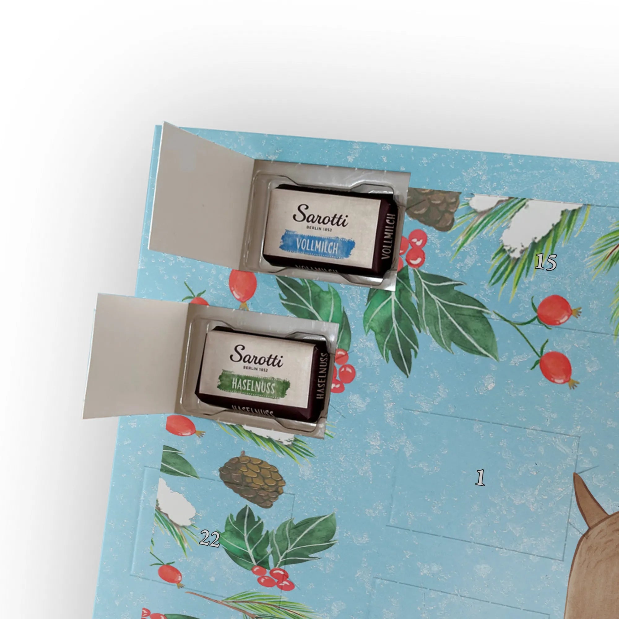Wundervoller Adventskalender mit persönlicher Note – der Personalisierte Schoko Adventskalender von Mr. & Mrs. Panda ist eine liebevolle Geschenkidee, die dich oder deine Liebsten durch die Dezembertage begleitet. Bedruckt mit einzigartigen Motiven und charmanten Sprüchen von Mr. & Mrs. Panda, kannst du den Kalender mit deinem Namen oder einem kurzen Wunschtext individuell gestalten. Die seidenmatte Oberflächenveredelung bringt die Farben besonders schön zur Geltung, und die bedruckten Seitenflächen sorgen für ein rundum stimmiges Design. Maße: 355 mm x 245 mm x 11 mm. Praktisch: Der Kalender lässt sich sowohl hängen als auch aufstellen. Gefüllt ist er mit 24 einzeln verpackten Schokoladentäfelchen in vier leckeren Geschmacksrichtungen. Insgesamt enthält er 107 g Markenschokolade von Sarotti® und Confiserie Heidel® – Geschmacksrichtungen: Vollmilch, Nougat, Zartbitter und Haselnuss. Wichtig zu wissen: Es handelt sich um einen Kalender gefüllt mit Sarotti® und Confiserie Heidel® Markenschokolade. Ob als persönliches Geschenk, Mitbringsel oder Überraschung – dieser Adventskalender bringt jeden Tag süße Freude und ein Lächeln ins Gesicht.