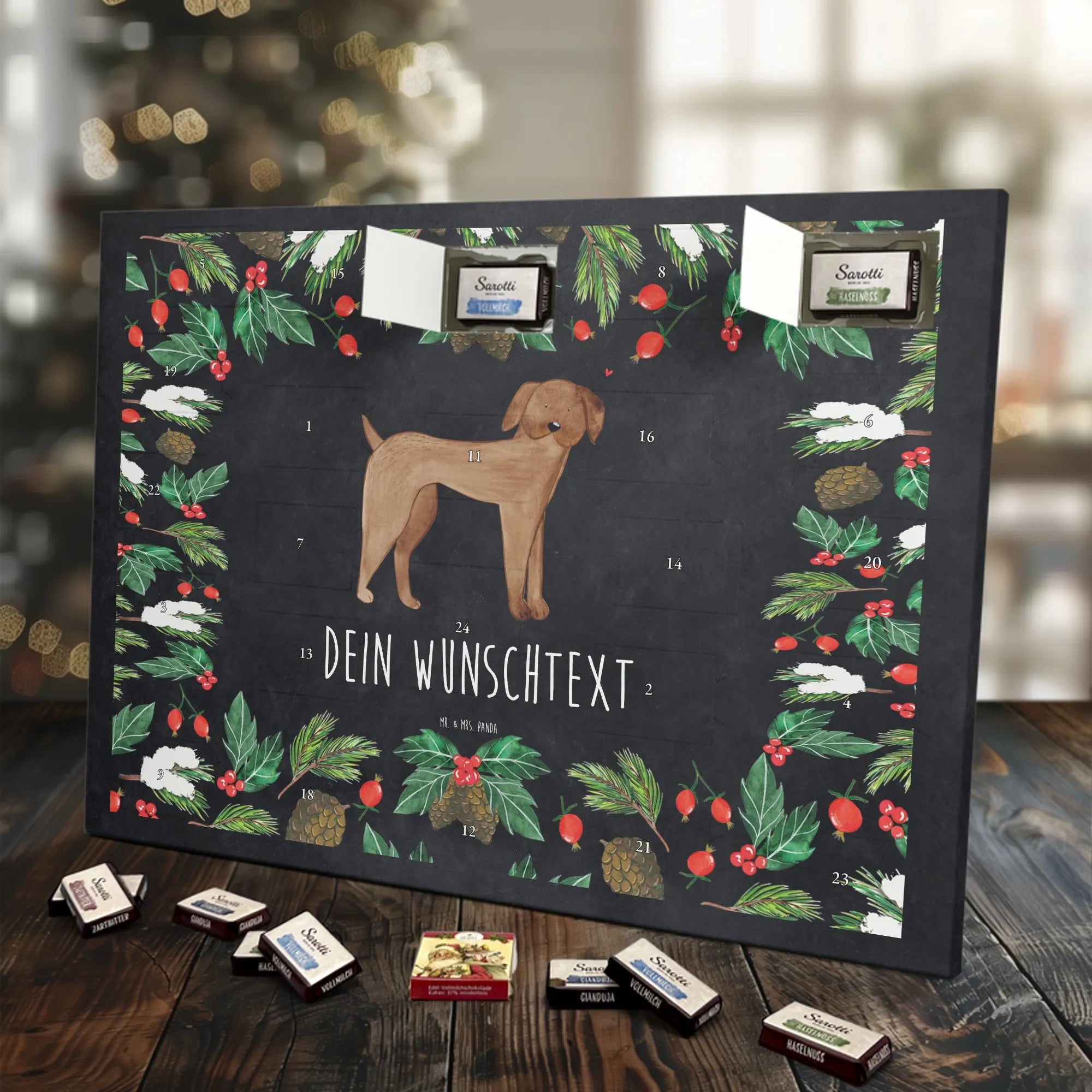 Der perfekte Adventskalender für individuelle Geschenkideen: Adventskalender mit Namen von Mr. & Mrs. Panda. Dieser Kalender ist mit liebevollen Motiven und frechen Sprüchen bedruckt und kann mit deinem Wunschtext oder Namen personalisiert werden – so wird jedes Türchen zur persönlichen Überraschung. Die brillante Druckqualität und die seidenmatte Oberflächenveredelung geben dem Kalender ein hochwertiges Aussehen, und die bedruckten Seitenflächen runden das Design ab. Maße: 355 mm x 245 mm x 11 mm. Du kannst den Kalender an die Wand hängen oder einfach aufstellen – praktisch und schön zugleich. Gefüllt ist er mit 24 einzeln verpackten Schokoladentäfelchen in vier köstlichen Geschmacksrichtungen. Insgesamt enthält er 107 g Markenschokolade von Sarotti® und Confiserie Heidel® in den Sorten Vollmilch, Nougat, Zartbitter und Haselnuss. Hinweis: Es handelt sich um einen Kalender gefüllt mit Sarotti® und Confiserie Heidel® Markenschokolade. Ob als liebevolles Geschenk für Kinder, Partner oder Freundinnen und Freunde – dieser Adventskalender sorgt für tägliche Vorfreude und süße Genussmomente.