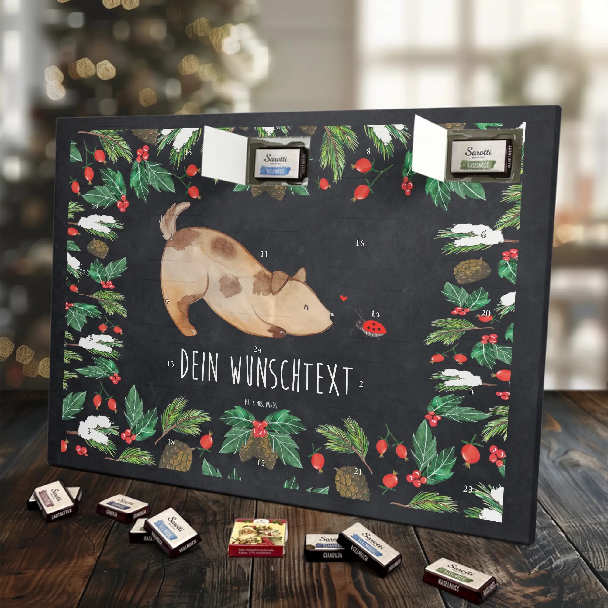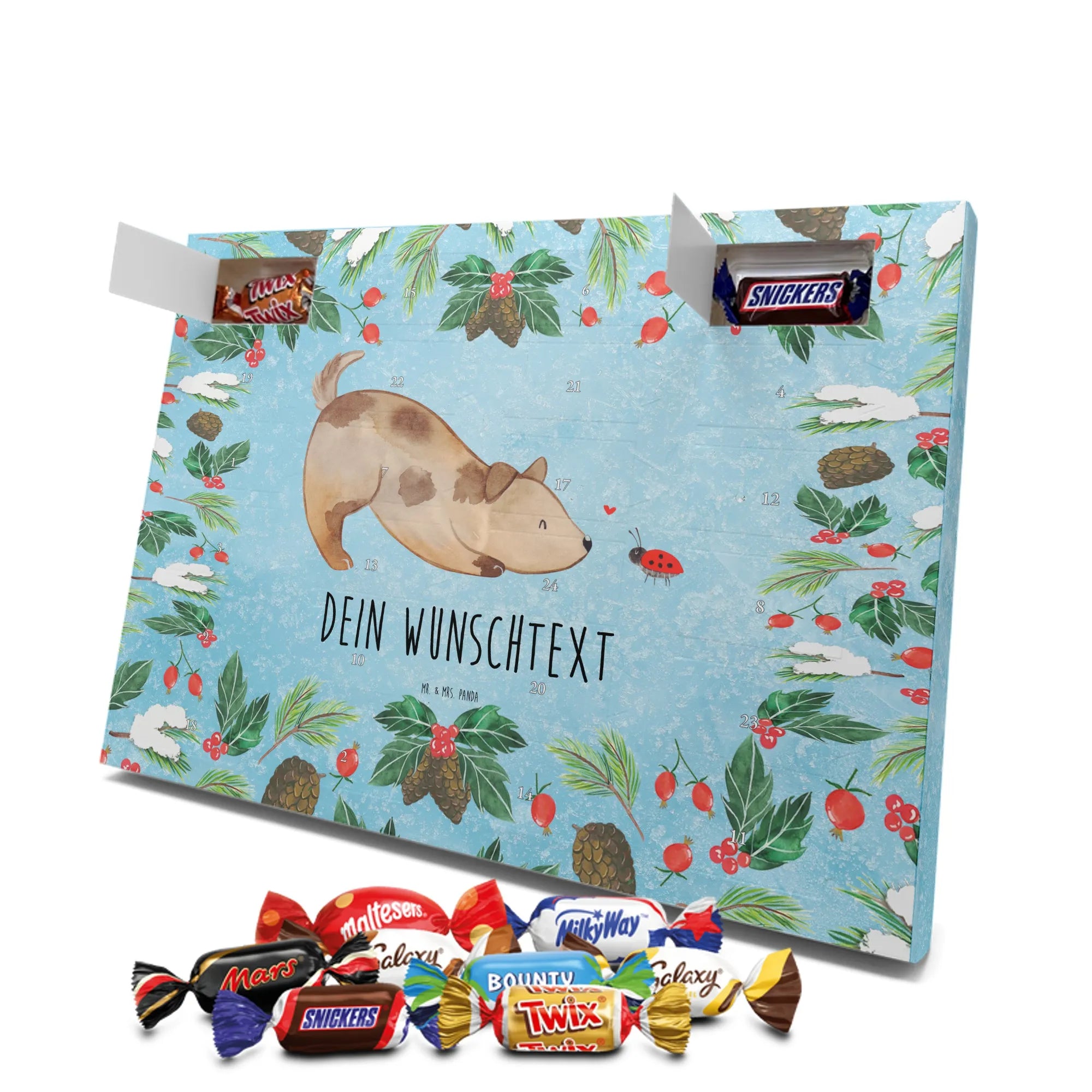 Verschenke Vorfreude mit Herz: Unser personalisierter Schoko Adventskalender Hund Marienkäfer aus der Hunde Kollektion von Mr. & Mrs. Panda ist das ideale Geschenk für Hundebesitzer, Tierfreunde und alle, die es liebevoll und persönlich mögen. Auf dem Vordergrund blickt ein süßer Mischlingshund voller Neugier auf einen kleinen Marienkäfer – ein Motiv, das lächeln lässt und sofort sympathisch wirkt.