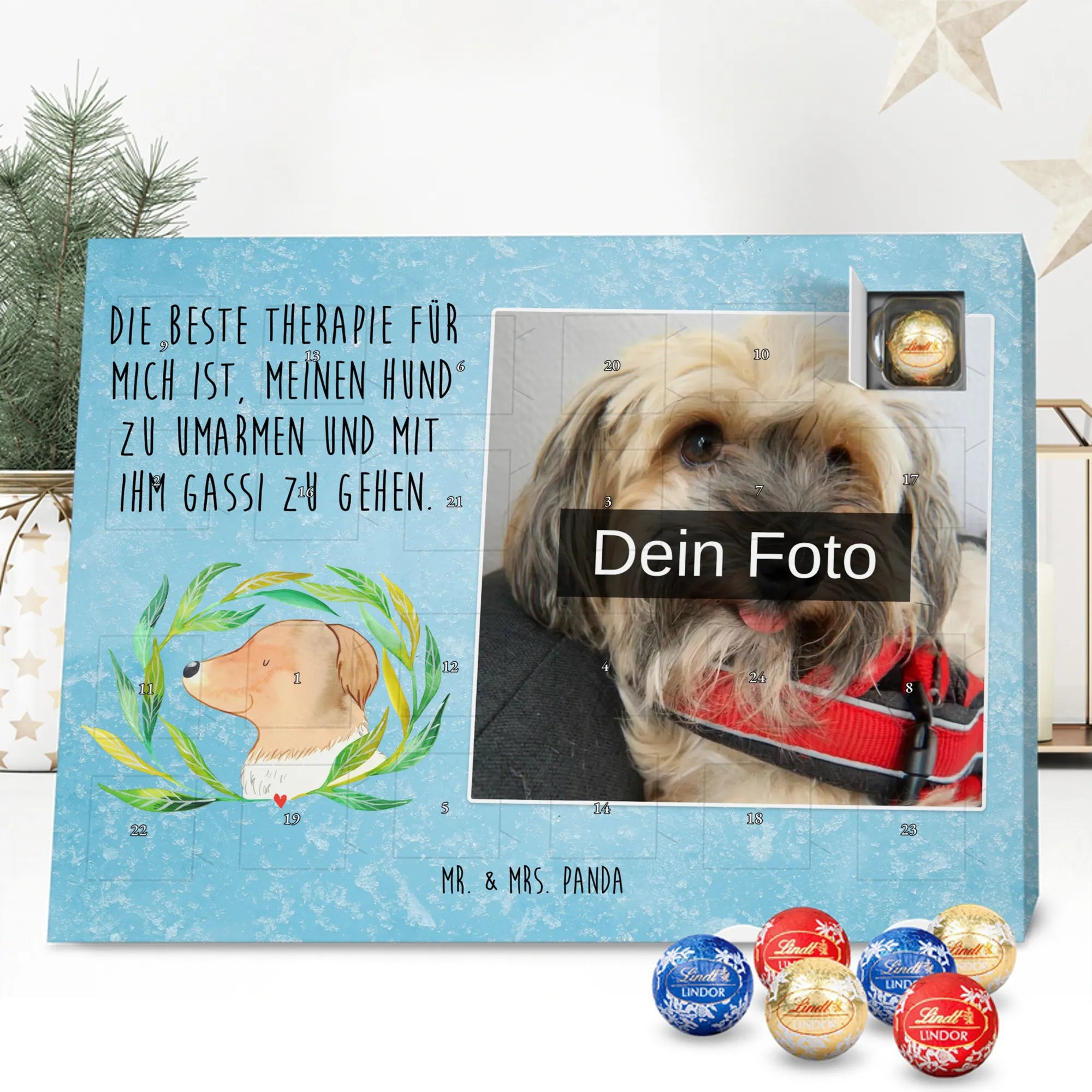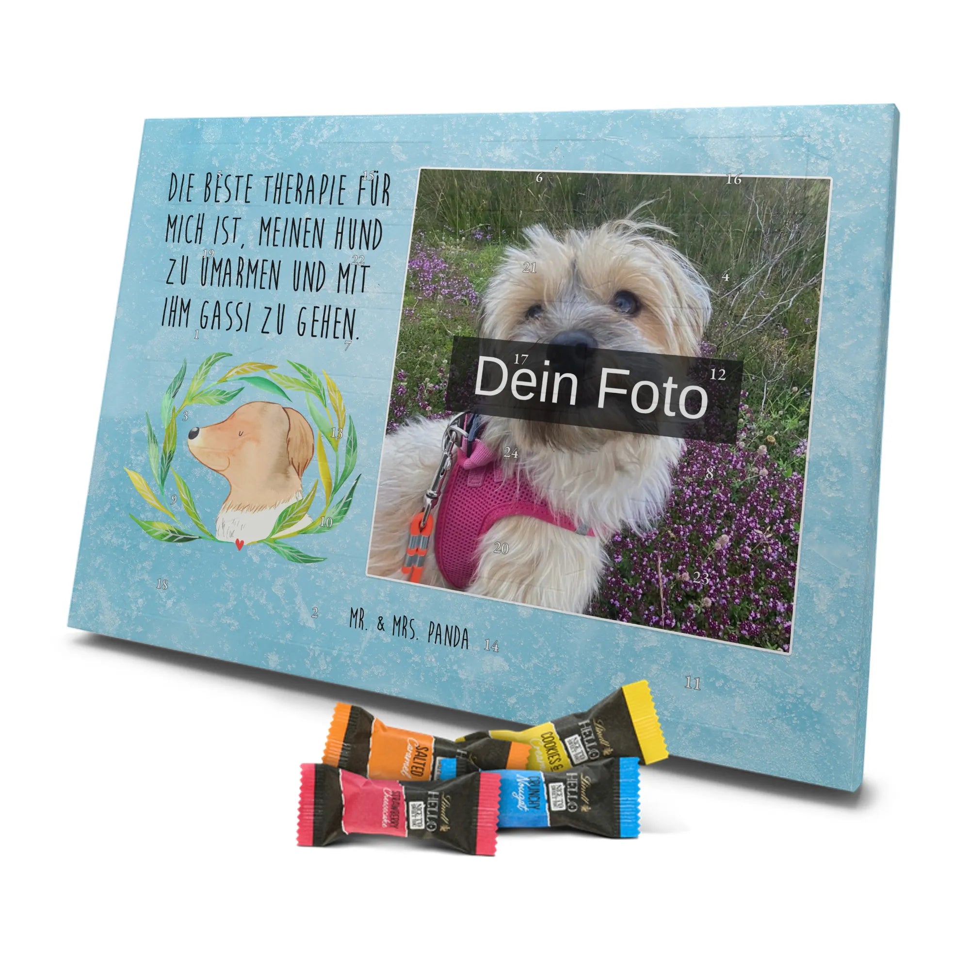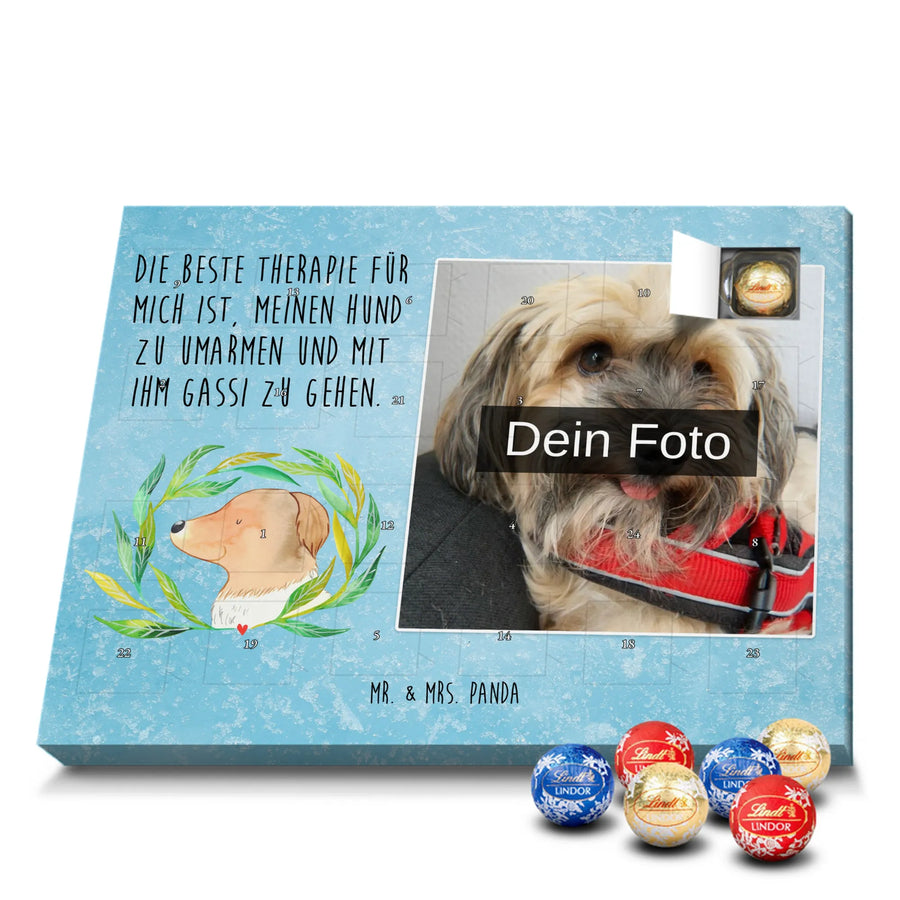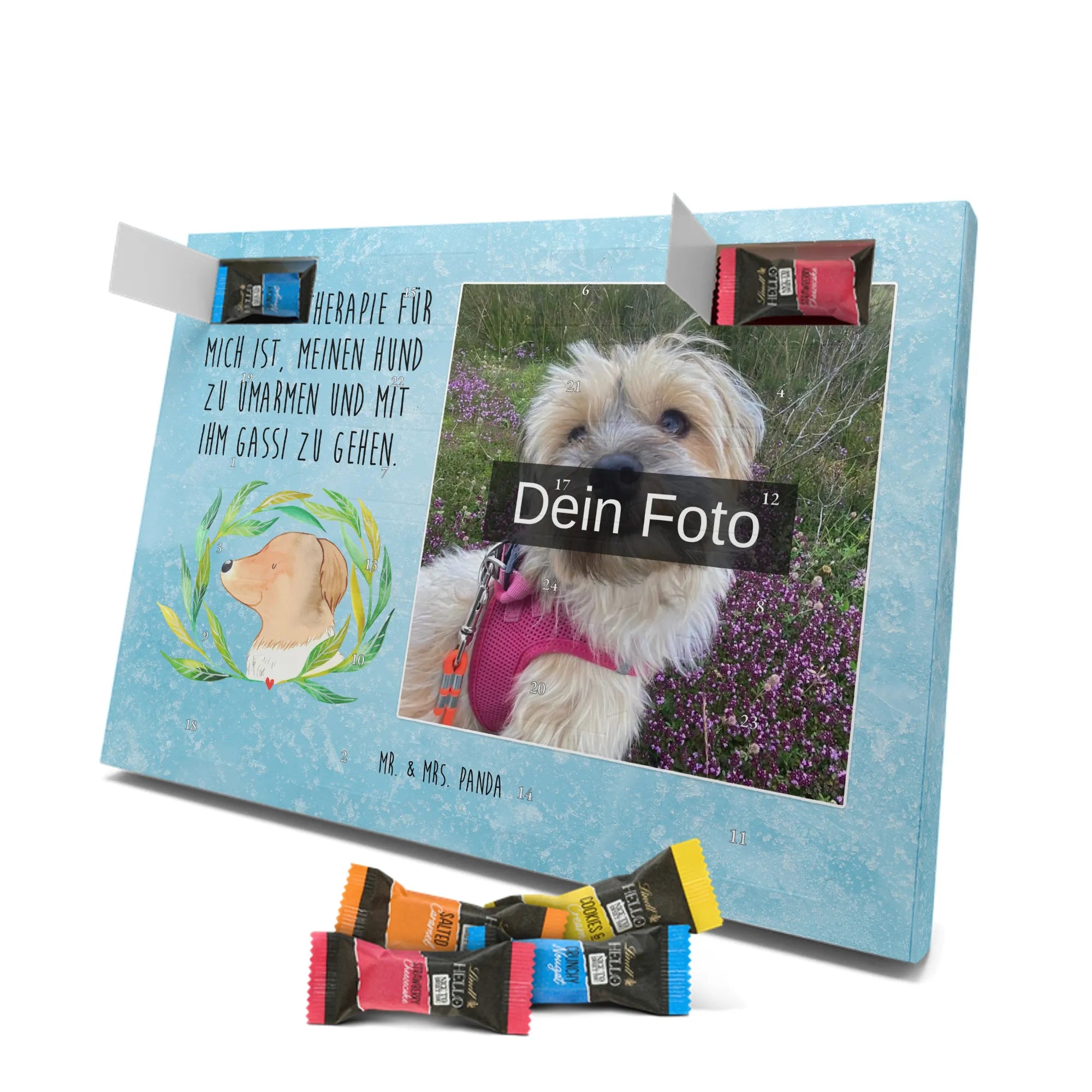 Personalisierter Schoko Foto Adventskalender Hund Blumen - Lindt LINDOR - Eisblau