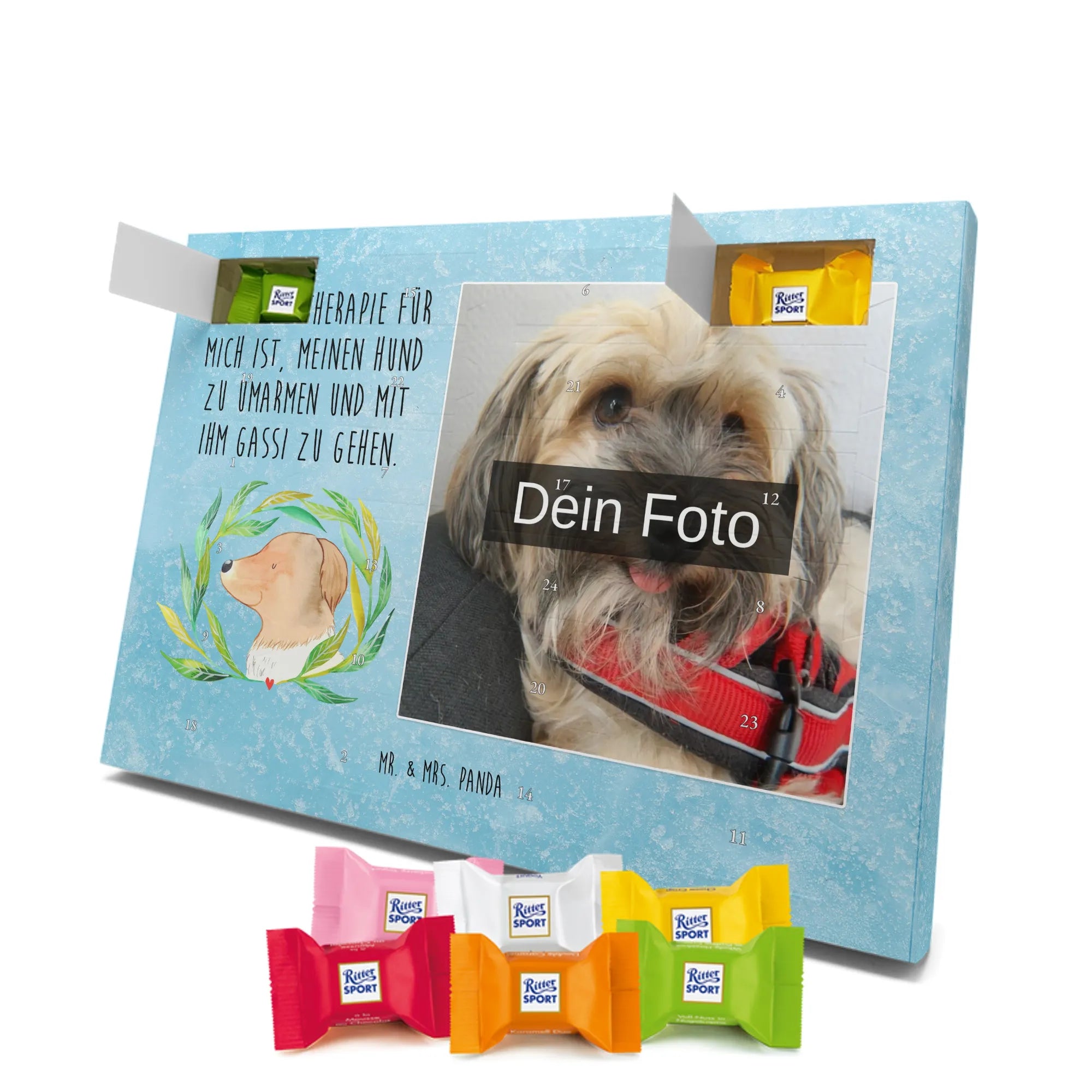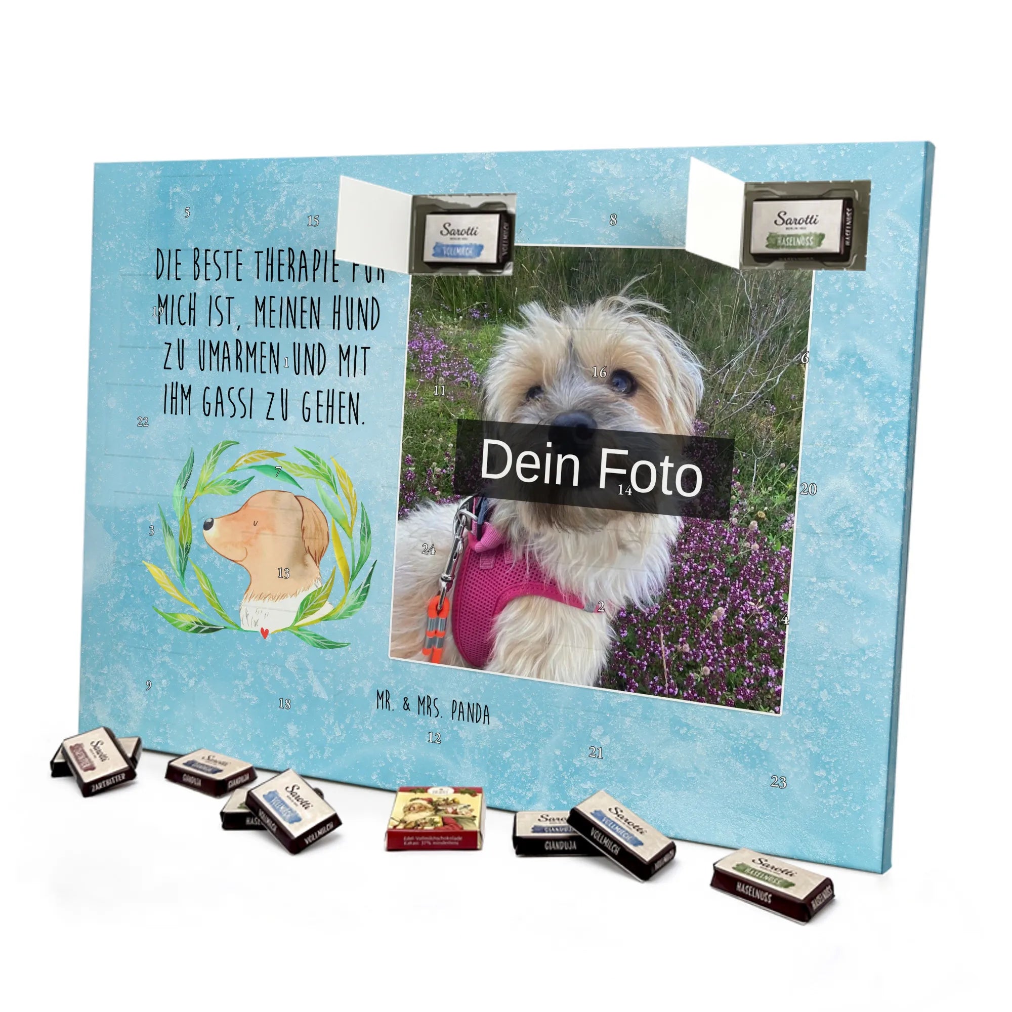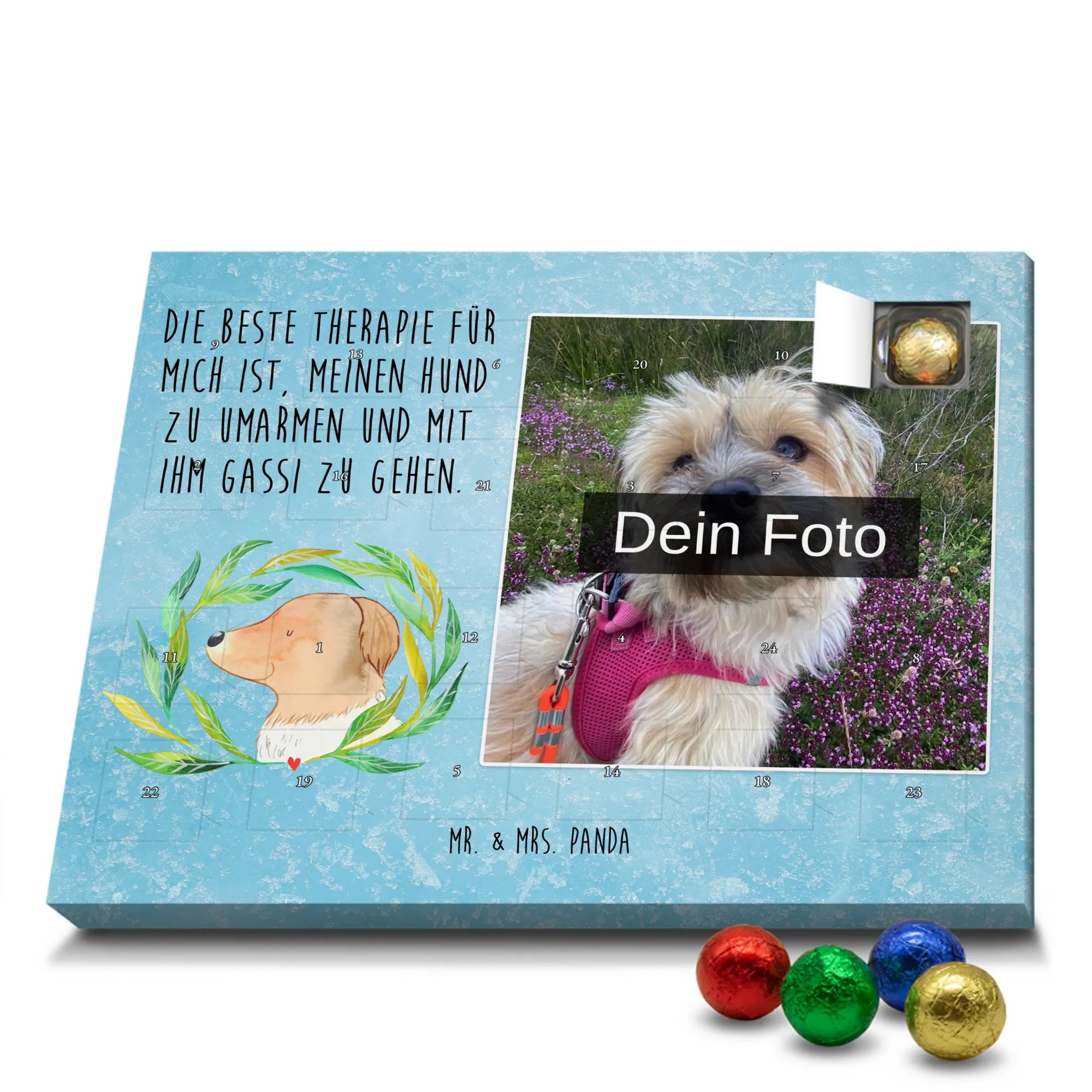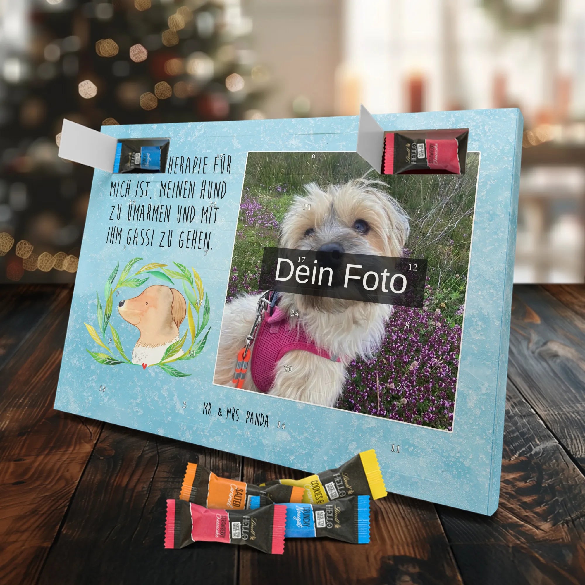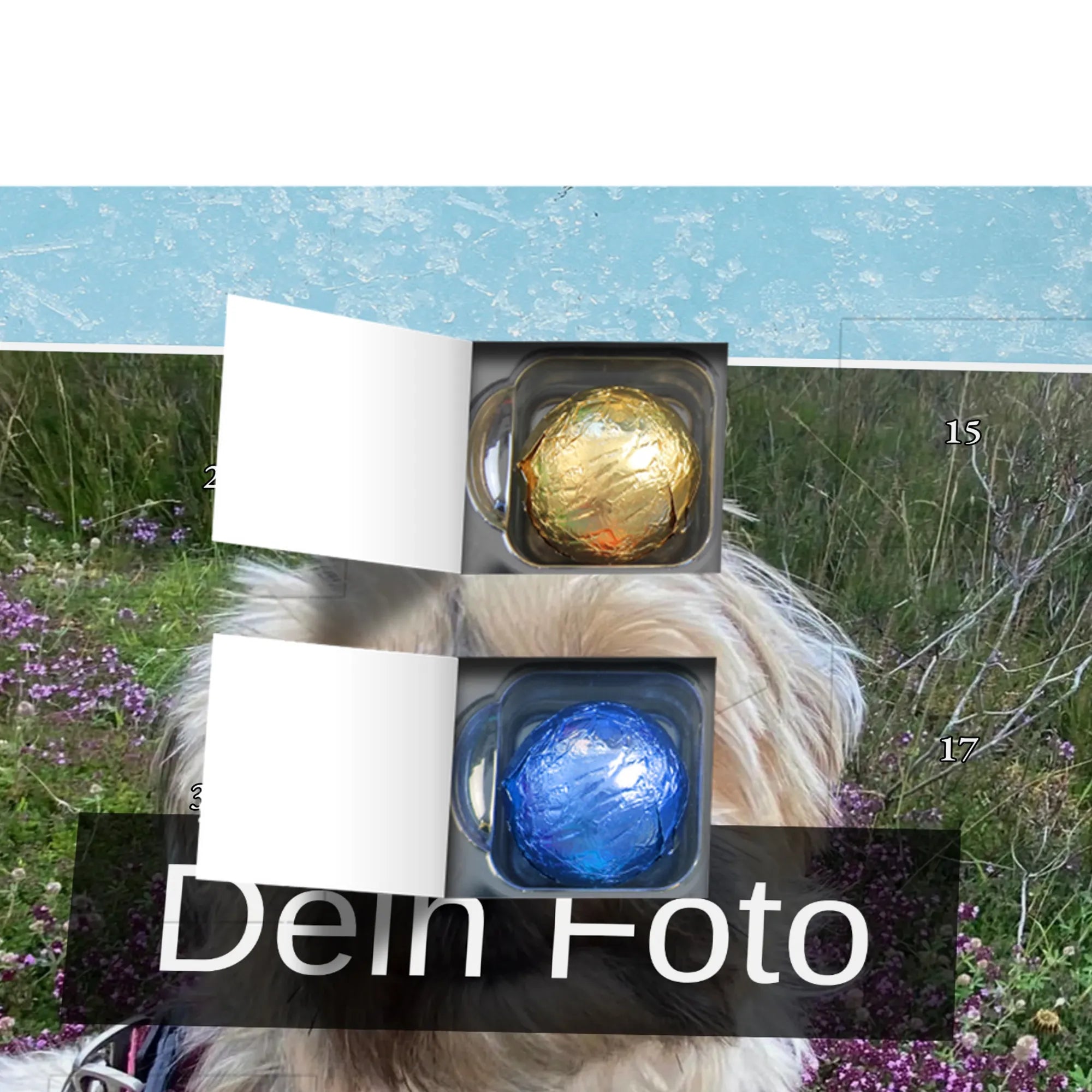 Personalisierter Schoko Foto Adventskalender Hund Blumen - Lindt LINDOR - Eisblau