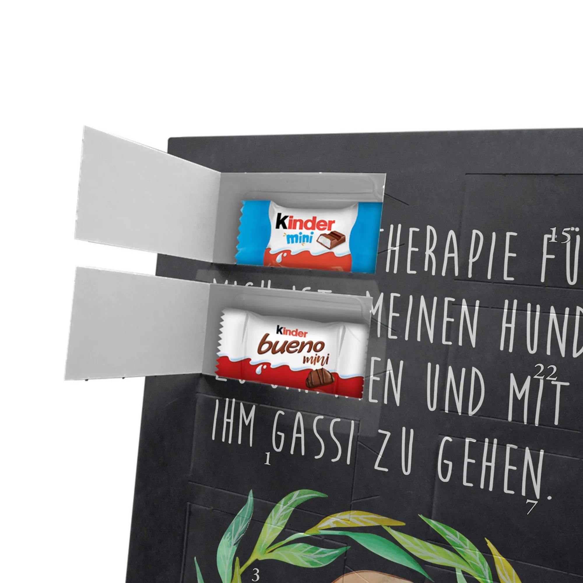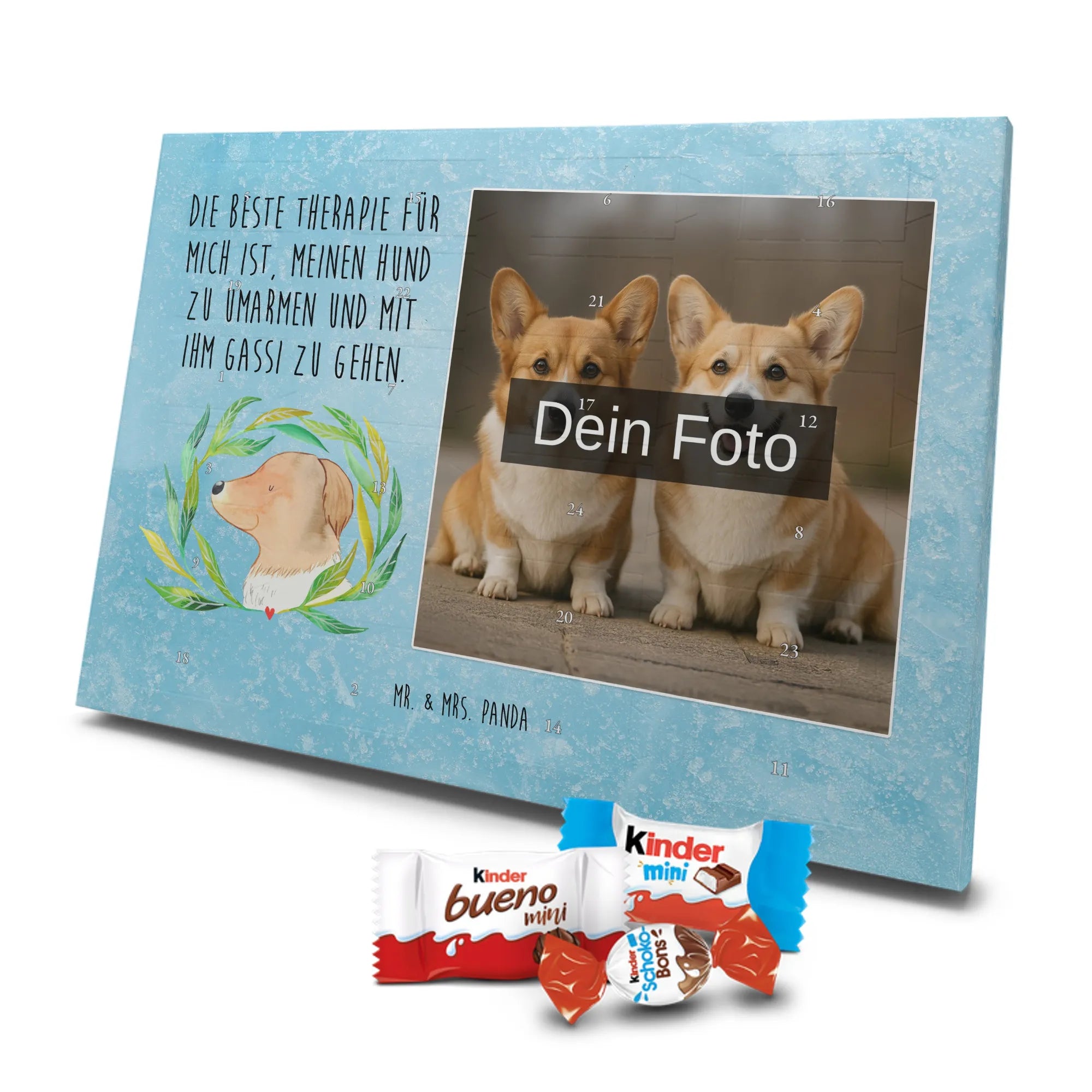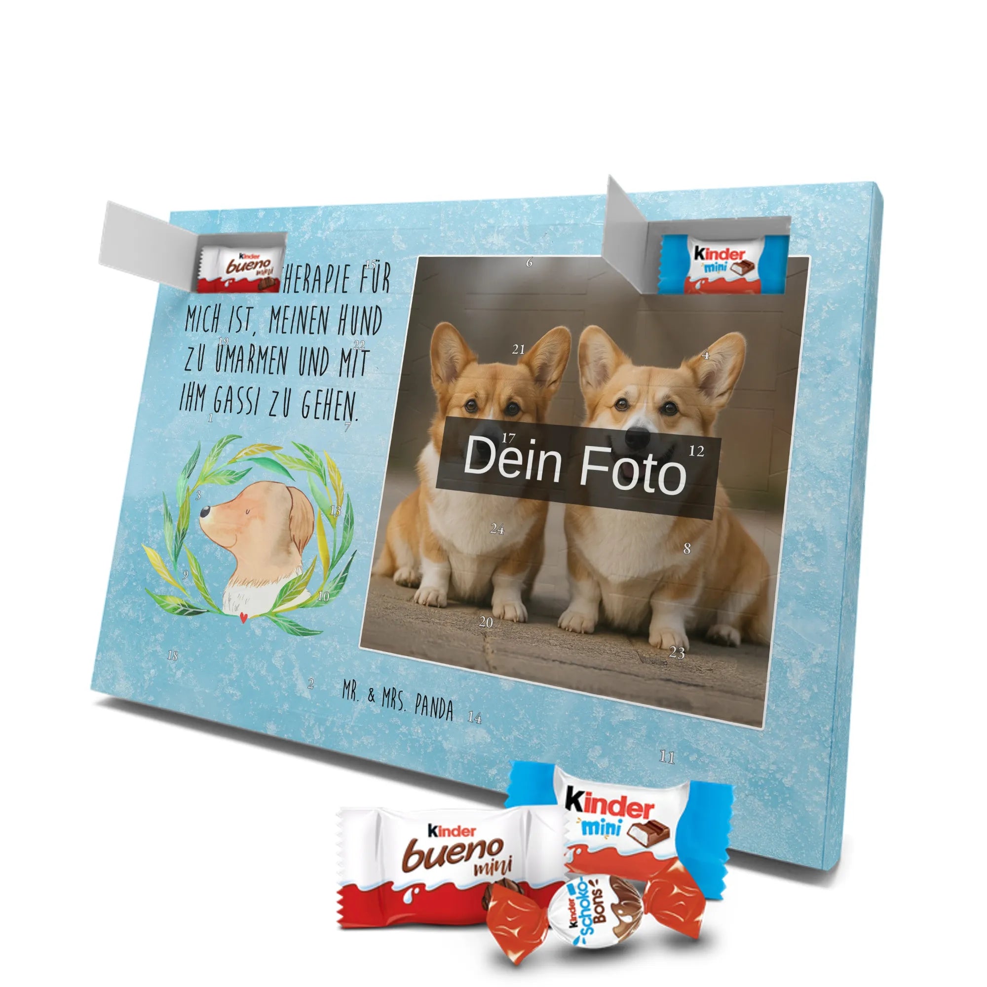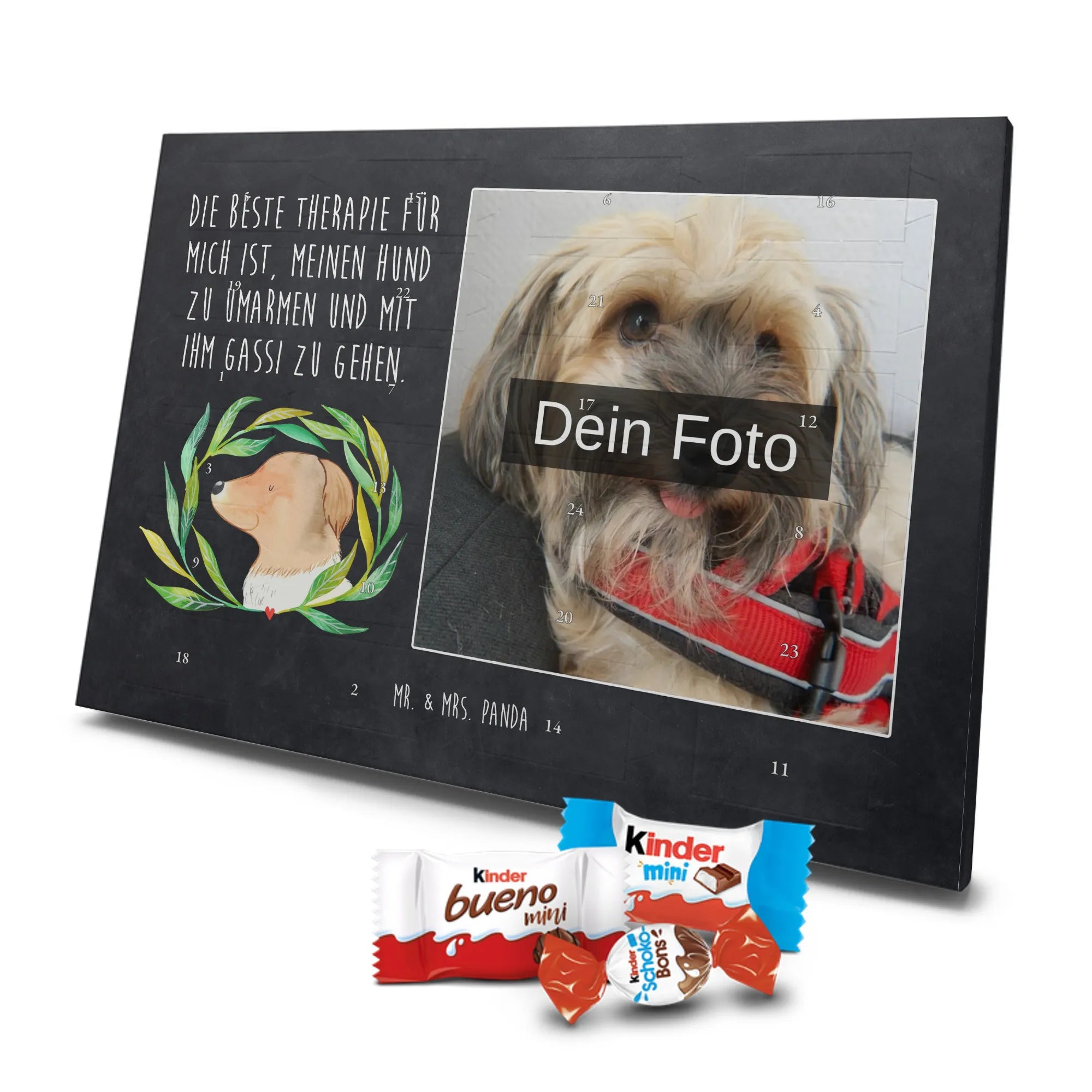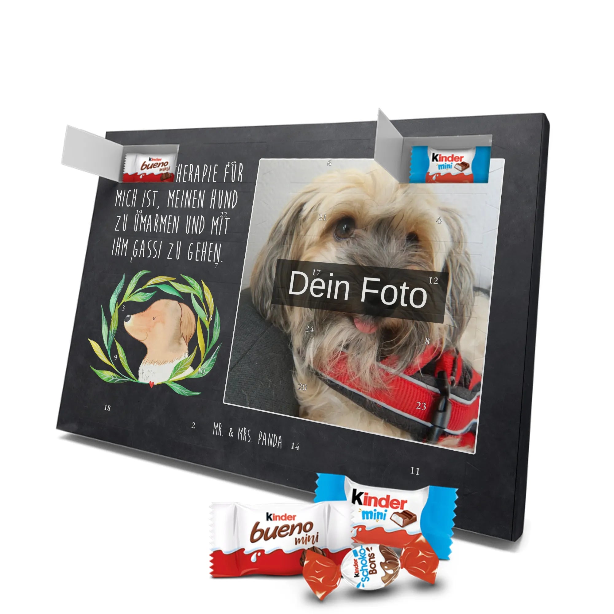 Unser personalisierten Schoko Foto Adventskalender ist ein echtes Highlight in der Adventszeit – handlich, individuell und voller süßer Überraschungen. Du personalisierst die Vorderseite mit deinem liebsten Foto und wir kombinieren es mit liebevollen Motiven und Sprüchen von Mr. & Mrs. Panda. Bitte achte auf eine ausreichende Bildauflösung und einen passenden Bildausschnitt, damit das Druckergebnis gestochen scharf ist. Lade nur Bilder hoch, deren Rechte du besitzt oder bei denen du die Erlaubnis hast, besonders wenn Personen darauf zu sehen sind. Wichtig: Fotos werden nicht retuschiert oder zugeschnitten; personalisierte Foto-Artikel sind vom Widerruf ausgeschlossen. Der Kalender besticht durch brillante Druckqualität und eine seidenmatte Oberflächenveredelung sowie bedruckte Seitenflächen. Maße: 355 mm x 245 mm x 11 mm. Du kannst ihn entweder aufstellen oder an die Wand hängen. Gefüllt ist der Adventskalender mit kinder® Schokolade, inklusive kinder® Schoko-Bons, kinder® Bueno mini und kinder® Schokolade mini. Ein liebevolles, persönliches Geschenk für Kinder, Freunde oder die bessere Hälfte – individuell, süß und mit dem typischen Mr. & Mrs. Panda Charme.