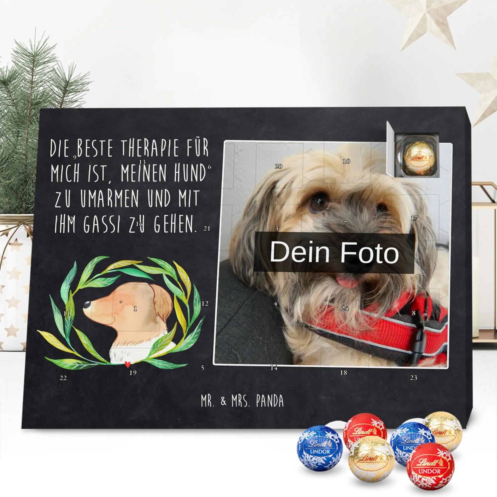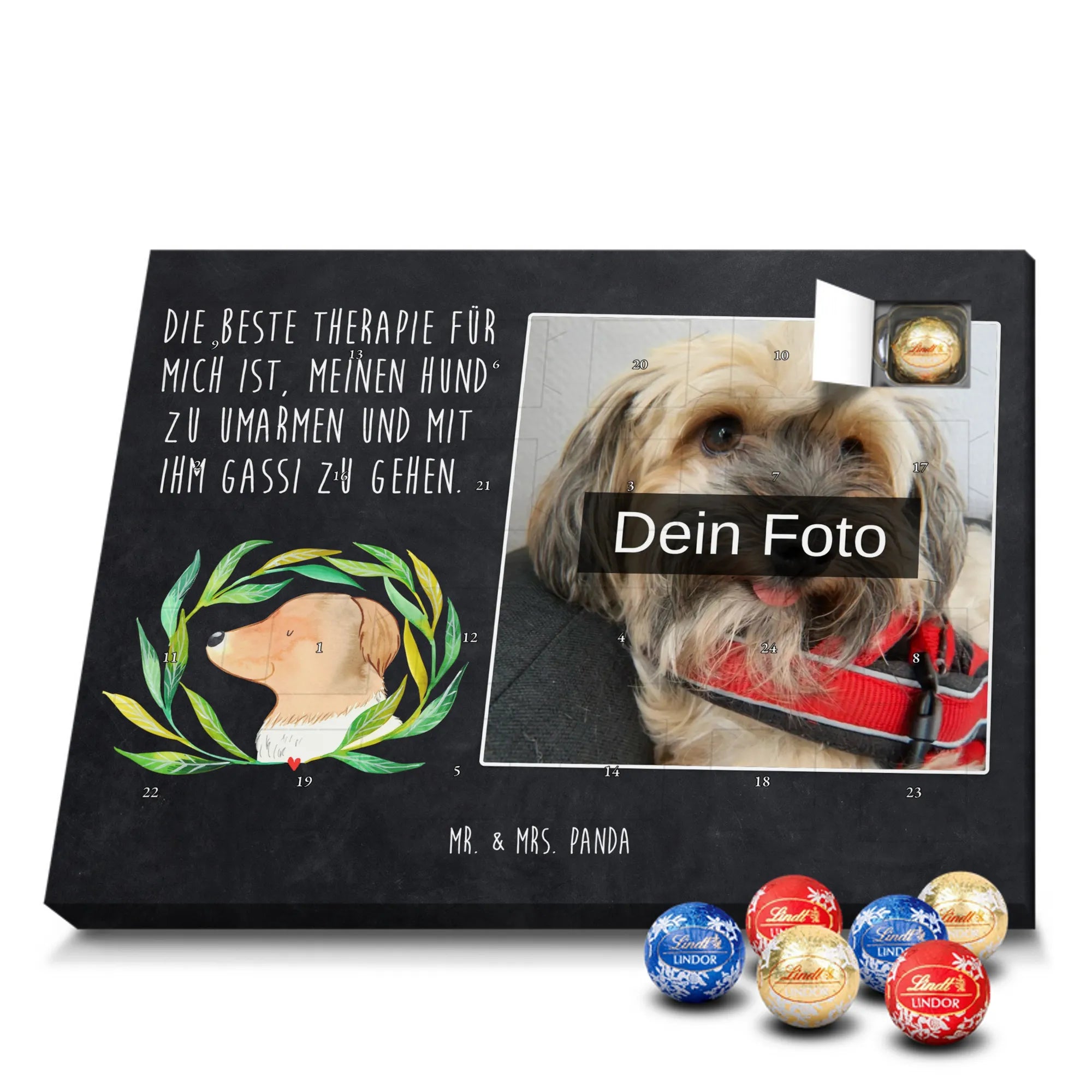 Entdecke unseren charmanten Personalisierter Schoko-Foto Adventskalender von Mr. & Mrs. Panda – ein liebevolles Geschenk für Freunde, Familie oder dich selbst. Aufdrucke mit süßen Motiven und herzlichen Sprüchen begleiten dein persönliches Foto, das du individuell hochlädst. Achte bitte auf eine ausreichende Auflösung des Bildes und einen passenden Bildausschnitt, damit das Druckbild klar bleibt. Wir weisen darauf hin, dass Fotos nicht nachbearbeitet oder zugeschnitten werden; achte daher auf Bildrechte und Zustimmung der abgebildeten Personen. Die Verarbeitung überzeugt durch eine seidenmatte Oberflächenveredelung und bedruckte Seitenflächen; dadurch wirkt der Kalender sehr hochwertig. Der Kalender ist vielseitig: Du kannst ihn sowohl aufstellen als auch aufhängen. Maße: 233 mm x 178 mm x 24 mm. Gefüllt mit Lindt Lindor Markenschokolade – 24 einzeln verpackte Markenschokoladen Kugeln in den Geschmacksrichtungen Vollmilch, Feinherb und Weiße Schokolade. Zutaten und Allergene sind auf der Verpackung angegeben; es kann Spuren von Haselnüssen und Mandeln geben. Hinweis: Personalisierte Foto-Artikel sind vom Umtausch ausgeschlossen.