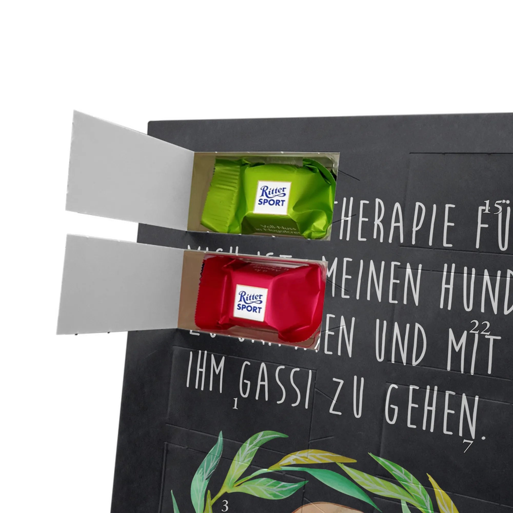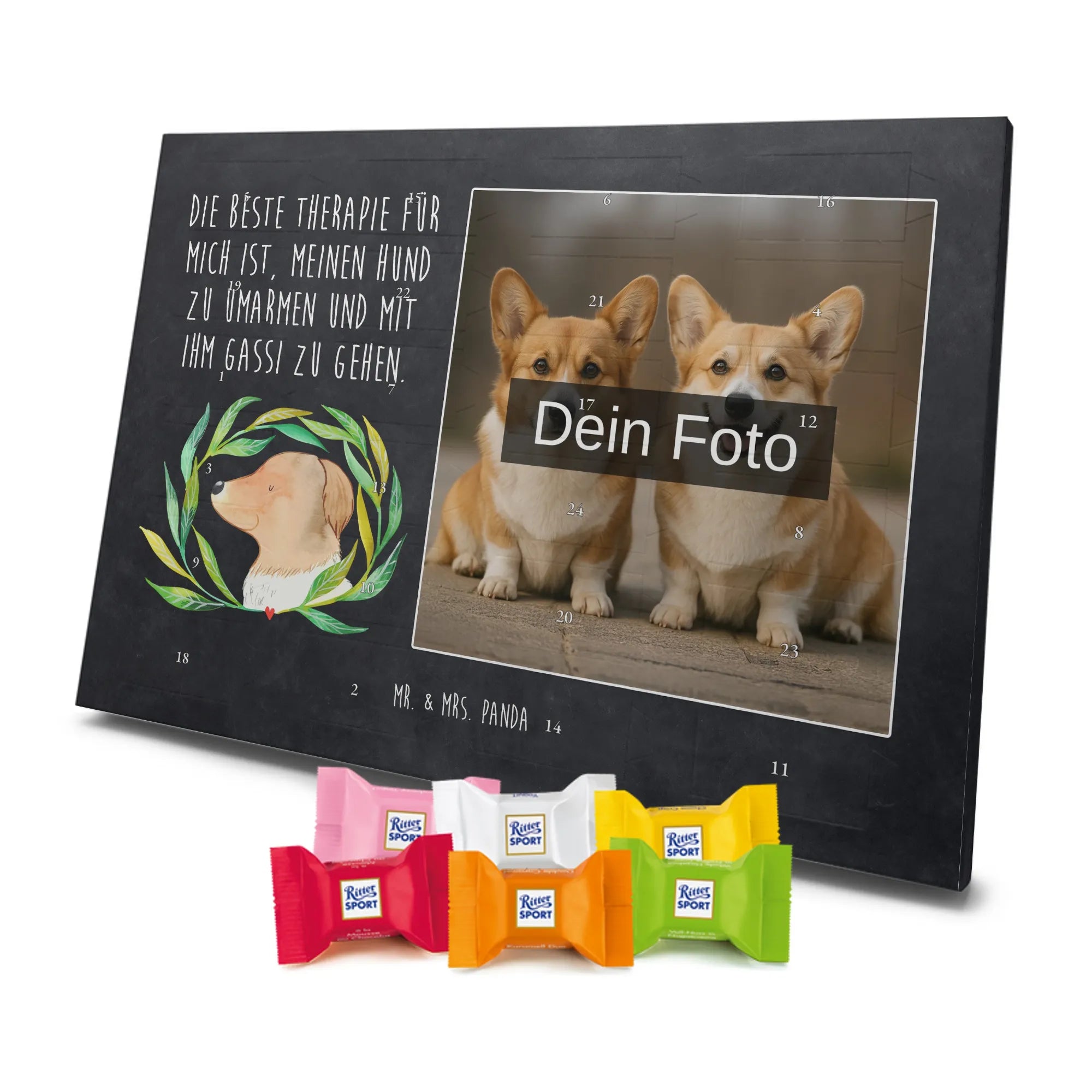 Personalisiertes Schoko-Foto Adventskalender von Mr. & Mrs. Panda – zaubere ein Lächeln in die Adventszeit mit einem persönlichen Foto und unseren liebevollen Motiven & Sprüchen. Der Kalender ist hochwertig bedruckt, verfügt über seidenmatte Oberflächenveredelung und bedruckte Seitenflächen für ein besonders schönes Erscheinungsbild. Bitte lade ein Foto in hoher Auflösung hoch und achte auf den richtigen Bildausschnitt, damit wichtige Details nicht verloren gehen. Verwende nur Bilder, bei denen du die Rechte besitzt; Fotos werden weder aufbereitet noch zugeschnitten und personalisierte Foto Artikel sind vom Umtausch ausgeschlossen. Maße: 325 mm x 225 mm x 27 mm. Besonderheit: Der Adventskalender kann aufgehängt oder aufgestellt werden – ganz flexibel. Gefüllt ist er mit Ritter Sport Schokowürfeln in köstlichen Geschmacksrichtungen wie Mousse au Chocolat, Schoko Crisp, Voll-Nuss in Nougatcreme, Karamell Duo, Joghurt und Erdbeer-Joghurt. Ein persönliches, süßes Geschenk, das hochwertige Optik mit täglichem Genuss verbindet und die Vorfreude auf Weihnachten jeden Tag steigert.