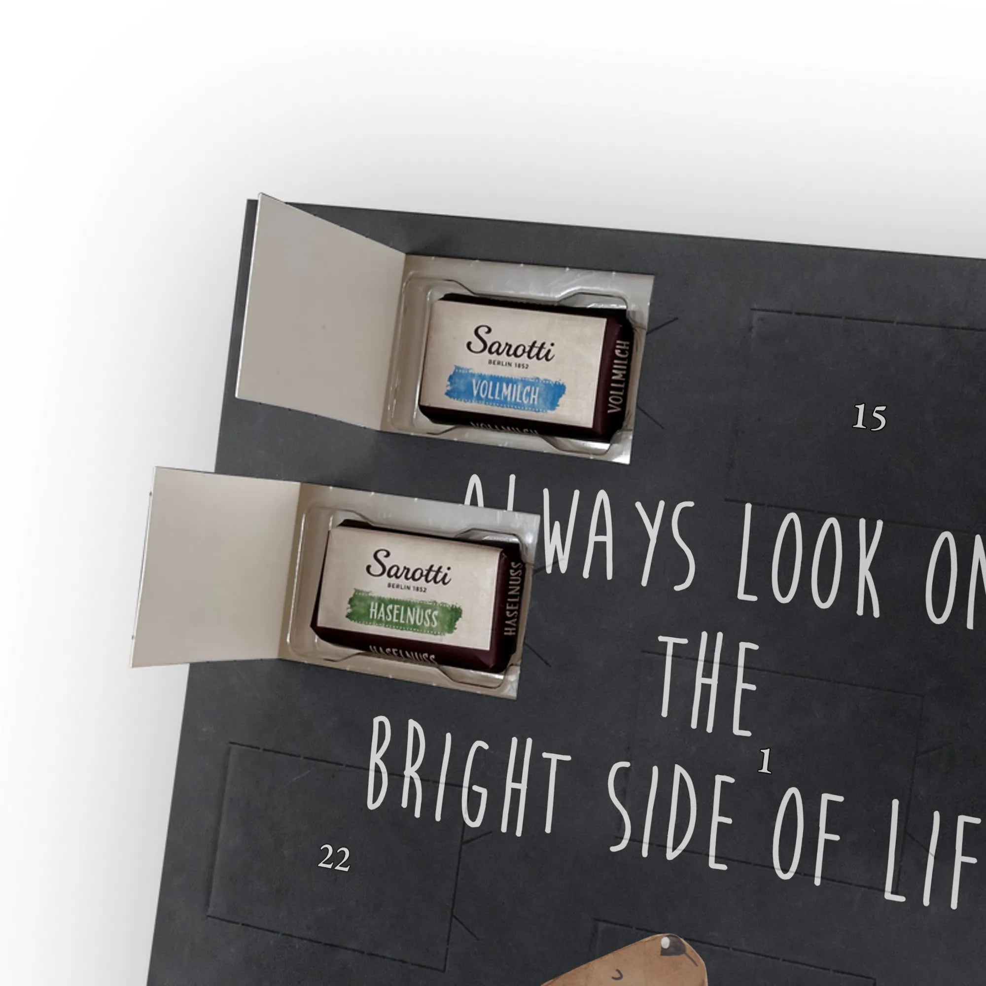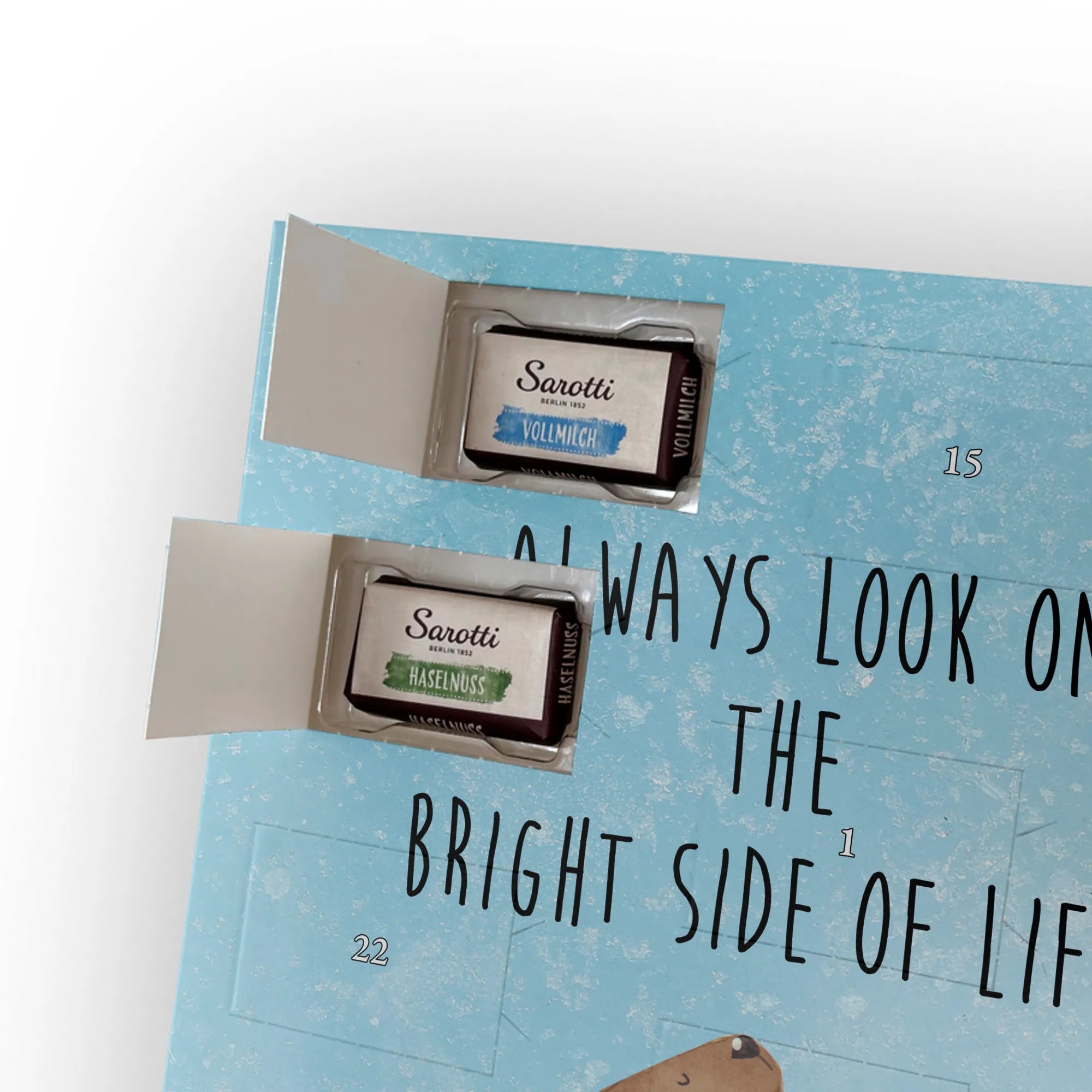 Personalisierter Schoko-Adventskalender mit Foto – das kleine Weihnachtswunder von Mr. & Mrs. Panda! Verschenke jeden Tag Vorfreude: Der Kalender ist liebevoll gestaltet mit unseren herzlichen Illustrationen und Sprüchen, während dein Foto die persönliche Mitte bildet. Bitte lade ein hochauflösendes Foto hoch und prüfe den Bildausschnitt, damit nichts Wichtiges verloren geht. Nutze nur Bilder, für die du die Rechte hast. Die hochwertige, seidenmatte Veredelung und die bedruckten Seitenflächen garantieren ein edles Erscheinungsbild. Maße: 355 mm x 245 mm x 11 mm; lässt sich sowohl aufhängen als auch aufstellen. Achtung: Fotos werden nicht nachbearbeitet oder zugeschnitten; personalisierte Artikel sind vom Rückgaberecht ausgeschlossen. Gefüllt mit 24 einzeln verpackten Schokoladentäfelchen aus den vier Geschmacksrichtungen Vollmilch, Nougat, Zartbitter und Haselnuss – von Sarotti® und Confiserie Heidel®. Insgesamt enthält der Kalender 107 g Markenschokolade. Ein persönliches Geschenk mit süßem Inhalt, ideal für Partner, Familie und Freunde, verpackt mit der typischen Mr. & Mrs. Panda Liebe zum Detail.