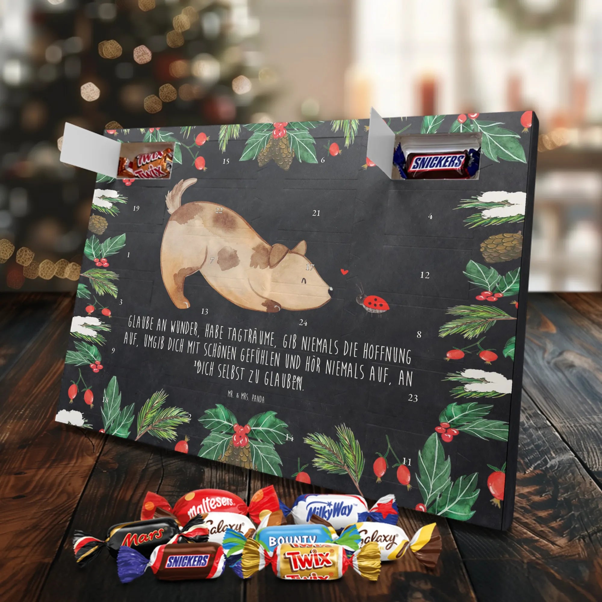 Unser Schoko Adventskalender von Mr. & Mrs. Panda bringt dir und deinen Lieben jede Menge Vorfreude und zauberhafte Momente in die Adventszeit. Der Kalender ist liebevoll bedruckt mit wunderschönen Motiven und frechen Sprüchen im typischen Mr. & Mrs. Panda Stil – ein echter Blickfang auf dem Tisch oder an der Wand. Die brillante Druckqualität kombiniert mit einer seidenmatten Oberflächenveredelung sorgt für edle Farben und ein angenehmes Gefühl beim Anfassen. Auch die Seitenflächen sind bedruckt, sodass der Kalender von allen Seiten hübsch aussieht. Er ist nicht personalisierbar, dafür aber in seiner Gestaltung rundum stimmig. Gefüllt ist der Adventskalender mit 24 hochwertigen Celebrations-Füllungen in acht verschiedenen Sorten: Maltesers, Mars, Snickers, Twix, Milky Way, Bounty, Galaxy und Galaxy Caramel — so ist für jede Naschkatze etwas dabei. Die Besonderheit: Du kannst den Kalender entweder aufstellen oder dank rückseitiger Aufhängung an die Wand hängen. Maße: 325 mm x 225 mm x 27 mm. Ein liebevolles Geschenk für Familie, Freunde oder einfach für dich selbst, das kleine tägliche Glücksmomente schenkt und die Adventszeit versüßt.