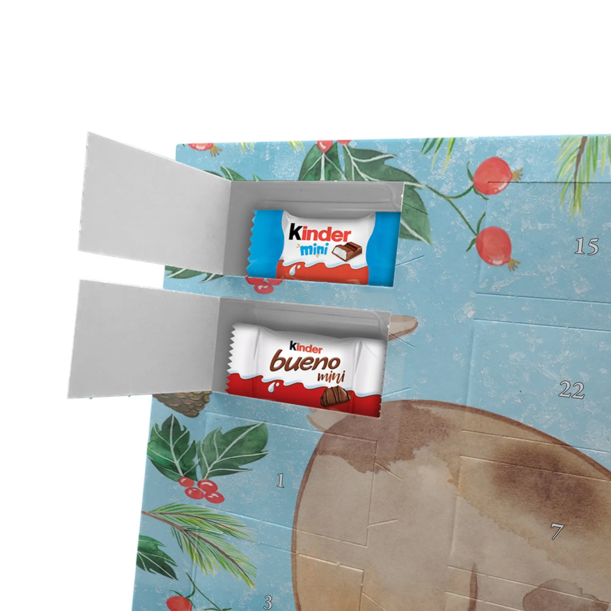 Adventskalender mit Schokolade – liebevoll gestaltet von Mr. & Mrs. Panda. Dieser niedliche Kalender ist bedruckt mit wunderschönen Motiven & Sprüchen von Mr. & Mrs. Panda und trotzdem nicht personalisierbar. Du bekommst brillante Druckqualität mit seidenmatter Oberflächenveredelung sowie bedruckte Seitenflächen, die dem Kalender ein hochwertiges Finish verleihen. Maße: 355 mm x 245 mm x 11 mm. Ein tolles Extra: kann aufgehängt oder aufgestellt werden, sodass du ihn flexibel platzieren kannst. Gefüllt mit Markenname Schokolade: Adventskalender gefüllt mit kinder® Schokolade. Inhalt: kinder® Schoko-Bons, kinder® Bueno mini und kinder® Schokolade mini. Die 24 Türchen sind liebevoll befüllt und sorgen jeden Tag für ein Lächeln – ideal für Kinder, Paare oder als kleines Geschenk für Freunde. Robust und dekorativ zugleich, bringt dieser Adventskalender süße Vorfreude in dein Zuhause. Verschenke oder genieße eine adventliche Zeit voller kleiner, schokoladiger Überraschungen!