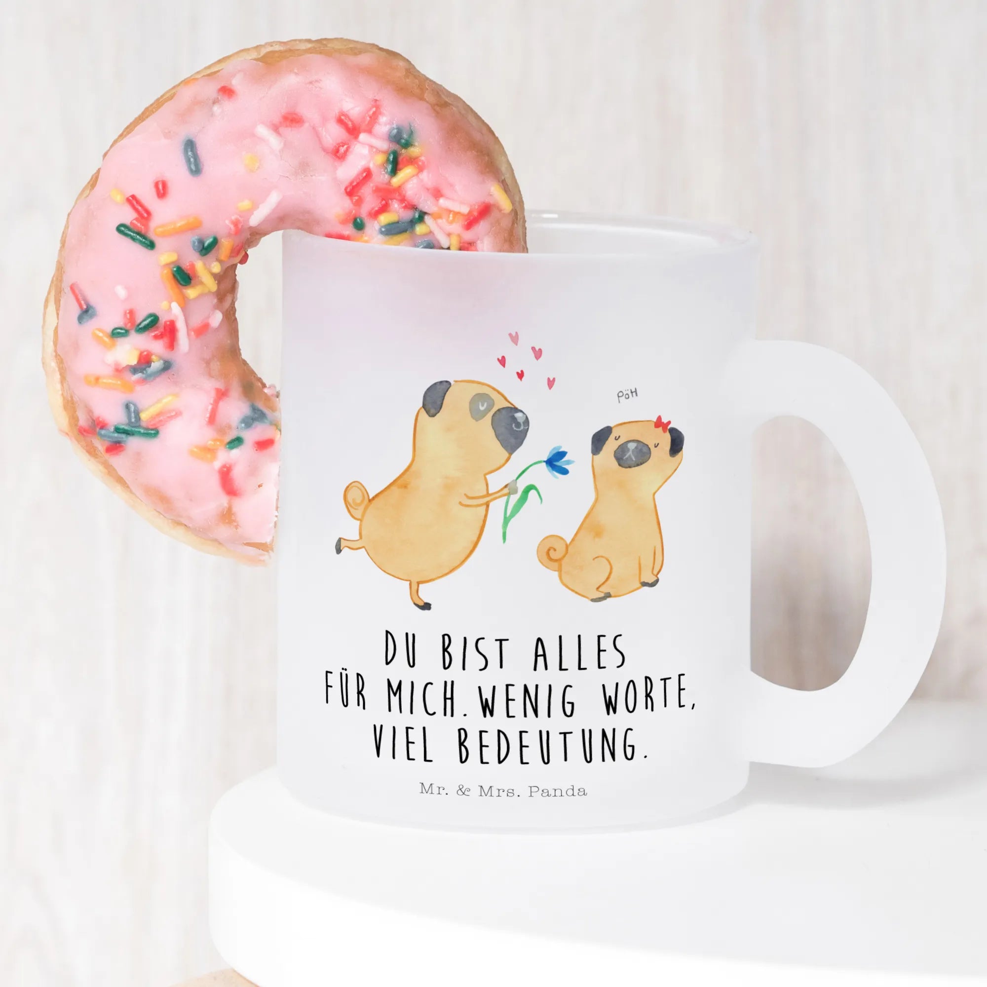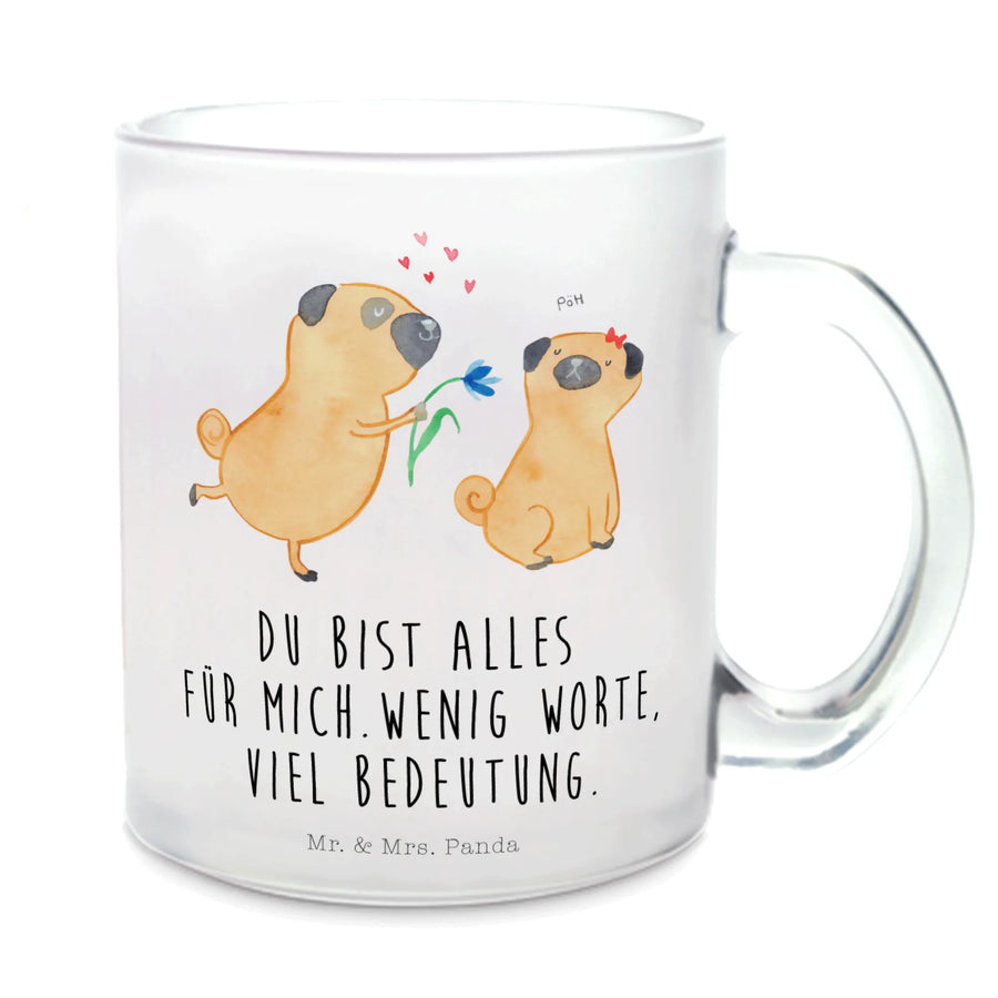 Sie zeigt zwei niedliche Möpse, die verliebt zusammenstehen, mit einer Blume, die einer der beiden dem anderen überreicht. Der Slogan "Du bist alles für mich. Wenig Worte, viel Bedeutung" mag zwar nicht auf dieser Tasse stehen, doch die Botschaft von Liebe und Zuneigung ist klar.